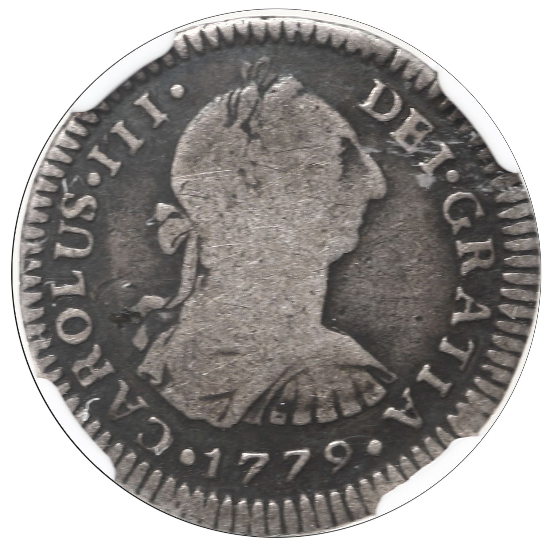 Guatemala, bust 1 real, Charles III, 1779 P, rare, NGC VG 8, finest and only example in NGC census. JP-1R44; KM-33.2; Cal-335. Nicely, evenly circulated example of this rare date featuring deep circulation cameo contrast against the lighter high points. Please use this link to verify the certification number