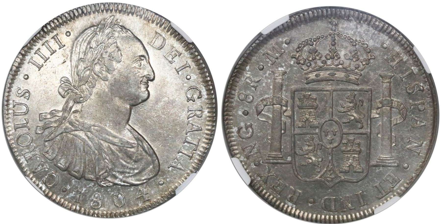 Guatemala, bust 8 reales, Charles IV, 1804M, encapsulated NGC MS 62, ex-Richard Stuart (stated inside slab). CT-635; KM-53. Nice luster with incipient rainbow toning, faint surface hairlines on obverse only, second finest known in NGC census. NGC #4427827-005. Pedigreed to the Richard Stuart collection.