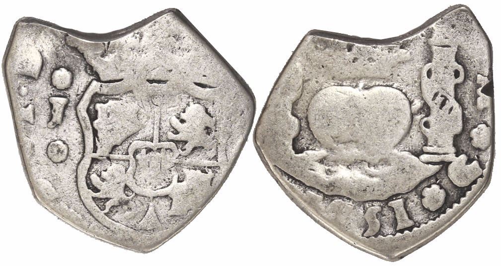 Guatemala, cob 2 reales, 1751J. 5.45 grams. Bold date and mintmark and assayer, nearly full shield and pillars-and-globes, About Fine, scarce as unholed.