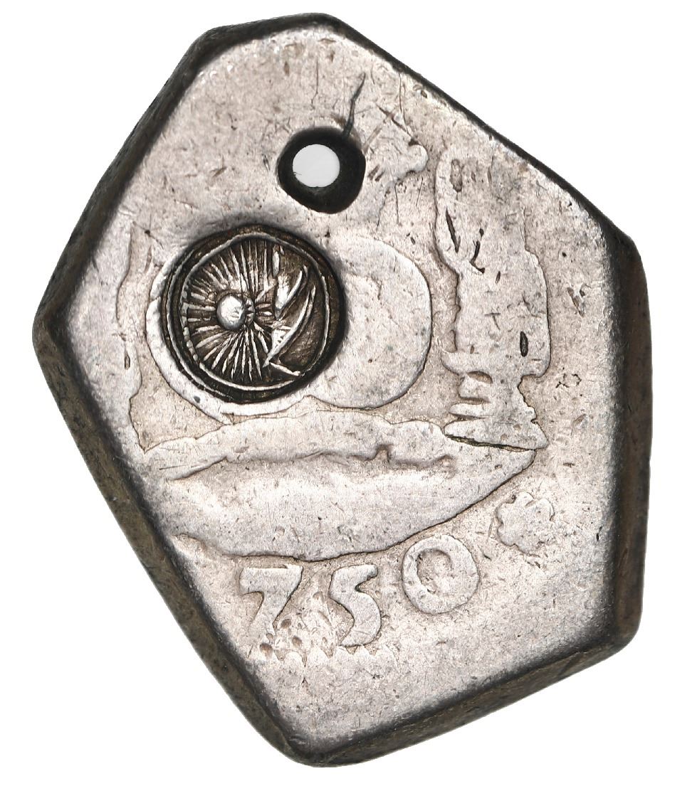 Guatemala, cob 4 reales, (1)750(J), with sun-over-mountains countermark (Type II, 1839) on pillars side. S-G1a; Cal-348; KM-11; JP-4R18. 13.05 grams. Fine/Fair with full 750 of date, very bold full countermark (AU, contemporary counterfeit) with deep toning inside, very scarce date. Pedigreed to the Antigua collection.