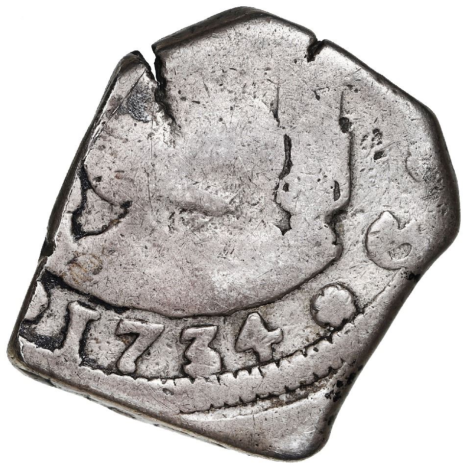 Guatemala, cob 4 reales, 1734J, rare, with sun-over-mountains countermark (Type II, 1839) on shield side. S-G1; Cal-1005; KM-5; JP-4R2. 11.21 grams. Off-center pillars with 100% full date and mintmark, full assayer on other side with very deep and full countermark (XF+) in center, overall VG with minor edge-splits but no hole (very rare thus). Pedigreed the Antigua collection and to the Aureo auction of April 2004 (lot 472).