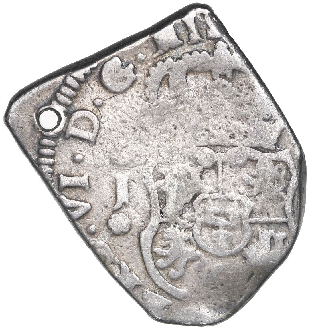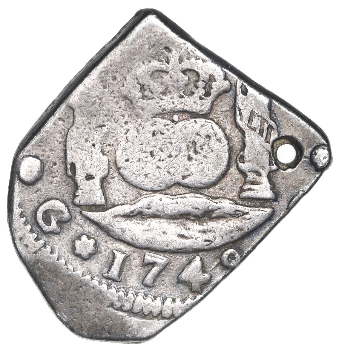 Guatemala, cob 4 reales, 1749J. S-G1a; Cal-347; KM-11; JP-4R17. 13.18 grams. Choice VF/F on a large, squarish flan with hole in one corner, rich old toning, full date (except for bottom of last digit) and left mintmark, full assayer and king's ordinal VI, scarce. Pedigreed to the Antigua collection.