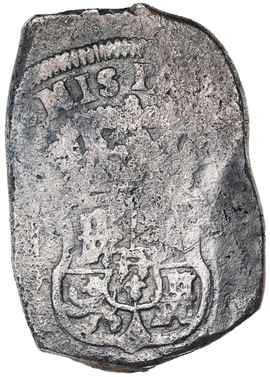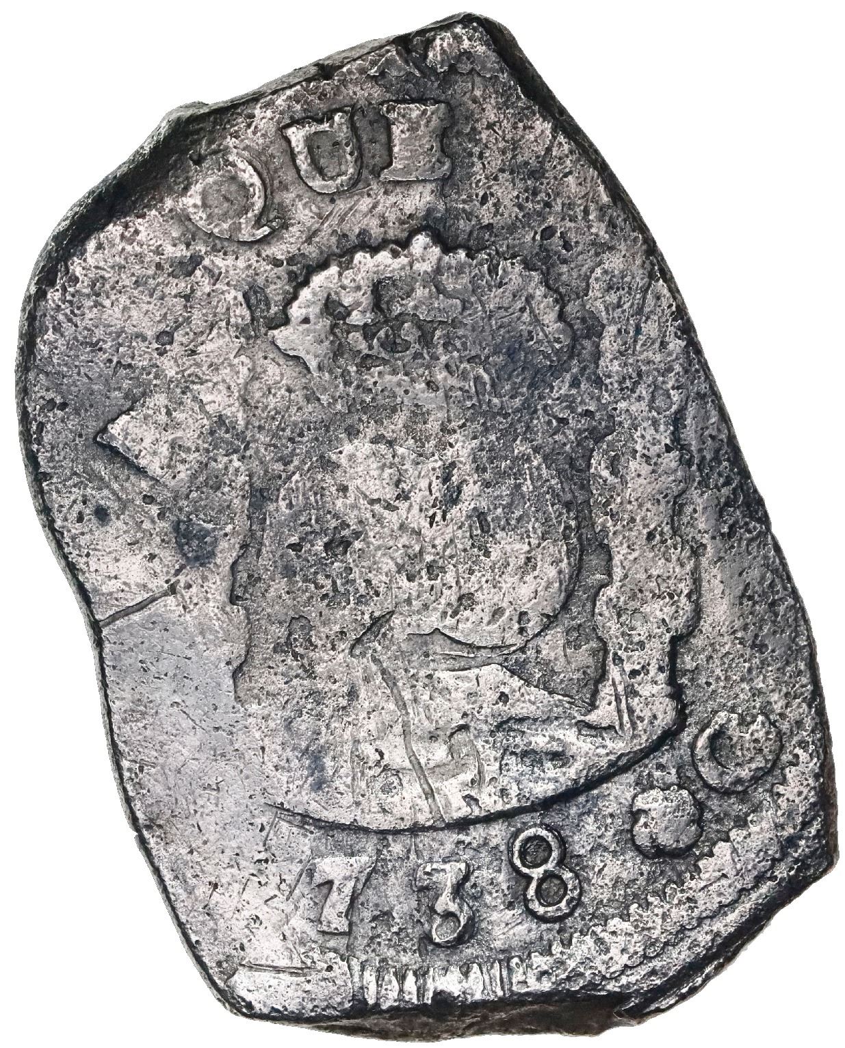 Guatemala, cob 8 reales, (1)738J. S-G1; Cal-1242; KM-6; JP-8R6. 26.08 grams. Big flan with bold full date and mintmark, full but weak inner details, close to VF for actual wear but with a few light marks and light surface corrosion (salvaged like most examples of this date), lightly toned. Pedigreed to the Antigua collection.