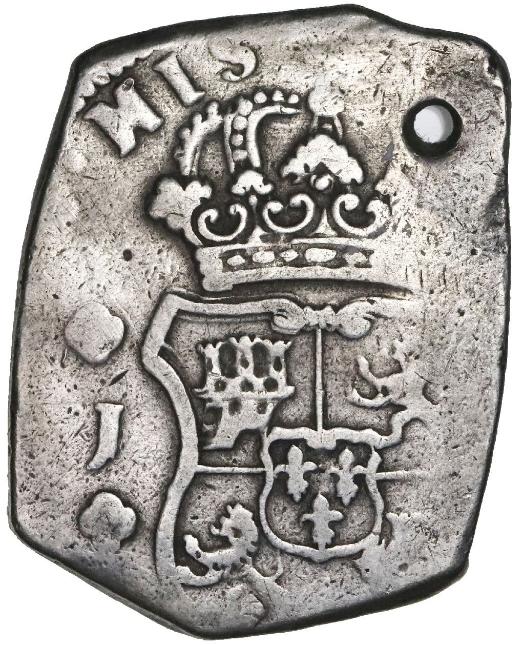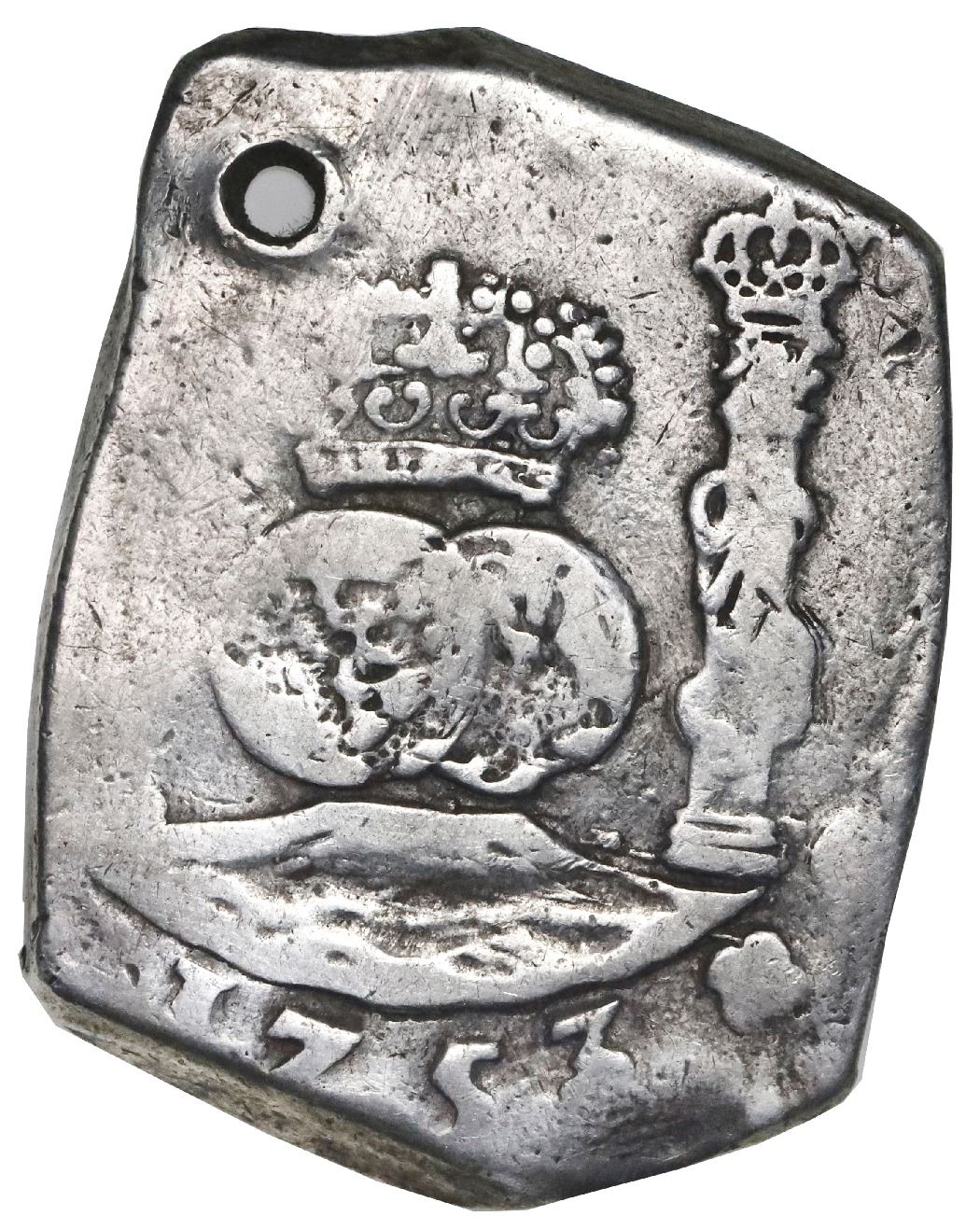 Guatemala, cob 8 reales, 1753J, very rare, with sun-over-mountains countermark (Type II, 1839) on shield side. S-G1a; Cal-427; KM-12; JP-8R21. 26.89 grams. Choice grade (AXF) but neatly holed near edge as usual, with right pillar and both globes 100% full and well defined, full assayer and upper half of date, lightly contrasting toning. Pedigreed to the Antigua collection.
