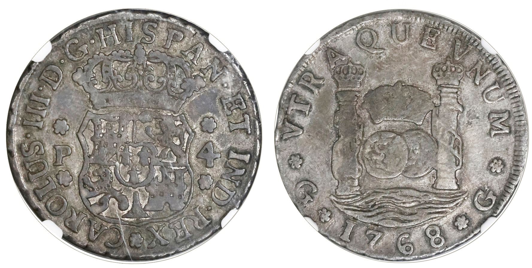 Guatemala, pillar 4 reales, Charles III, 1768P, NGC VF 25, ex-Richard Stuart (stated on label).