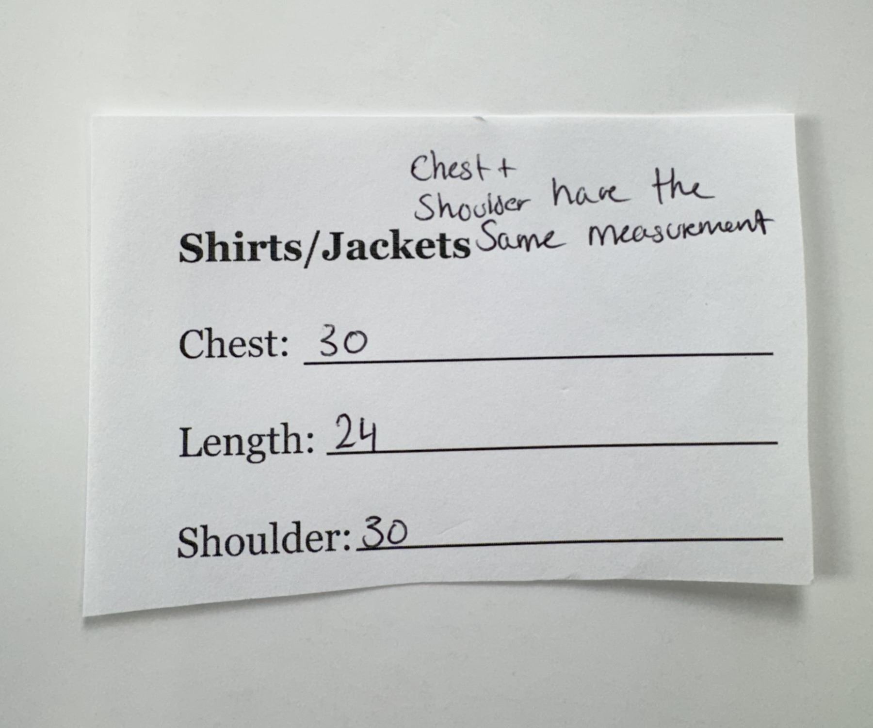 Chest 30", Length 24", Shoulder 30".