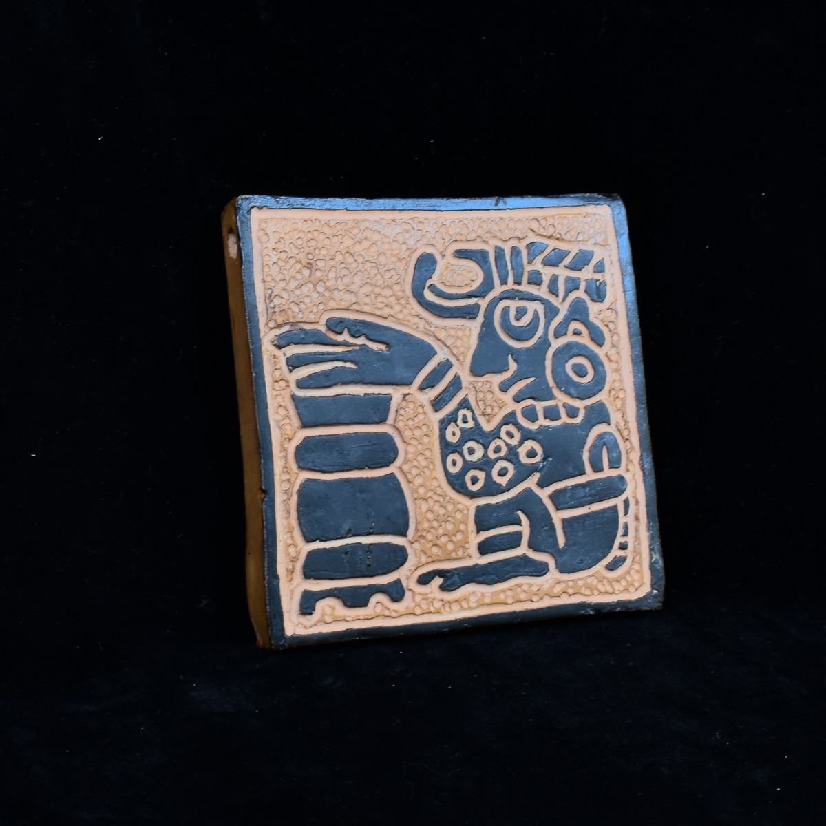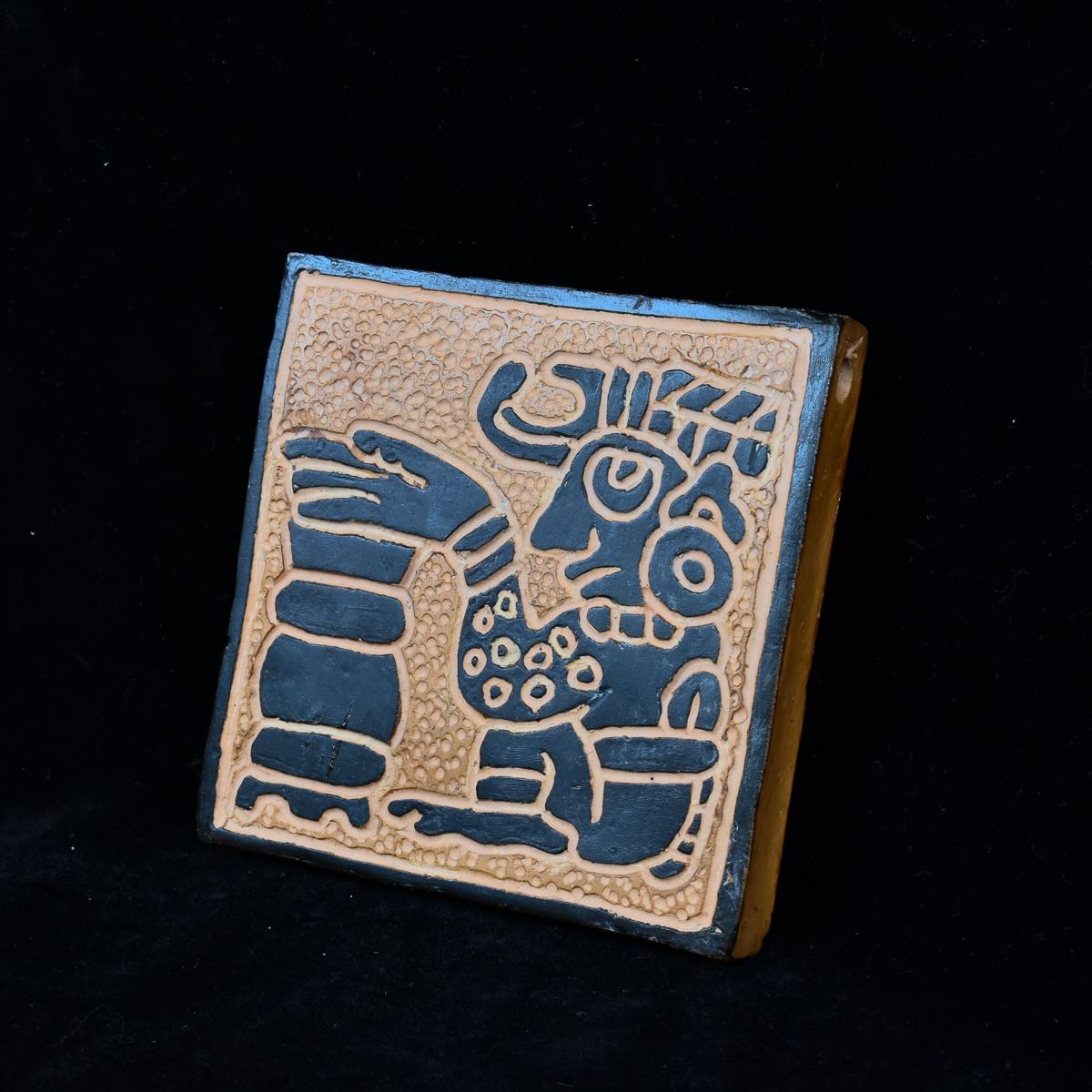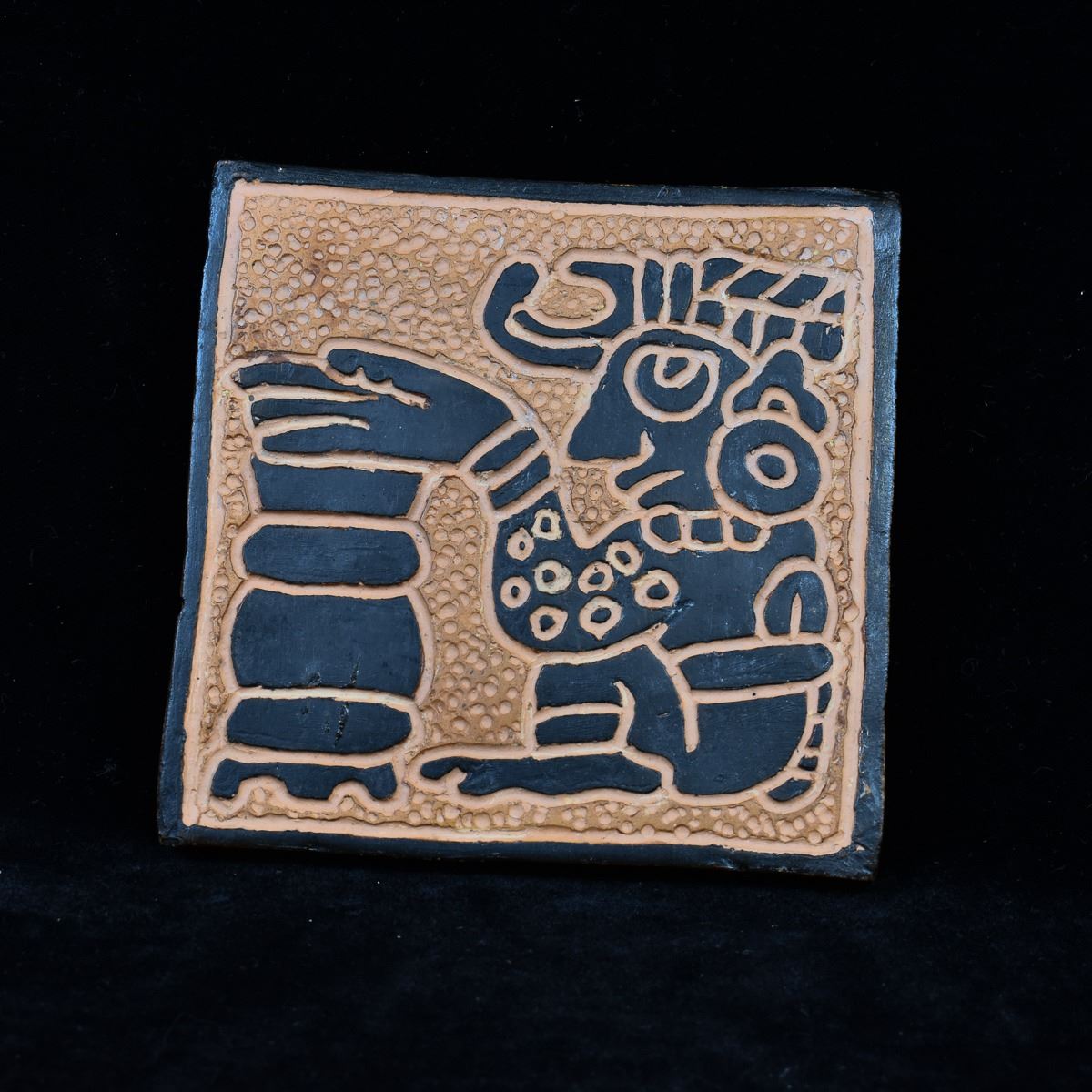 Guatemalan Pottery Tile Trivet, measures 4.5'' x 4.5'' and is marked on the bottom, Mayan design