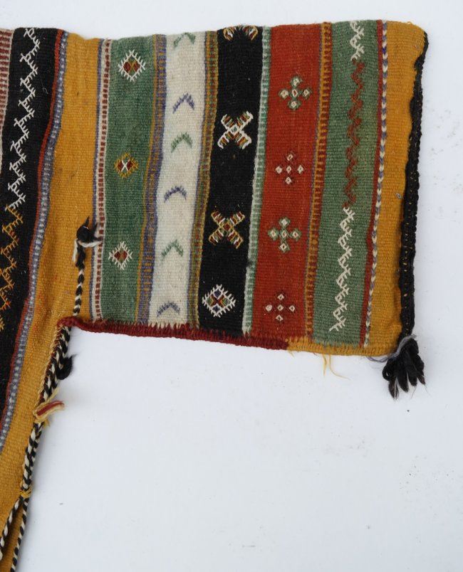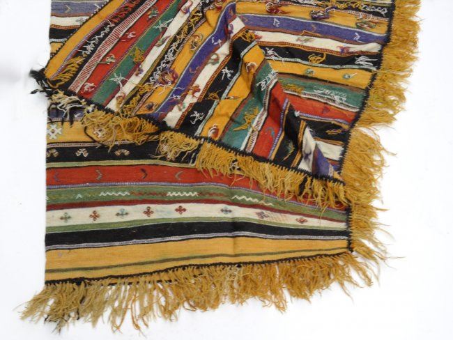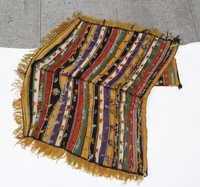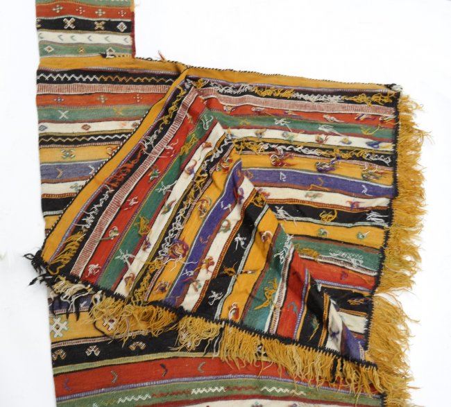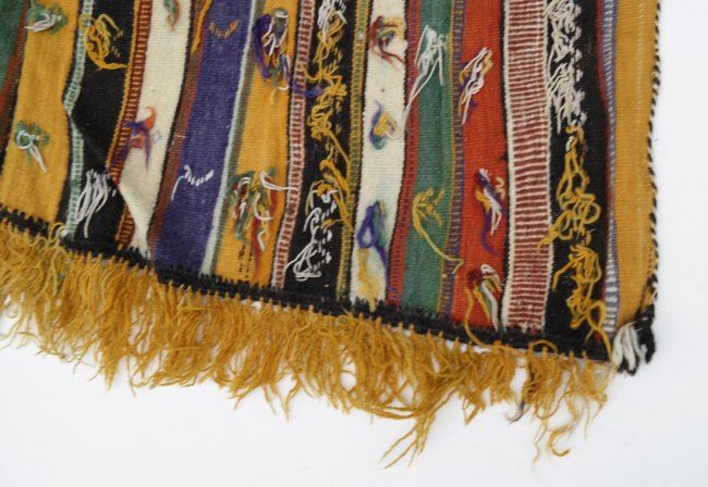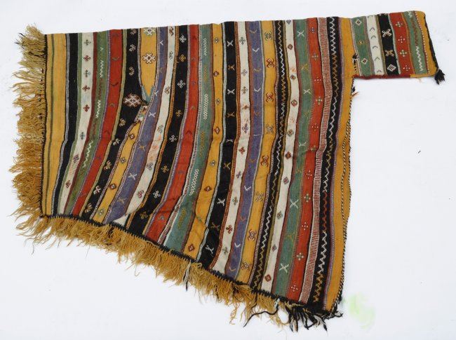 Guatemalan wool poncho with fringe. [44" (at its widest) x 57"]. Stains and lightly soiled.