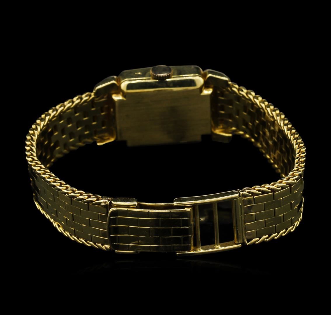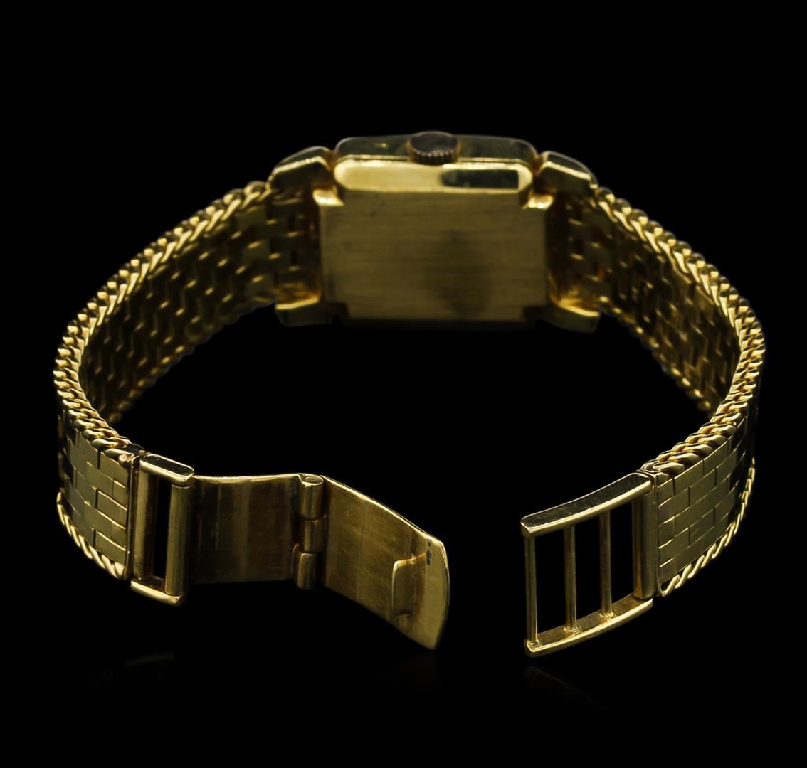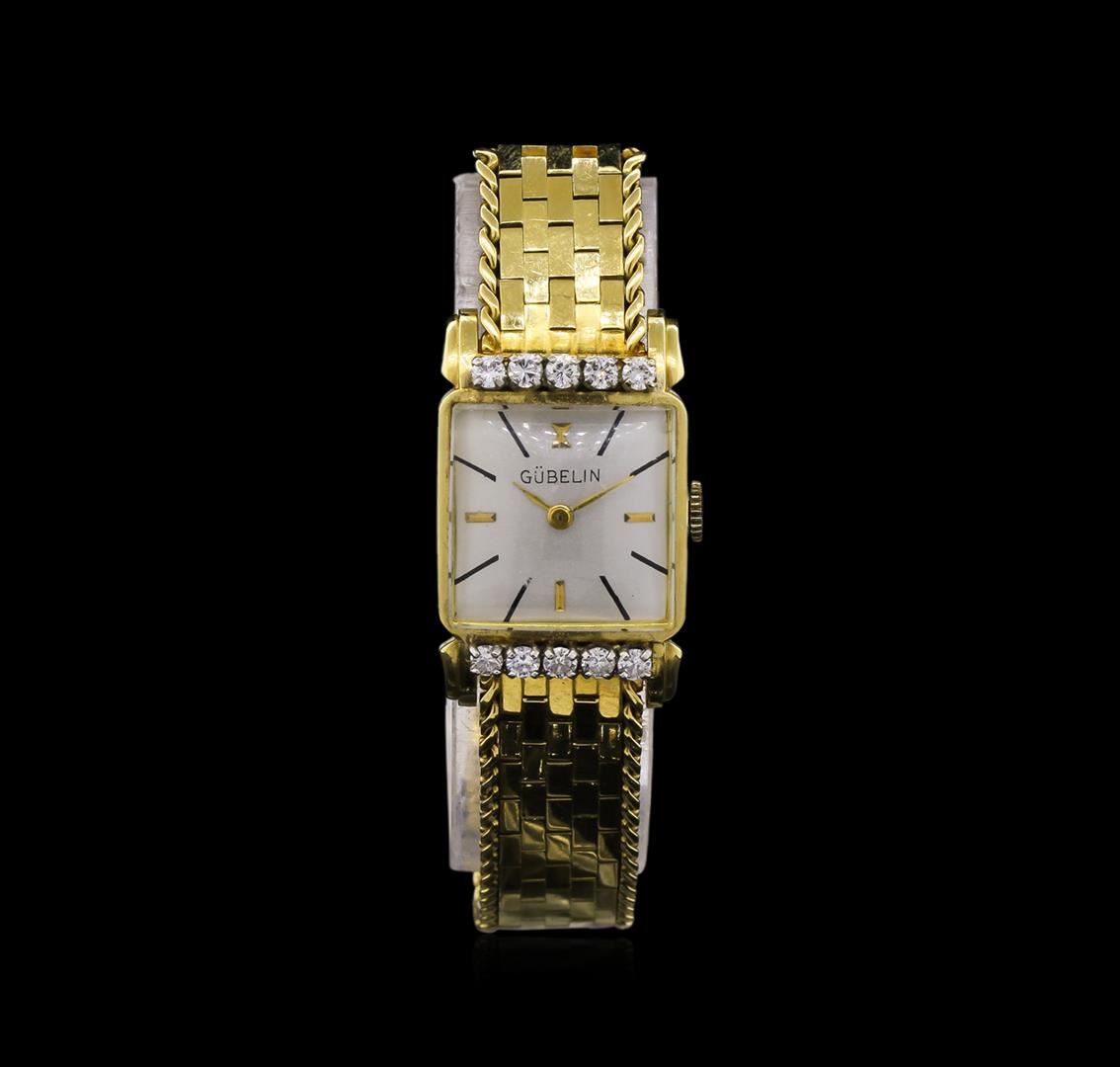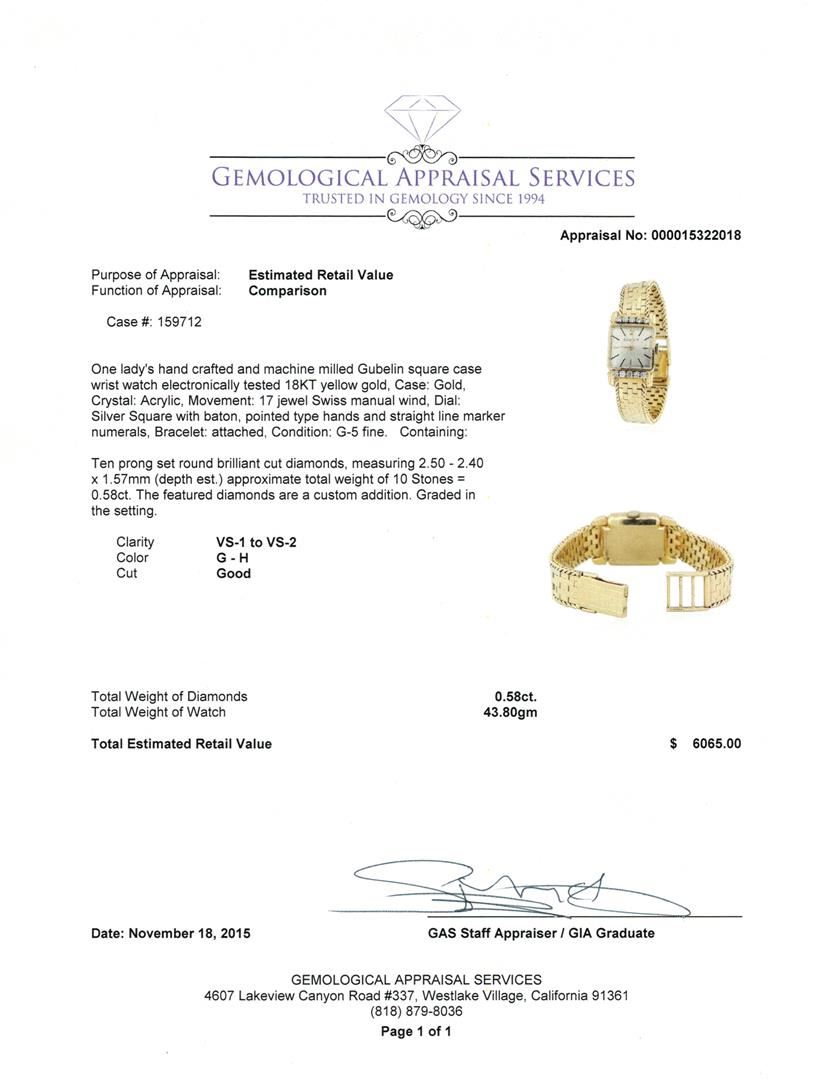 One lady's, hand crafted and machine milled Gubelin square case wrist watch electronically tested 18KT yellow gold, Case: Gold, Crystal: Acrylic, Movement: 17 jewel Swiss manual wind, Dial: Silver Square with baton, pointed type hands and straight line marker numerals, Bracelet: attached, Condition: G-5 fine. Containing: Ten prong set round brilliant cut diamonds, measuring 2.50 - 2.40 x 1.57mm (depth est.) approximate. Total Weight of 10 Stones = 0.58ct. The featured diamonds are a custom addition. Graded in the setting. Clarity: VS-1 to VS-2. Color: G - Good. Total Weight of Diamonds 0.58ct. Total Weight of Watch 43.80gm. GAS Appraised.