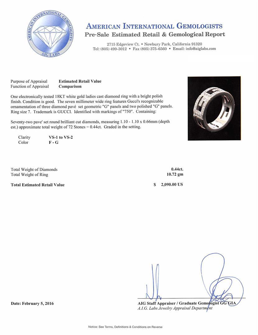One electronically tested 18KT white gold ladies cast diamond ring with a bright polish finish. The seven millimeter wide ring features Gucci's recognizable ornamentation of three diamond pav‚ set geometric "G" panels and two polished "G" panels. Ring size 7. Trademark is GUCCI. Identified with markings of "750". Condition is good. Containing: Seventy-Two pave' set round brilliant cut diamonds, measuring 1.10 - 1.10 x 0.66mm (depth est.) approximate total weight of 72 Stones = 0.44ct. Graded in the setting. Clarity: VS-1 to VS-2. Color: F - G. Total Weight of Diamonds 0.44ct. Total Weight of Ring 10.72gm. AIG Appraised at $2,090.00.