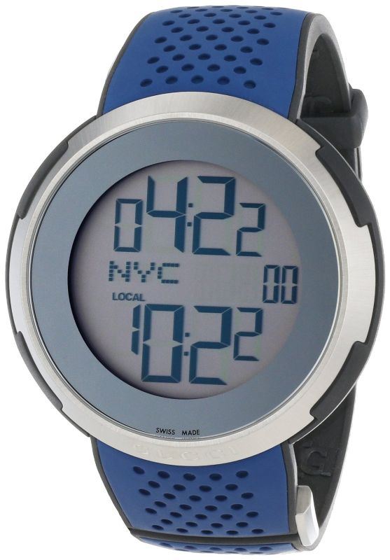 Model: YA114105 - CASE = [Material:Brushed Stainless Steel], [Case Diameter:49], [Case Back:Solid], [Water Resistant:30 Meters/100 Feet], [Crystal:Scratch Resistant Sapphire], DIAL = [Color:Silver], MOVEMENT = [Type:Battery Powered Quartz with Alarm Feature], BAND = [Clasp:Deployment Buckle], [Type:Blue Rubber], (In Stock - Ready to ship.)