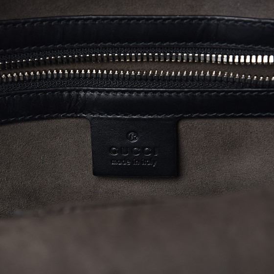 Crafted of signature Gucci nylon Guccissima fabric in black. The bag features 2 exterior zipper pockets, adjustable nylon shoulder straps, and drawstring and flap closure. This opens to a spacious nylon interior with a patch pockets.