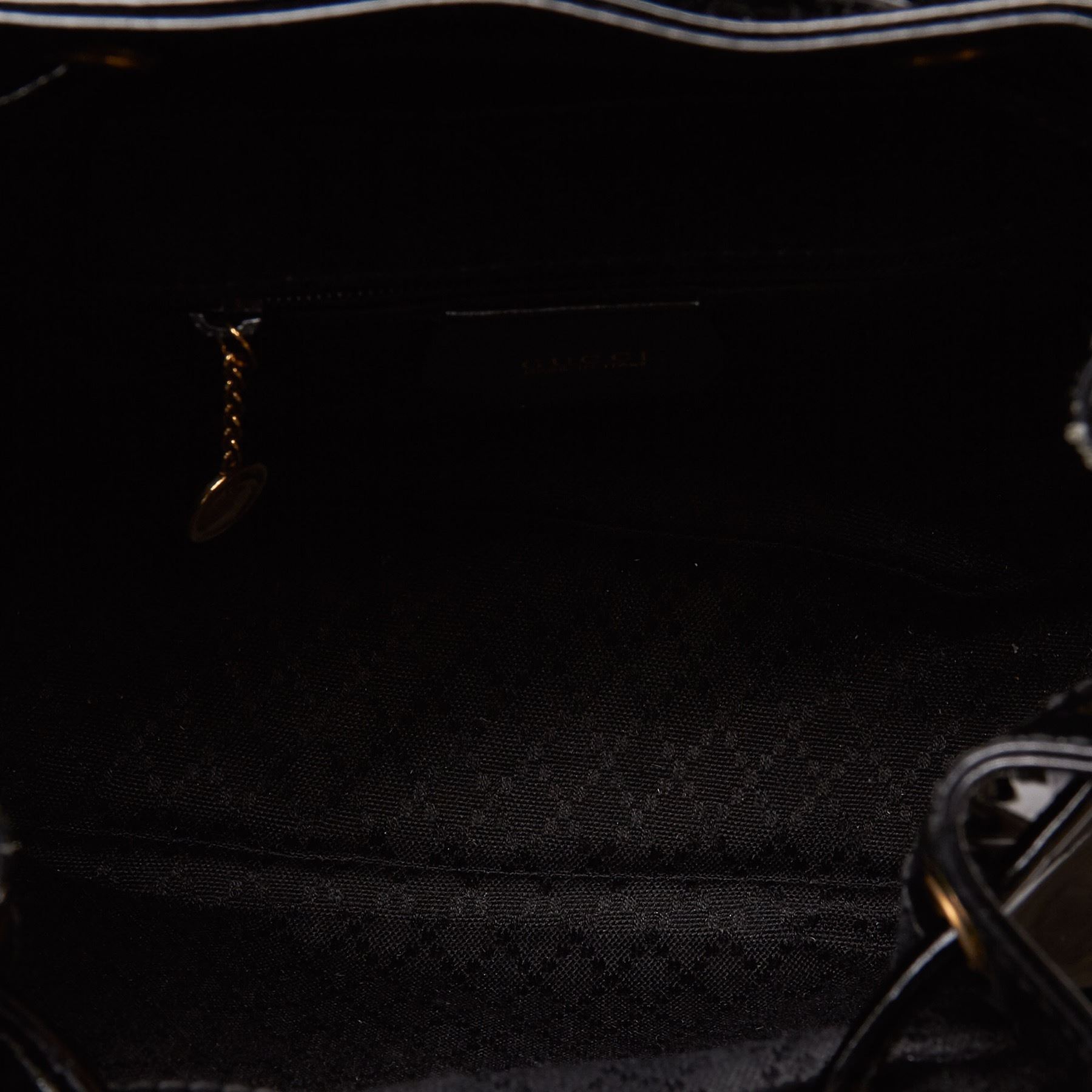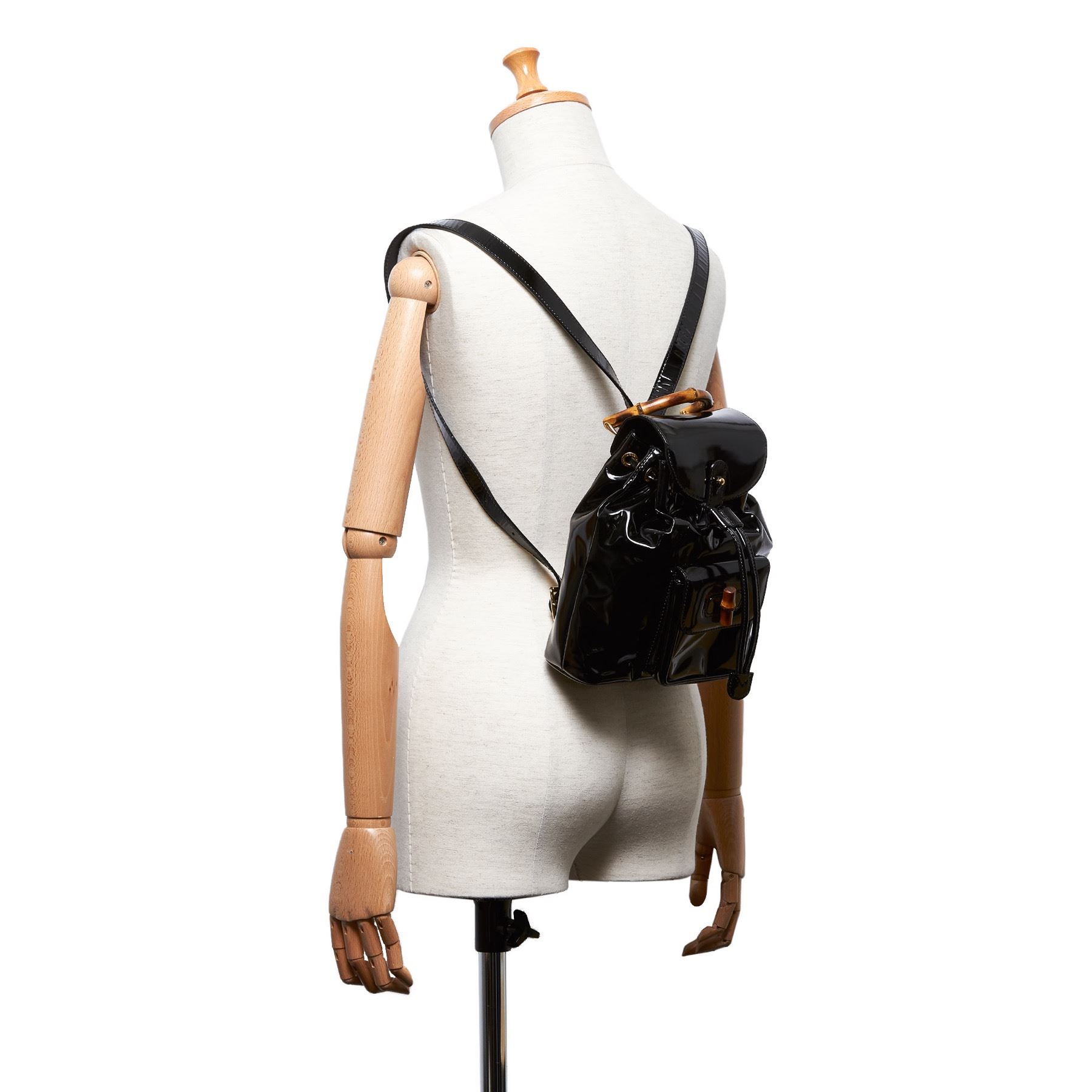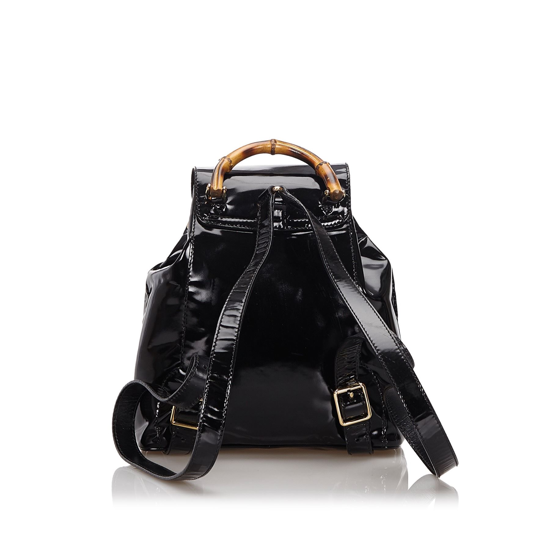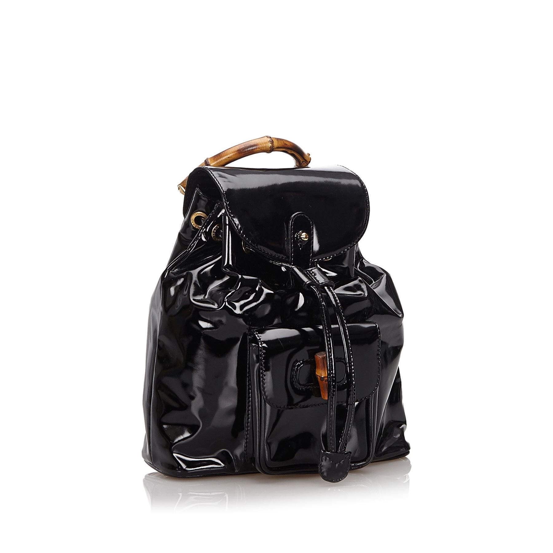 This backpack features a patent leather body, a front exterior flap pocket with bamboo bullet and twist lock closure, flat leather back straps, a bamboo top handle, a top flap, and a drawstring closure. Leather x Patent Leather x Natural Material x Wood Black Exterior front is stained. Exterior back is scratched. Exterior handle is out of shape. Size: 20 x 20 x 7 Card: NO Made in: ITALY