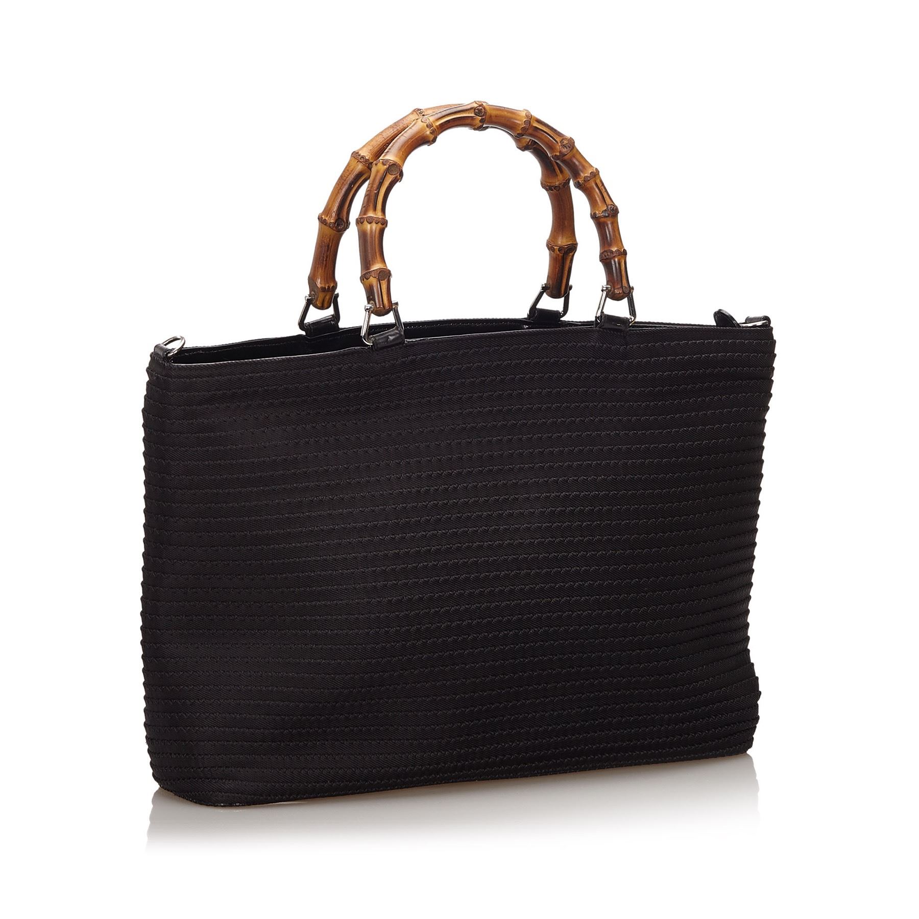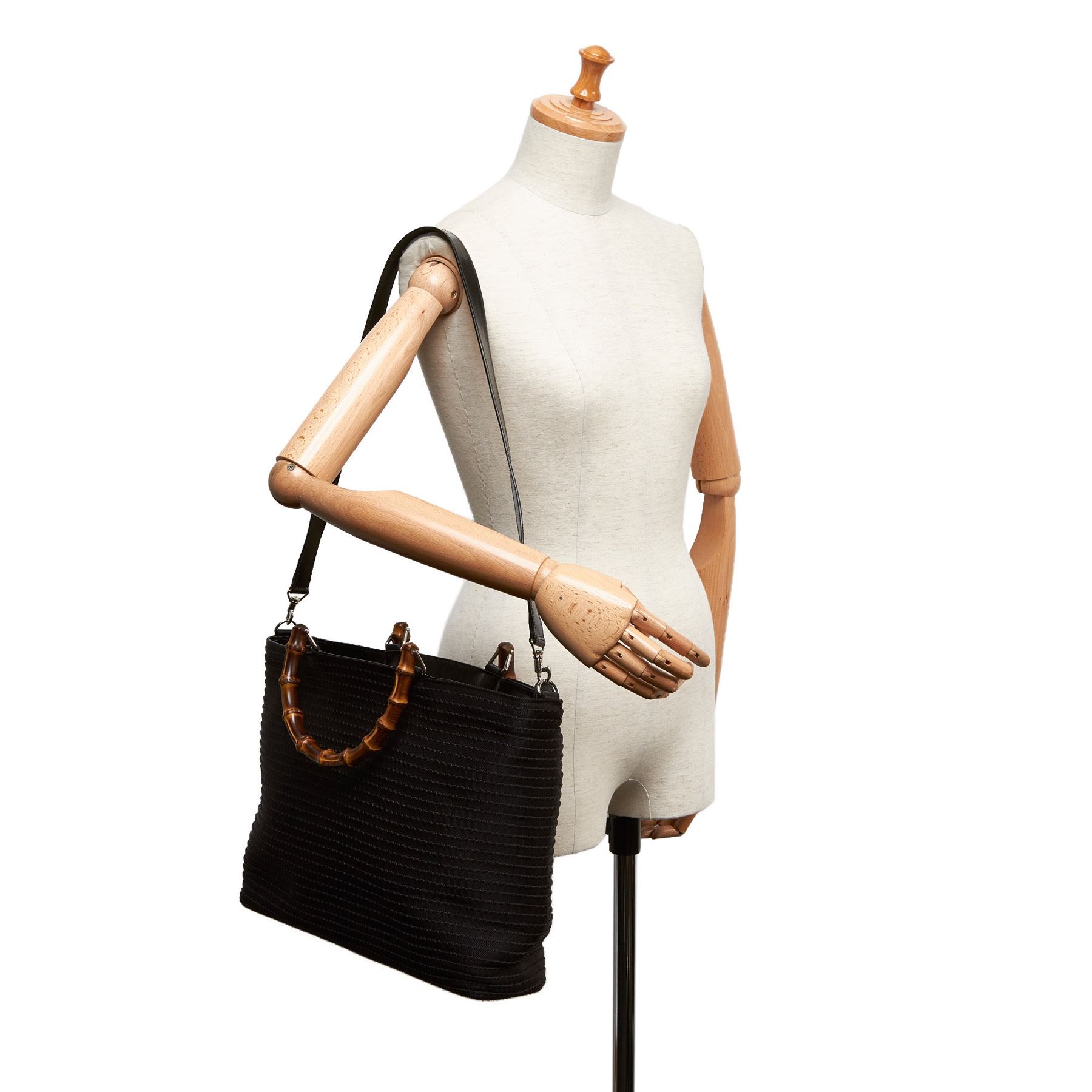 This satchel features a fabric body, bamboo top handles, a detachable flat leather strap, a top zip closure, and an interior zip pocket. Fabric x Chemical Fiber x Natural Material x Wood Black Exterior bottom is scratched. Exterior handle is scratched. Interior lining is stained. Zipper is scratched. Studs is scratched. Size: 29 x 38 x 9 Card: NO Made in: Italy