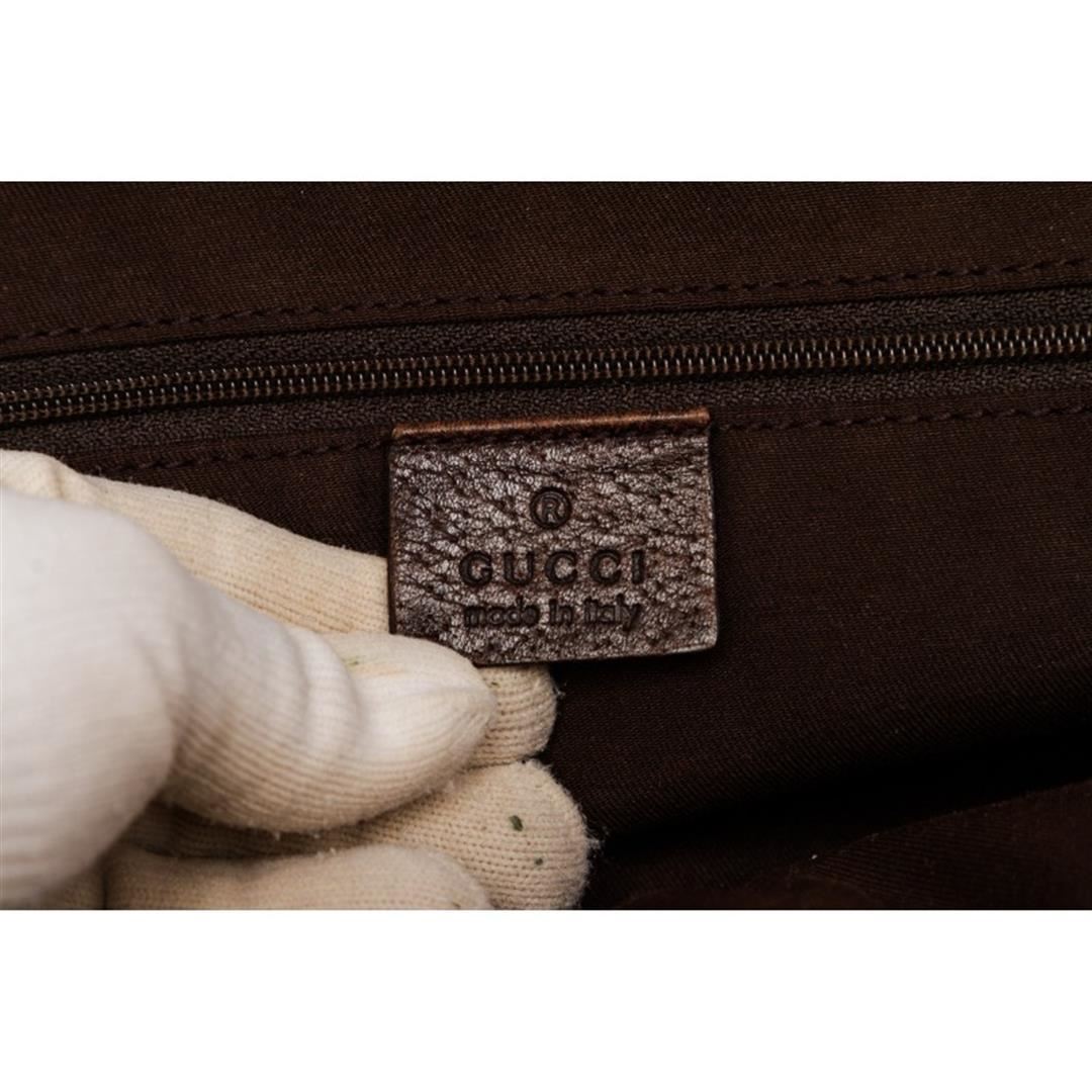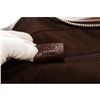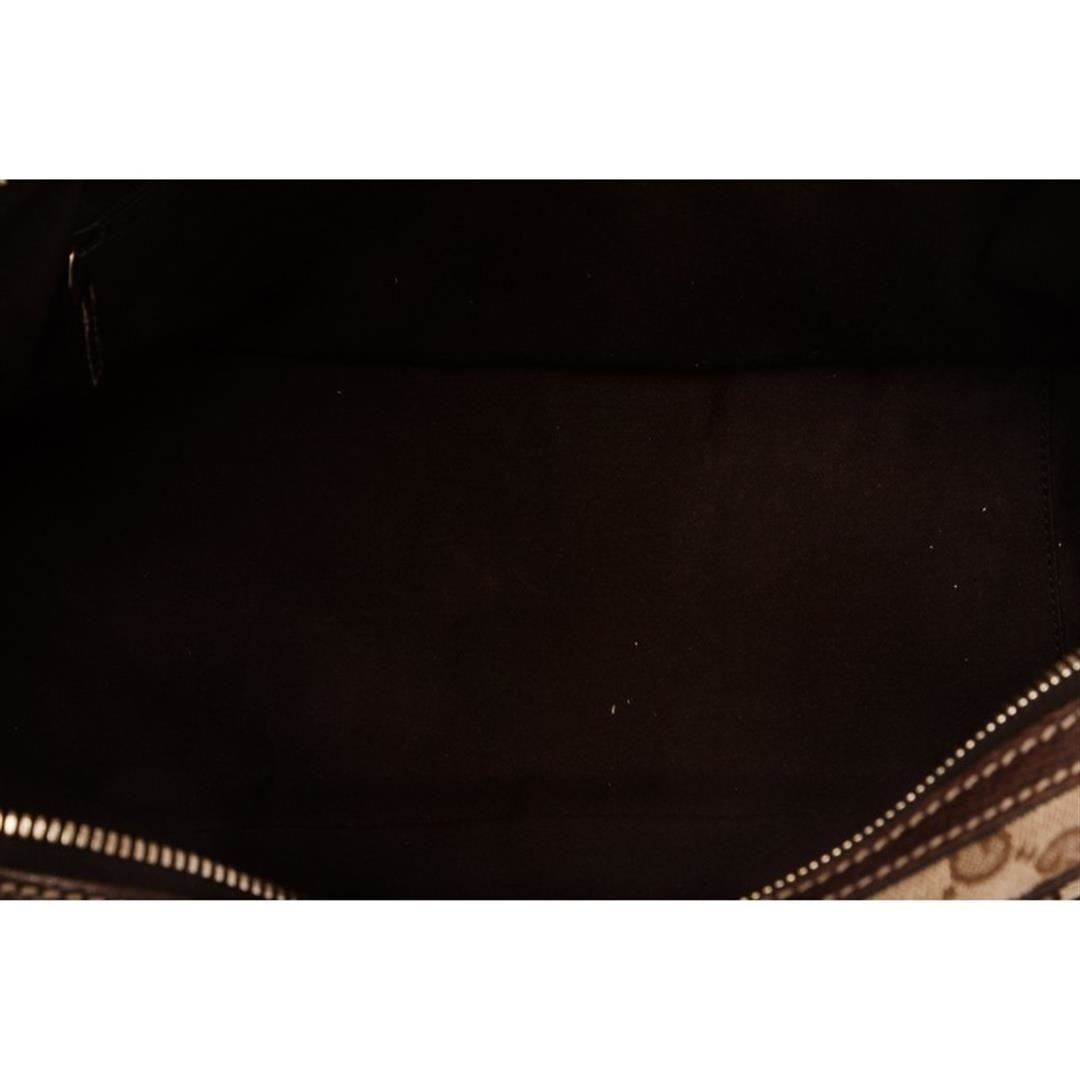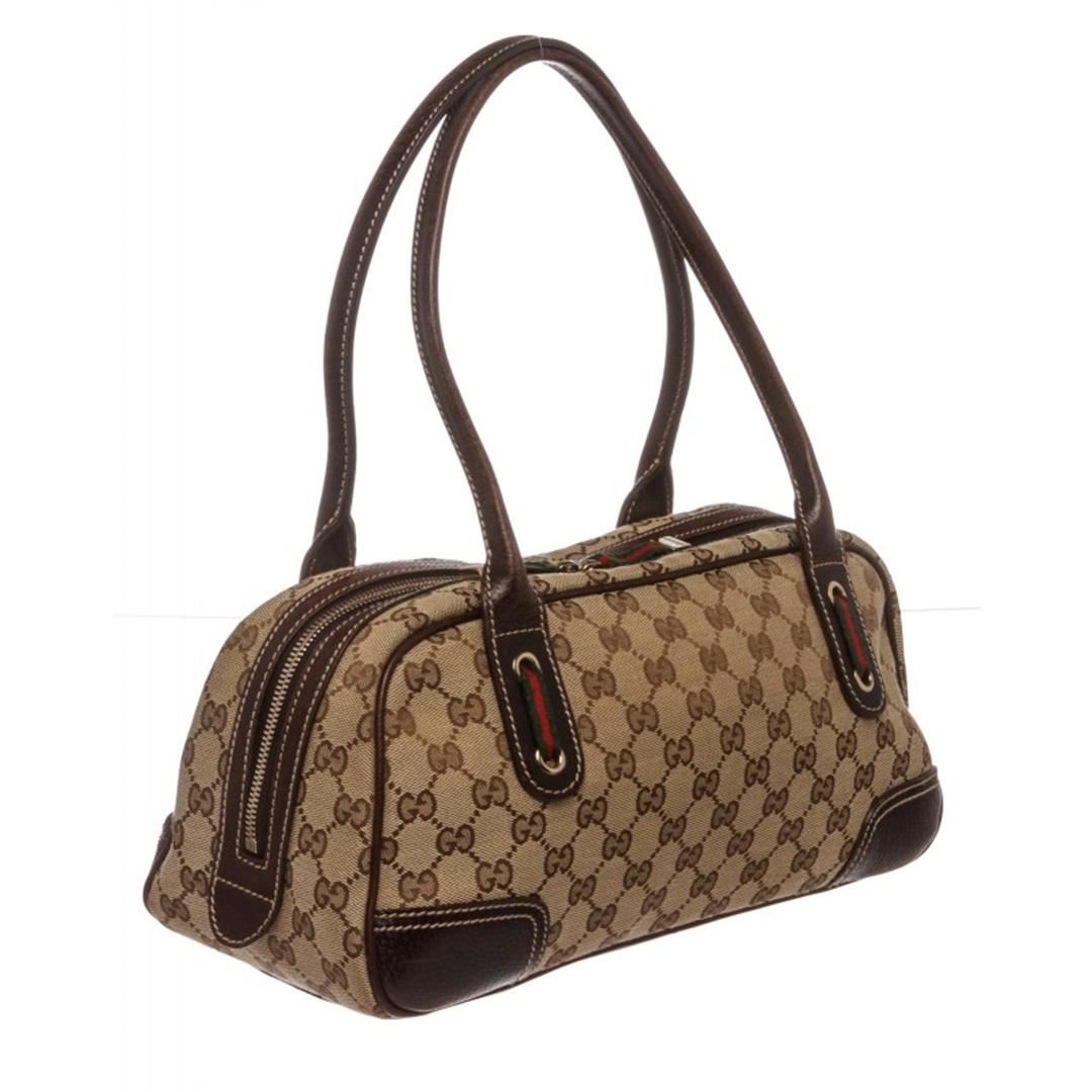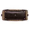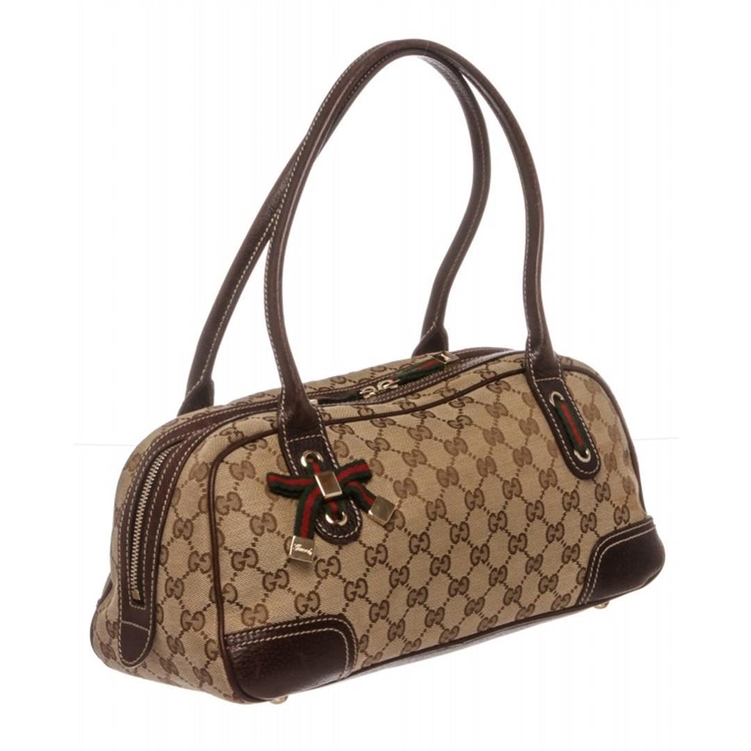 Brown and tan GG canvas Gucci Princy Boston bag with gold-tone hardware, walnut brown leather trim, dual flat shoulder straps featuring Gucci web trim and bow embellishment, chocolate brown woven lining, dual pockets at interior wall; one with zip closure
