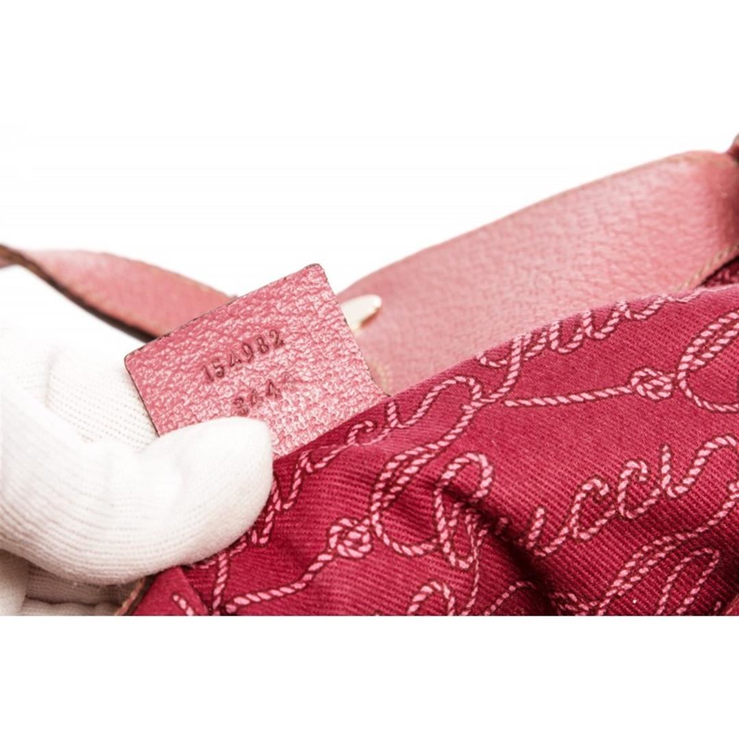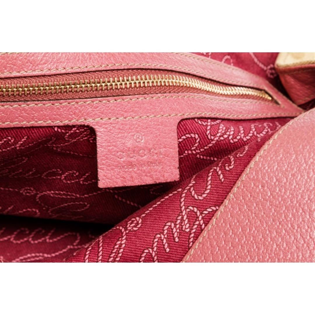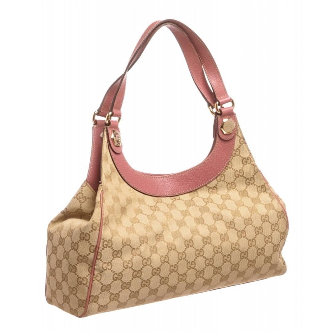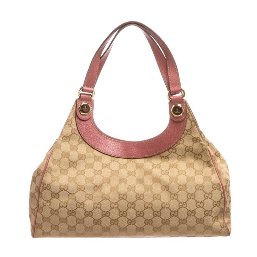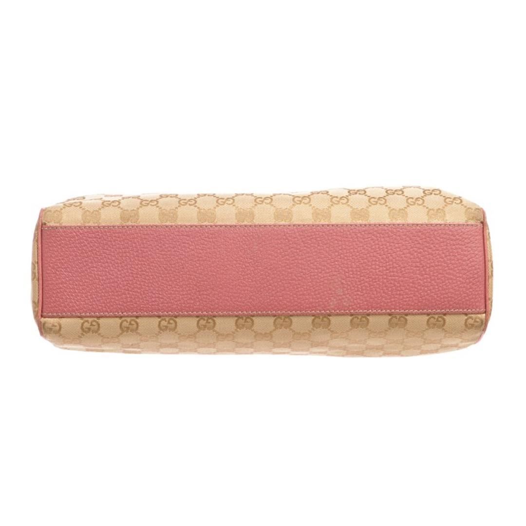 Beige and brown monogram canvas Gucci shoulder handbag with gold-tone hardware, pink leather trim, dual flat shoulder straps, pink lining, one with zip closure pocket and snap closure at top. Item is pre-owned.