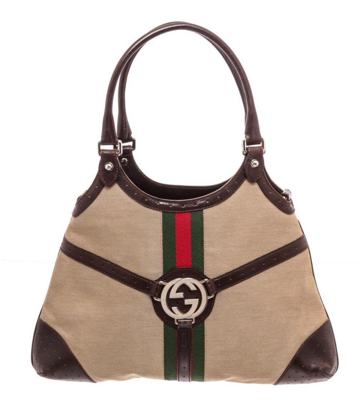 Gucci Beige Canvas Brown Leather Interlocking Shoulder Bag with gold-tone hardware, interior zip pockets, leather lining dual top handle and snap closure. Measurements: Length: 8 in / 20 cm Width: 3.5 in / 9 cm 5.5 in / 14 cmCONDITION: Pre-Owned Good overall, please see photographs for detail.