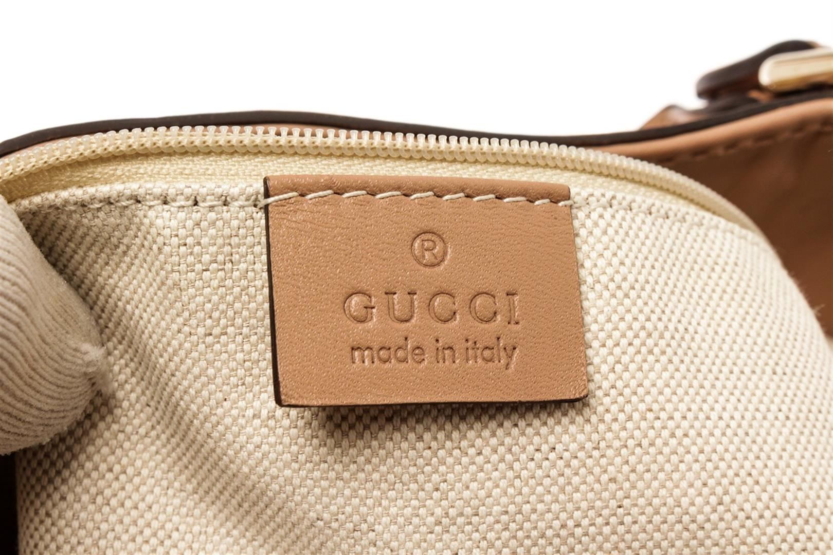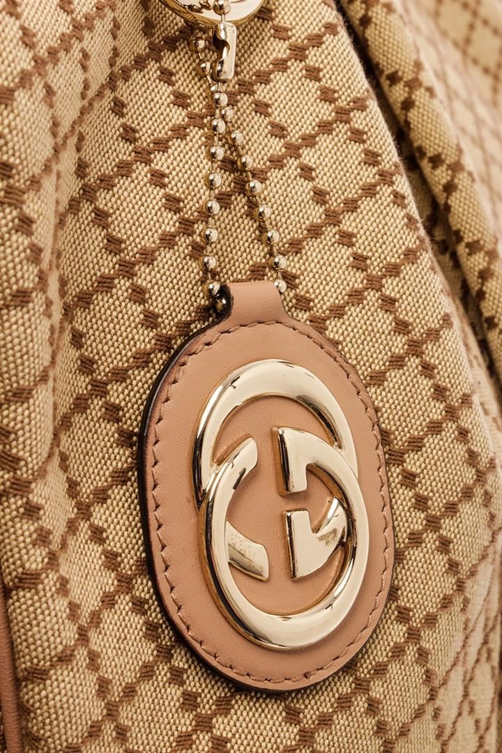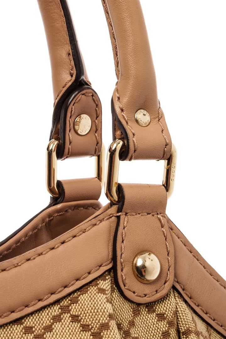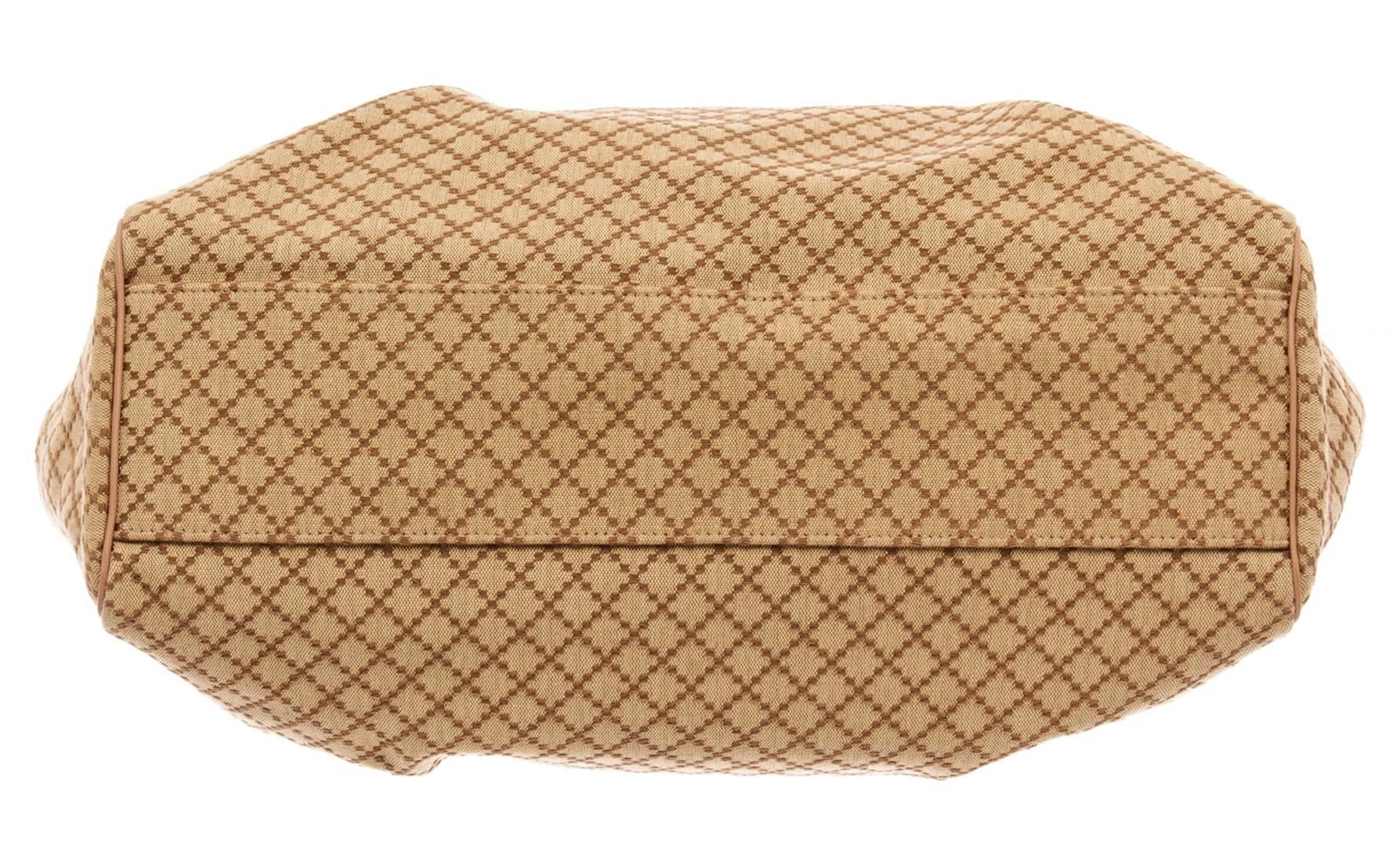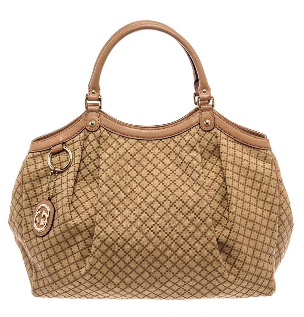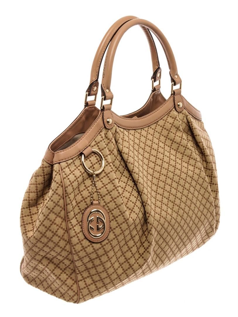 Gucci Beige Canvas Sukey/Diamante Tote Bag. All available information is listed in the description and shown in the photos. Gucci Beige Canvas Sukey/Diamante Tote Bag with brown canvas, diamante print & sukey logo, gold-tone hardware, dual rolled handles, canvas lining & single interior pocket, snap closure at top. Height: 11.5" Width: 14.75" Depth: 5", Handle Drop: 6" / 29.21 x 37.46 x 12.7 Cm