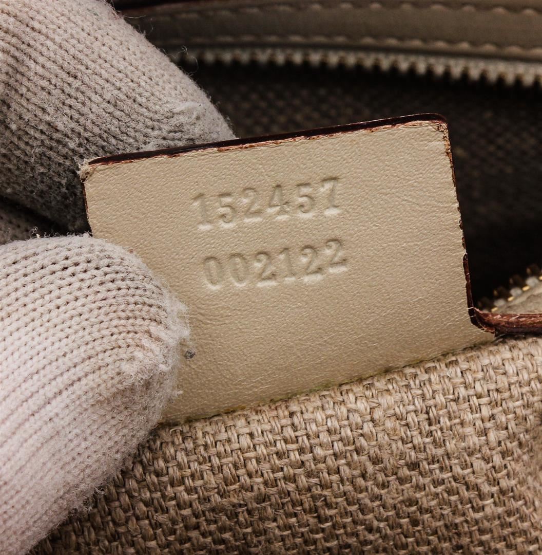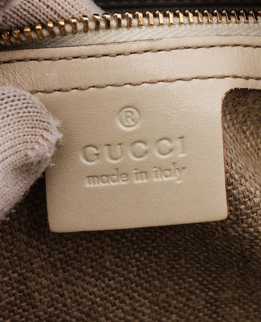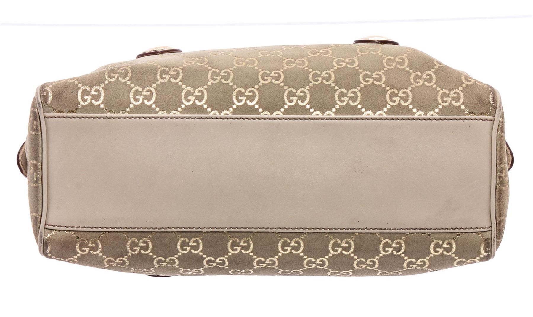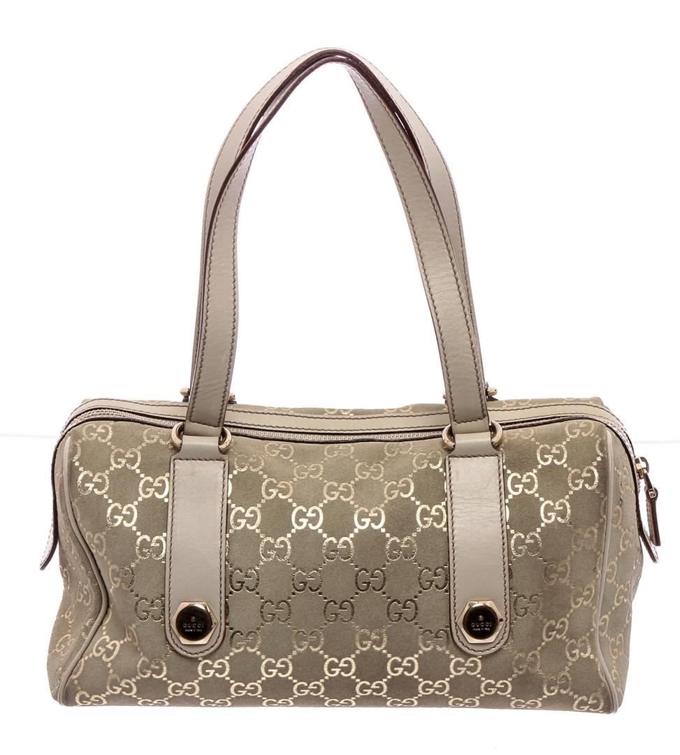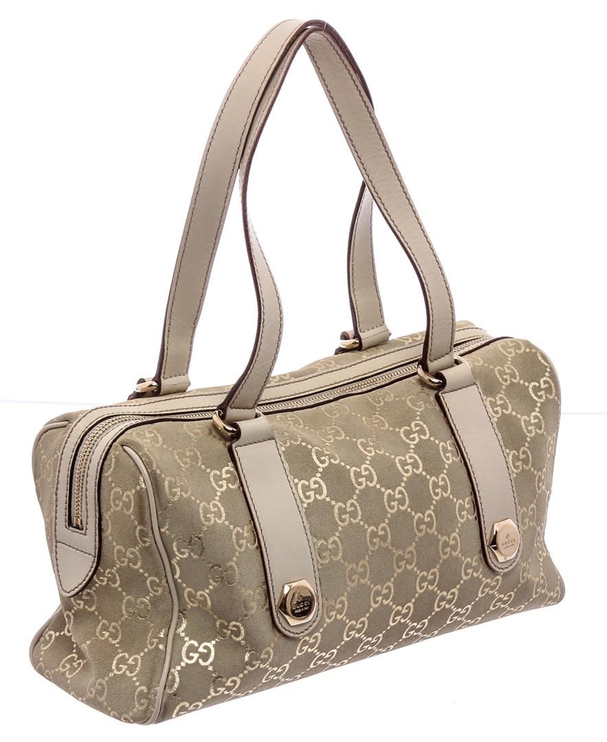 Metallic Gold GG canvas Gucci Charmy Boston bag with gold-tone hardware, dual flat shoulder straps, pink leather trim, beige jacquard lining, single interior zip pocket and zip closure at top.