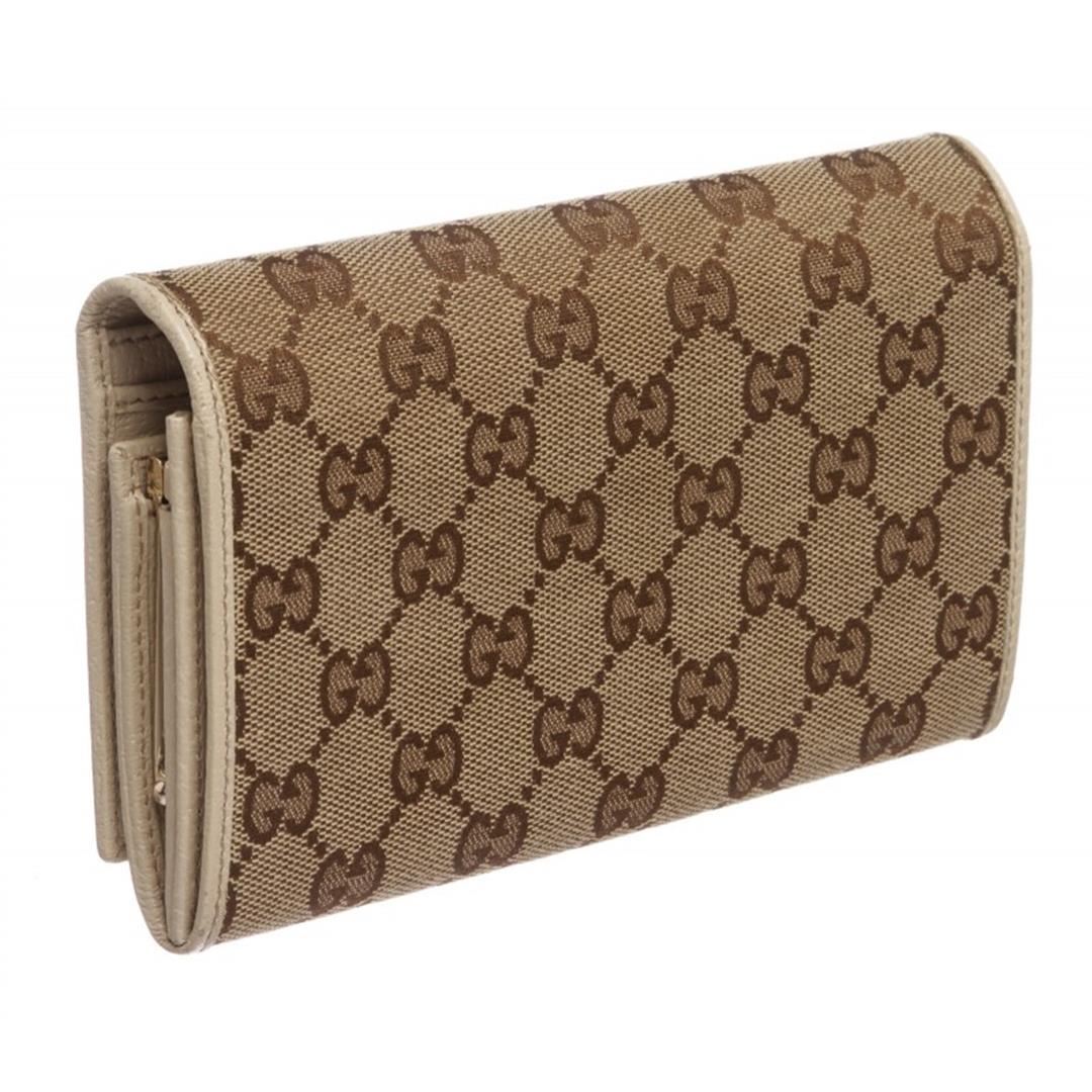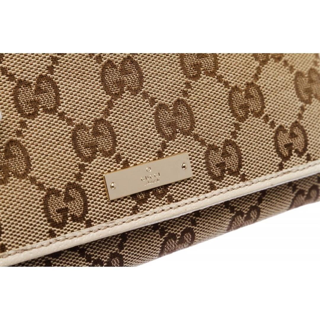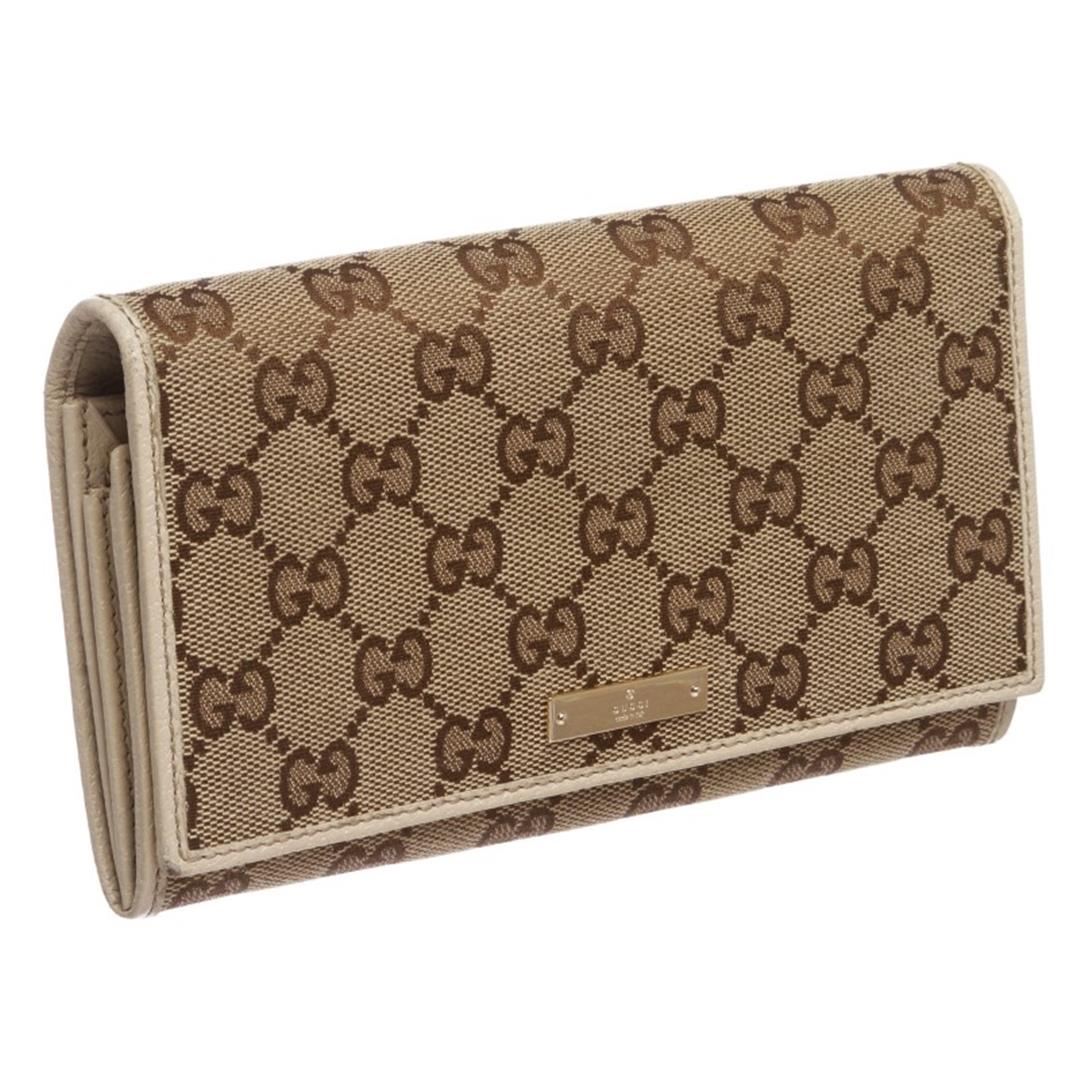 Beige and Tan monogram canvas leather Gucci continental wallet with silver-tone hardware, leather trim, nylon lining, three compartments, dual bill compartments, single zip pocket, single pocket with kiss-lock closure at top, five cardots and snap closure