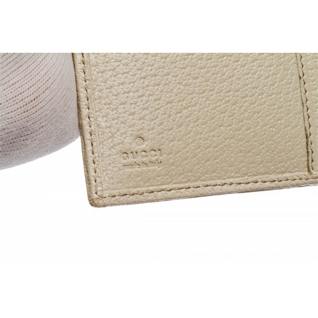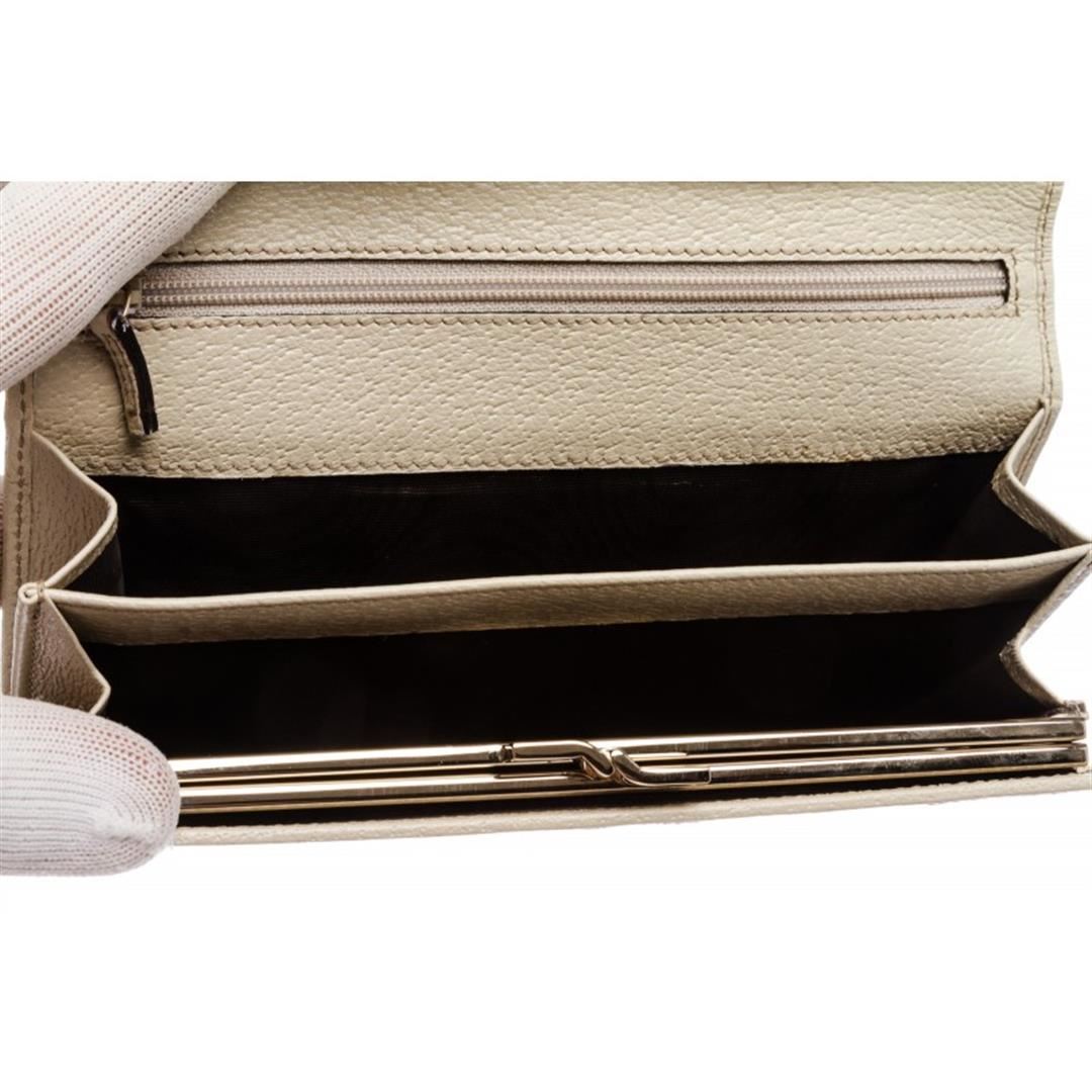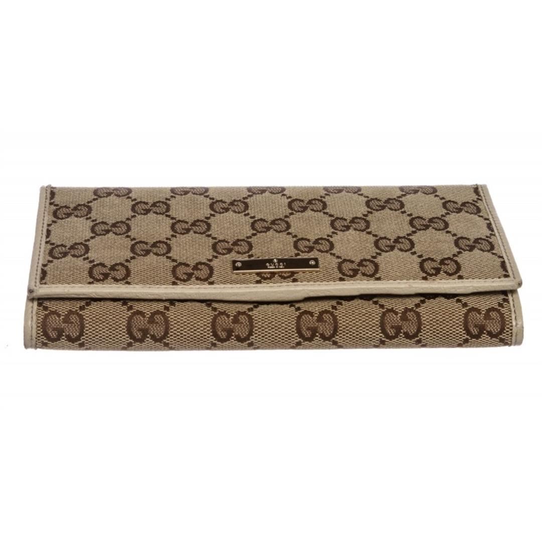 Beige and Tan monogram canvas leather Gucci continental wallet with silver-tone hardware, leather trim, nylon lining, three compartments, dual bill compartments, single zip pocket, single pocket with kiss-lock closure at top, five cardots and snap closure