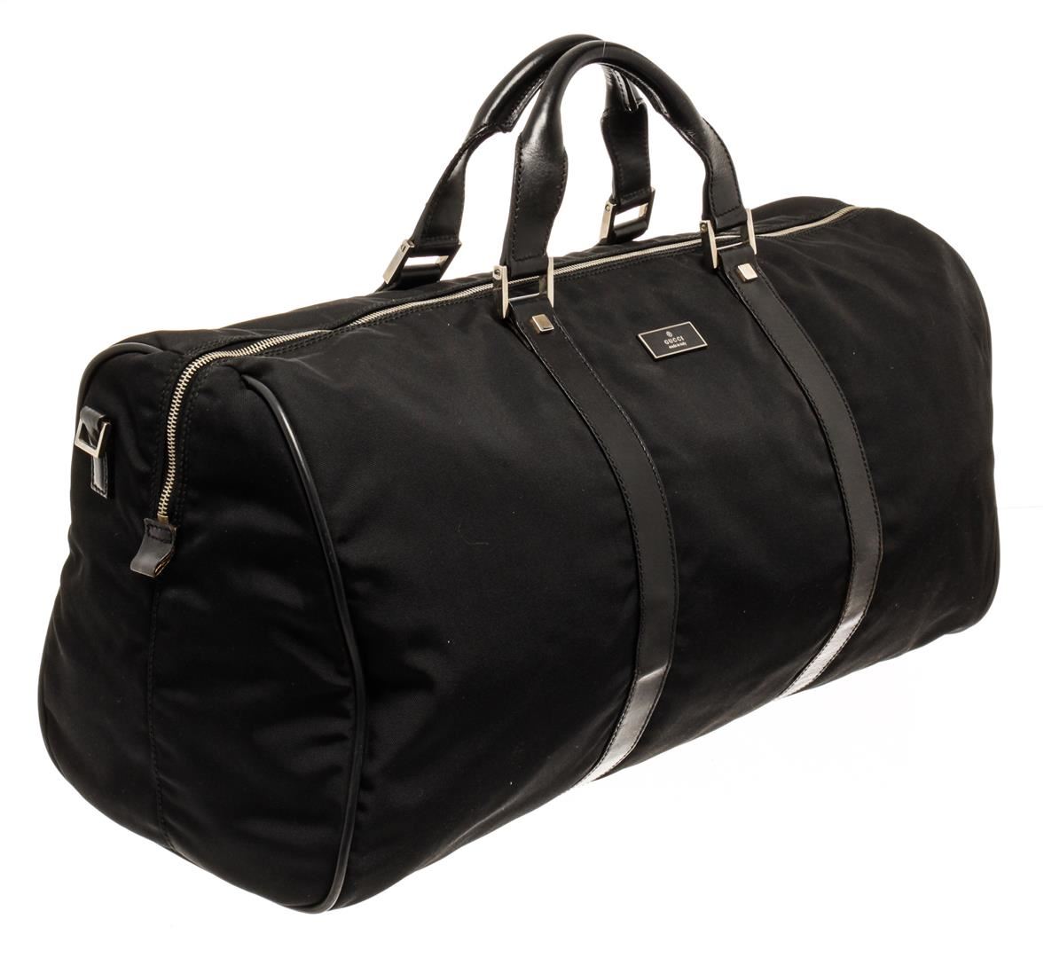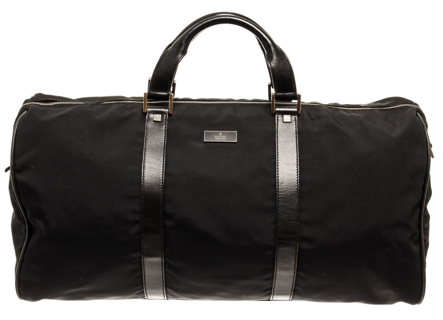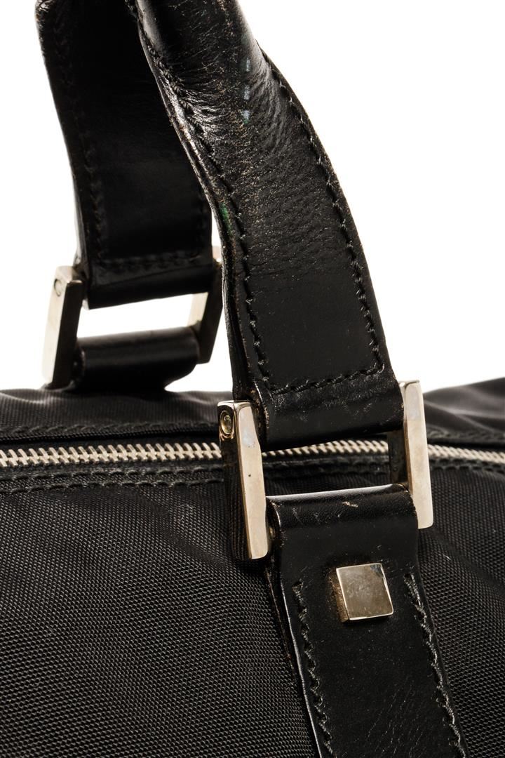 One Gucci Black Boston Bag. Item is sold AS-IS. All available information is listed in the description and shown in the photo. Gucci black Boston bag with top handles, silver-toned hardware, one zip interior pocket, and black fabric lining.