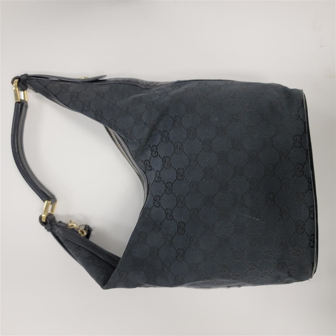 Gucci Black Leather Shoulder Bag with material leather gold-tone hardware, interior slip pockets, leather lining, shoulder strap and zipper closure.