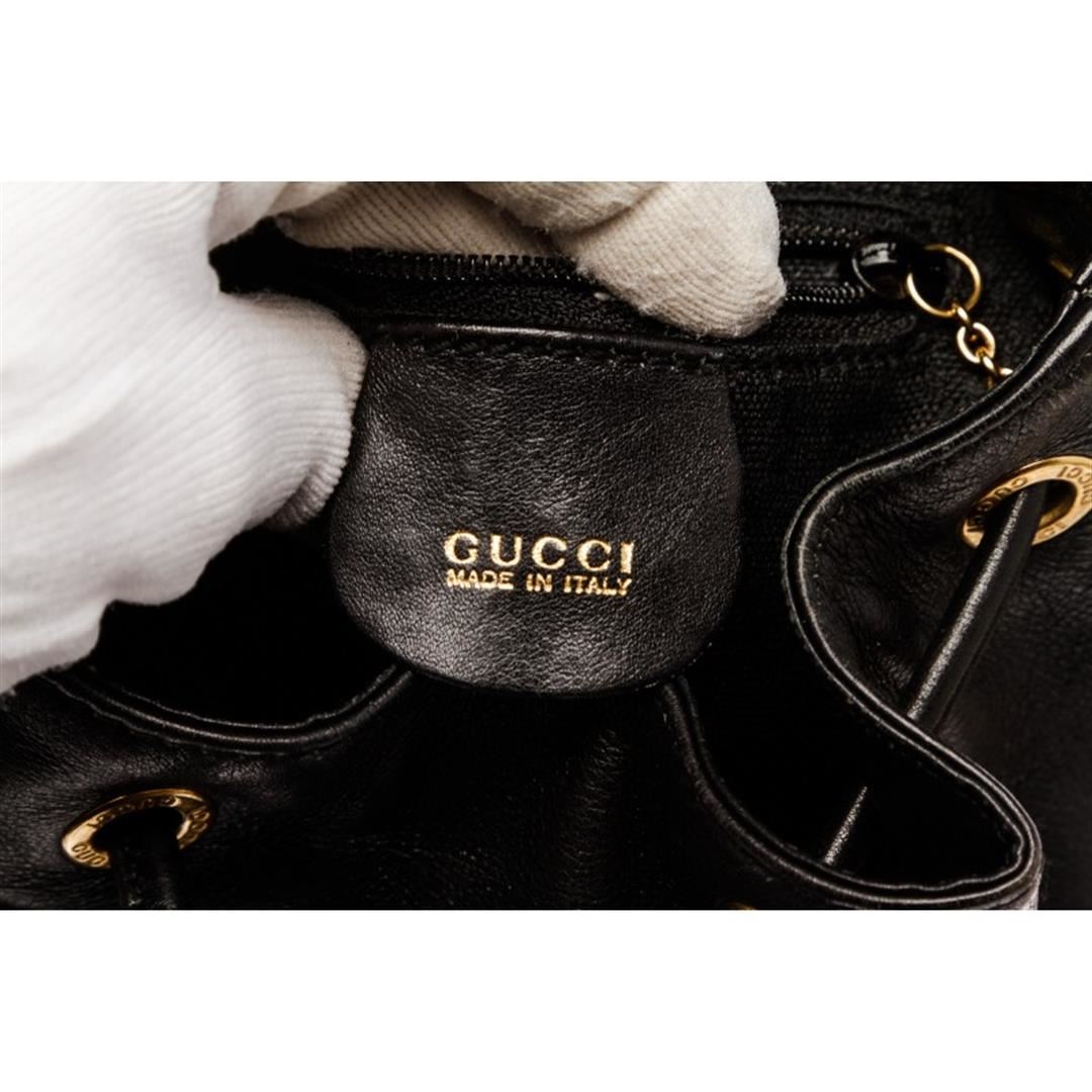 One Gucci Black Leather Drawstring Bamboo Mini Backpack. Overall flap push tab and drawstring closure. Interior contains fabric lining with one zipper pocket. Exterior contains adjustable straps, leather pocket with bamboo twist lock and bamboo handle.