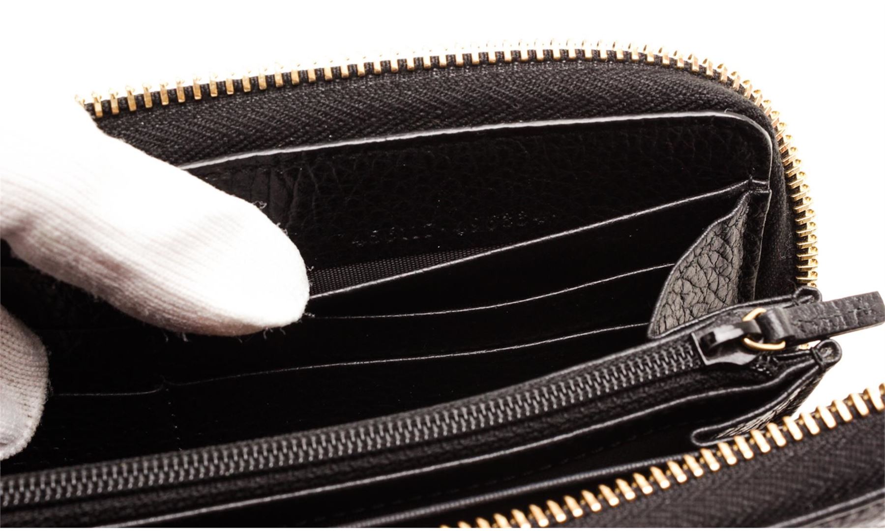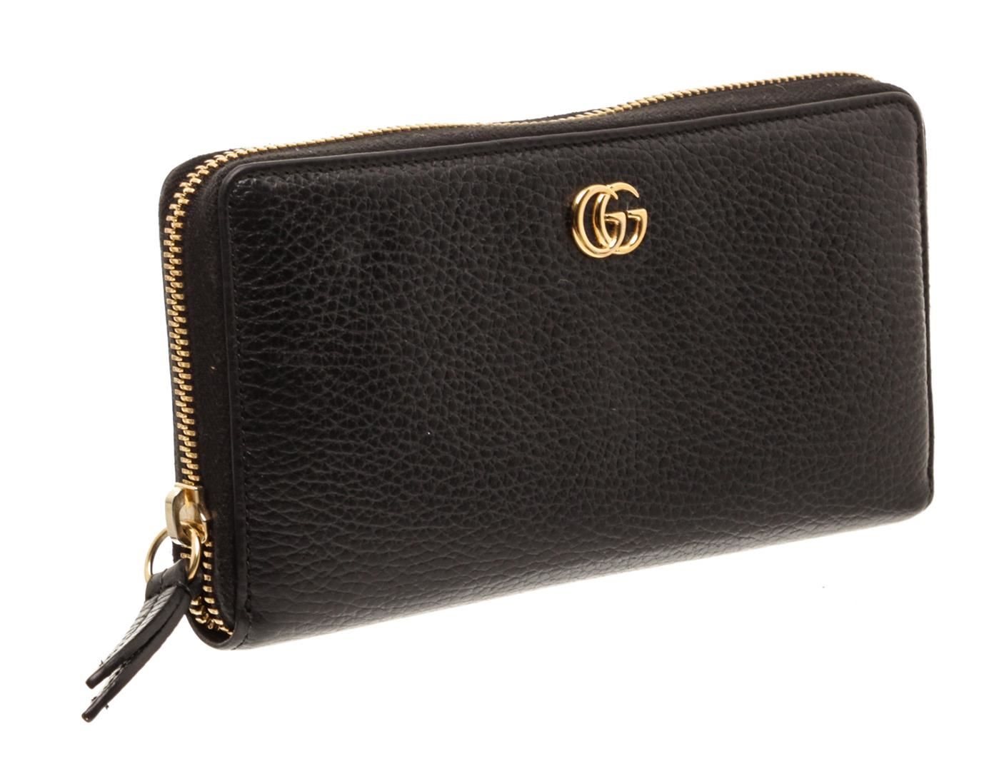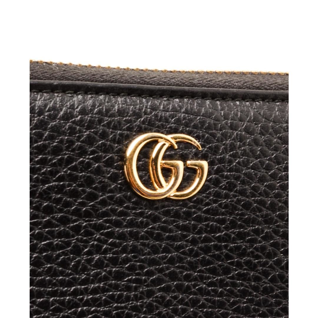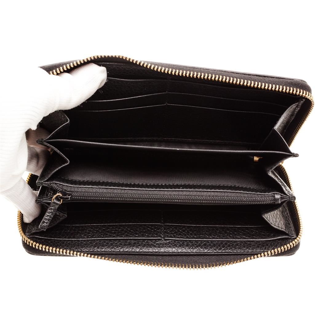 Gucci black leather Marmont Zippy wallet with gold-tone hardware, four interior compartments, one with zip top, six card holders on each side, zip around closure.