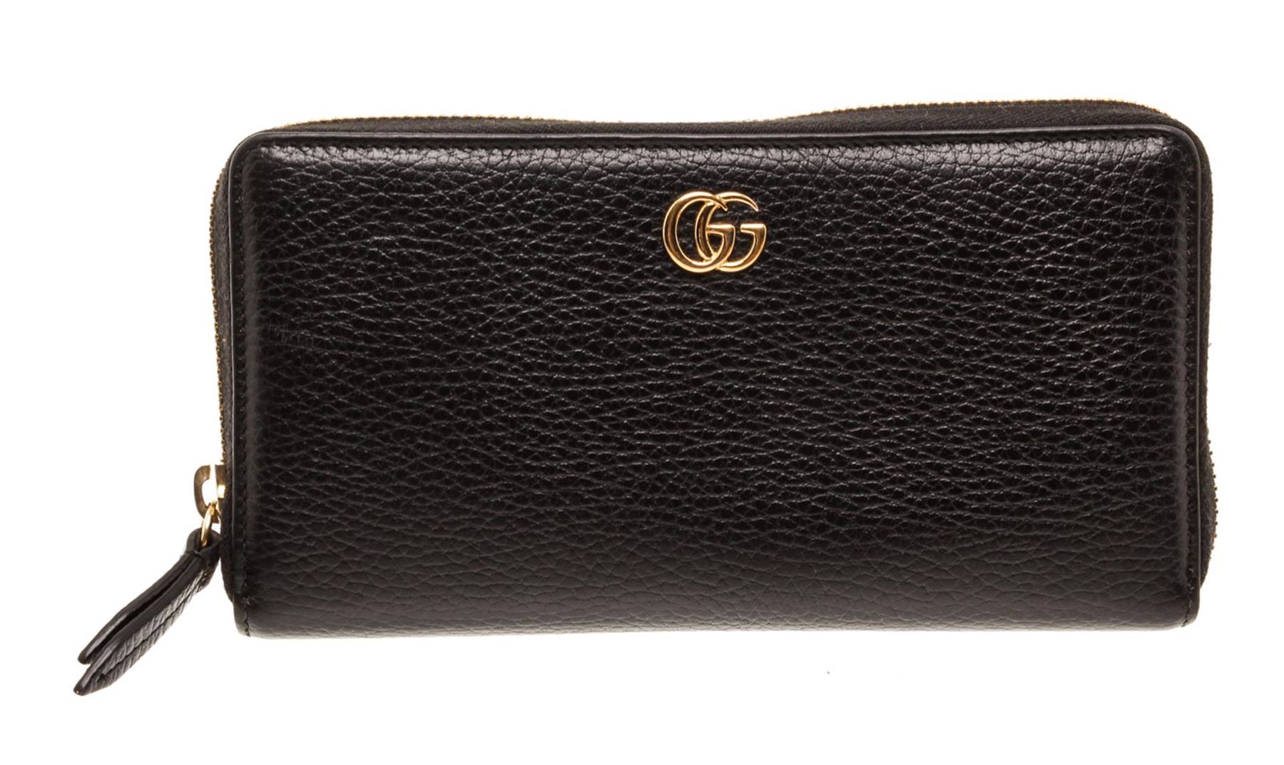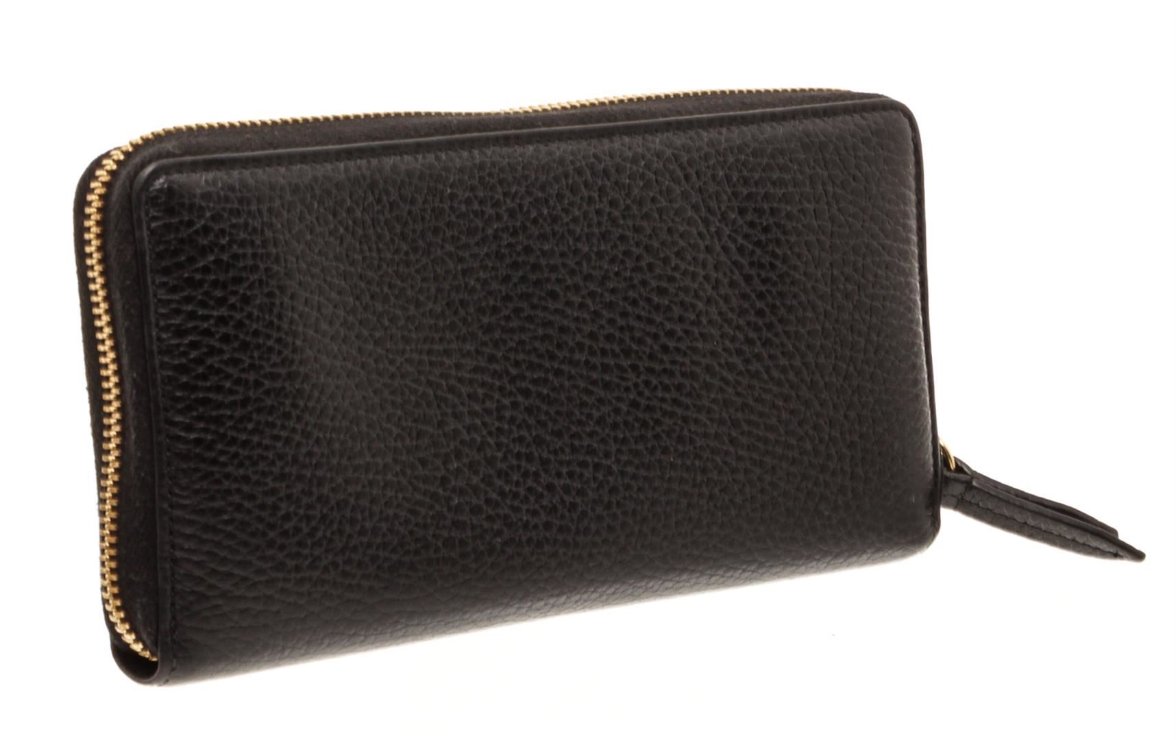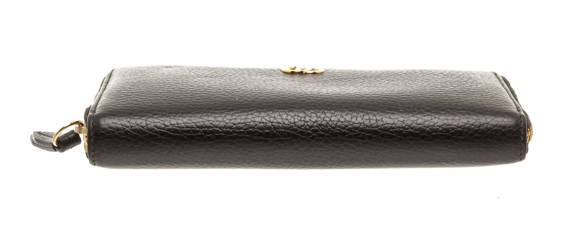 Gucci black leather Marmont Zippy wallet with gold-tone hardware, four interior compartments, one with zip top, six card holders on each side, zip around closure.