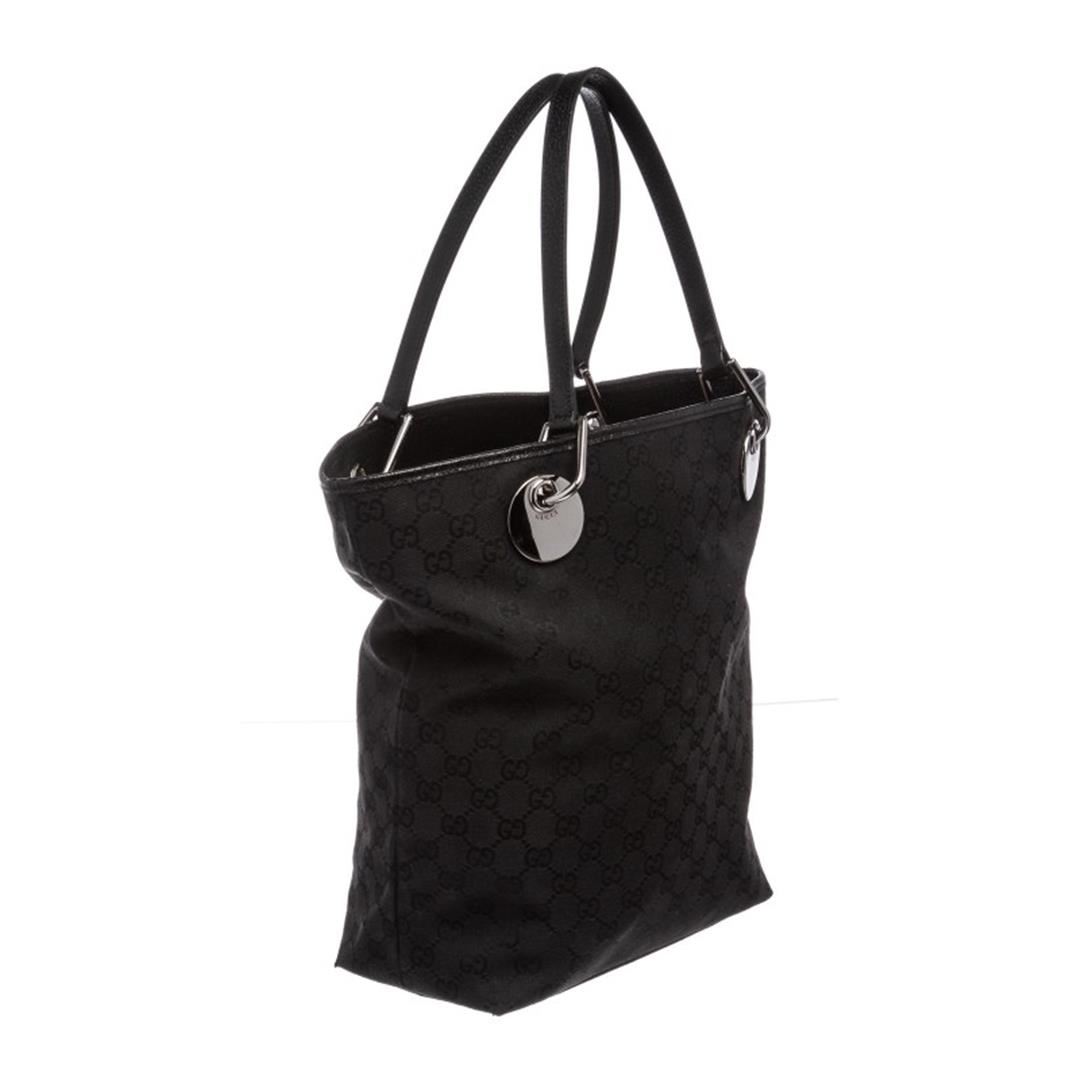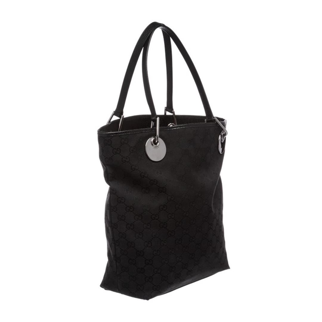 Black monogram canvas and leather Gucci Eclipse Tote with silver-tone hardware, tonal stitching throughout, dual flat shoulder straps, black woven lining, interior wall zip pocket and cell phoneot. Item is pre-owned.