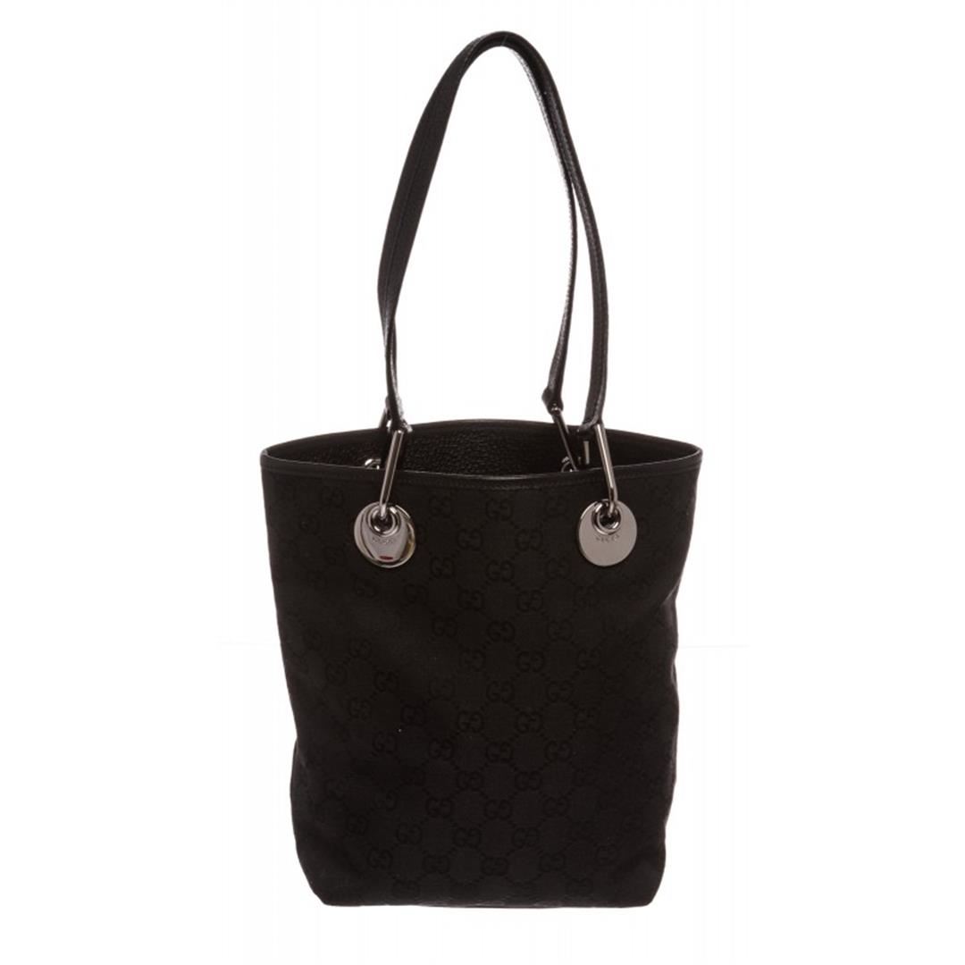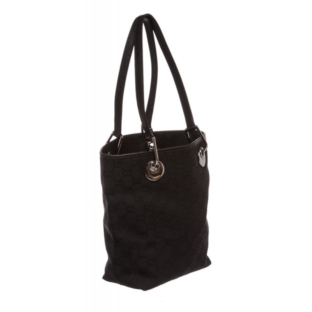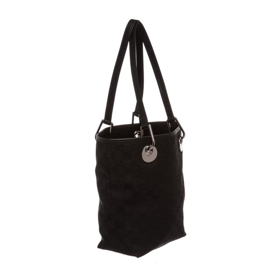 One Gucci Black Monogram Canvas Leather Trim Tote Handbag. Black Gucci monogram canvas with black cowhide trim including piping, silver hardware. Dual flat handles, with an open top closure that opens to black fabric interior with patch and zipper pocket.
