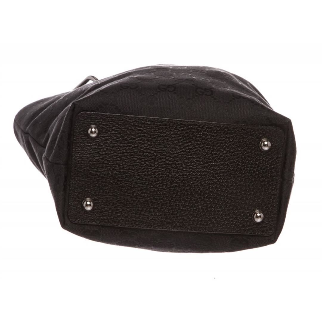 One Gucci Black Monogram Canvas Leather Trim Tote Handbag. Black Gucci monogram canvas with black cowhide trim including piping, silver hardware. Dual flat handles, with an open top closure that opens to black fabric interior with patch and zipper pocket. Item is pre-owned.