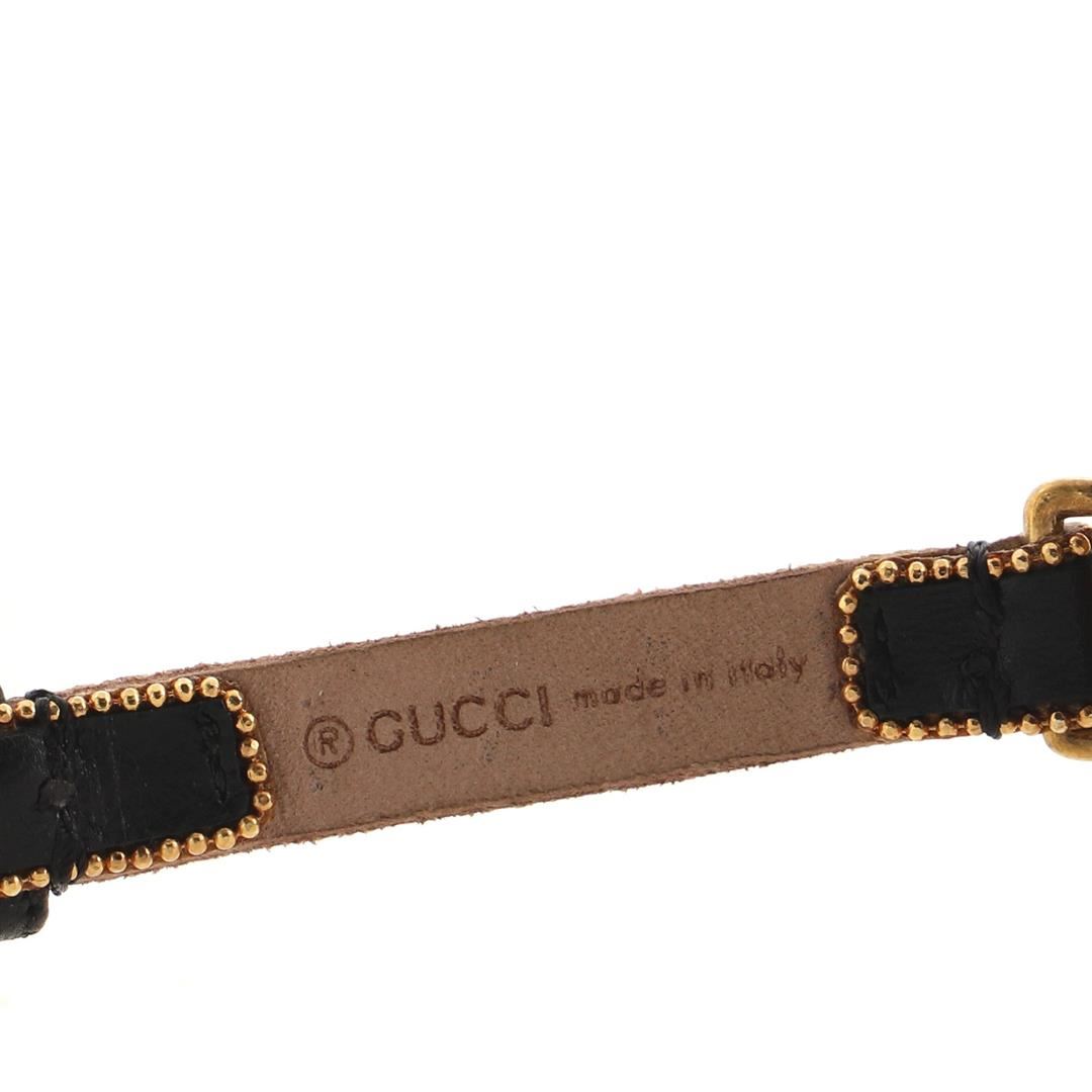 Designed in the style of a watch, the bracelet has the GG logo in gold-tone and it is surrounded by colorful crystals. More crystals are detailed on the leather straps and a simple buckle clasp is provided to help fasten this gem on your wrist.