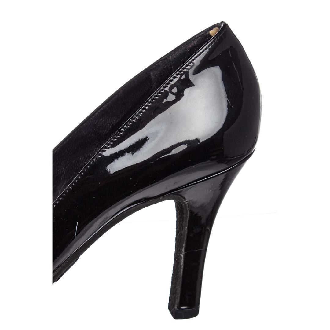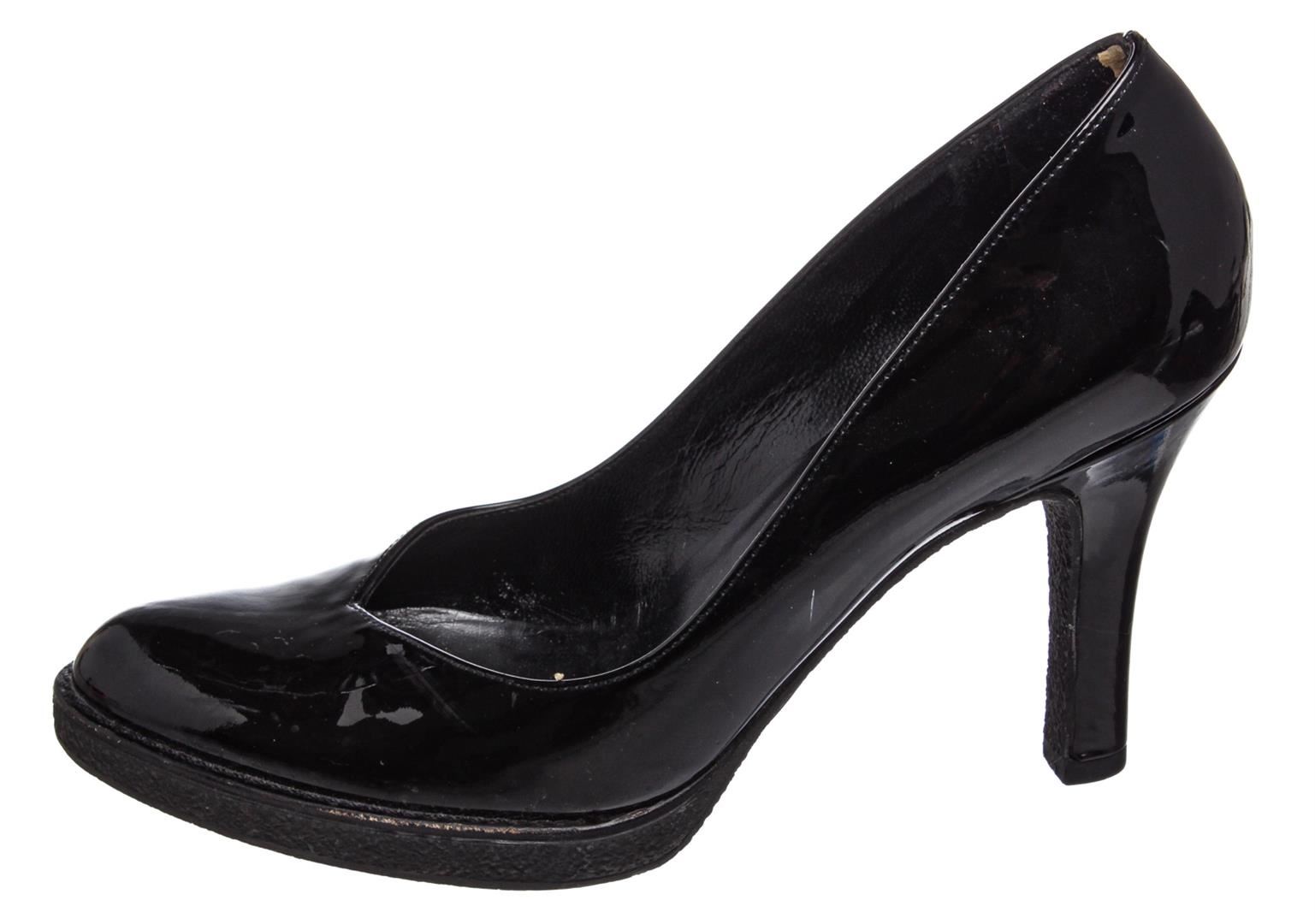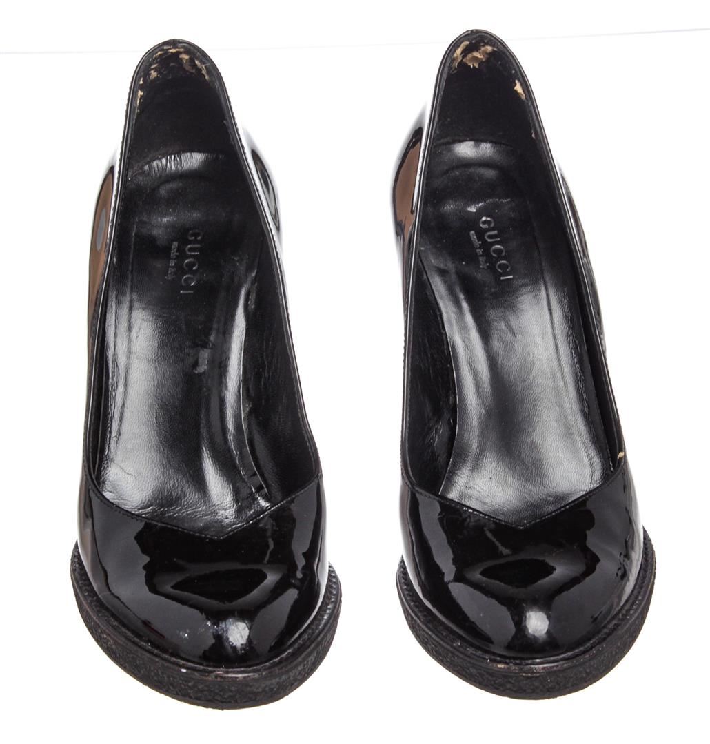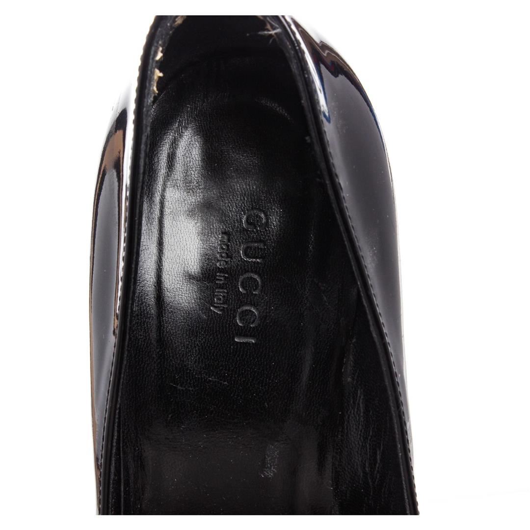 Gucci black patent leather pumps with 0.5" rubber sole and 3.75"x0.5" heel, designer size 37. Authentic.
