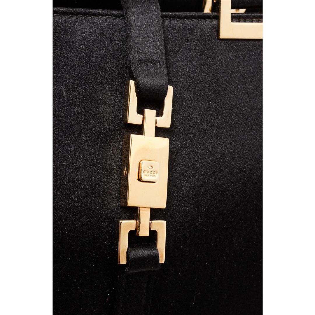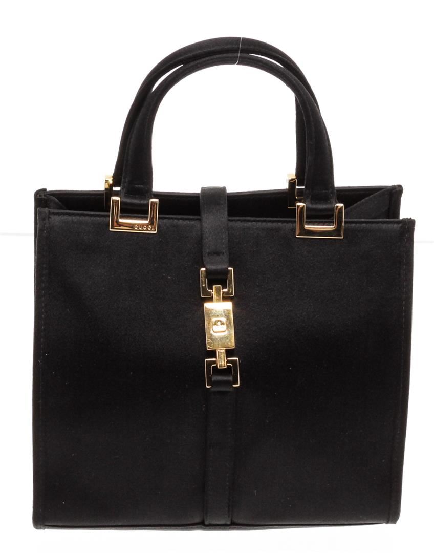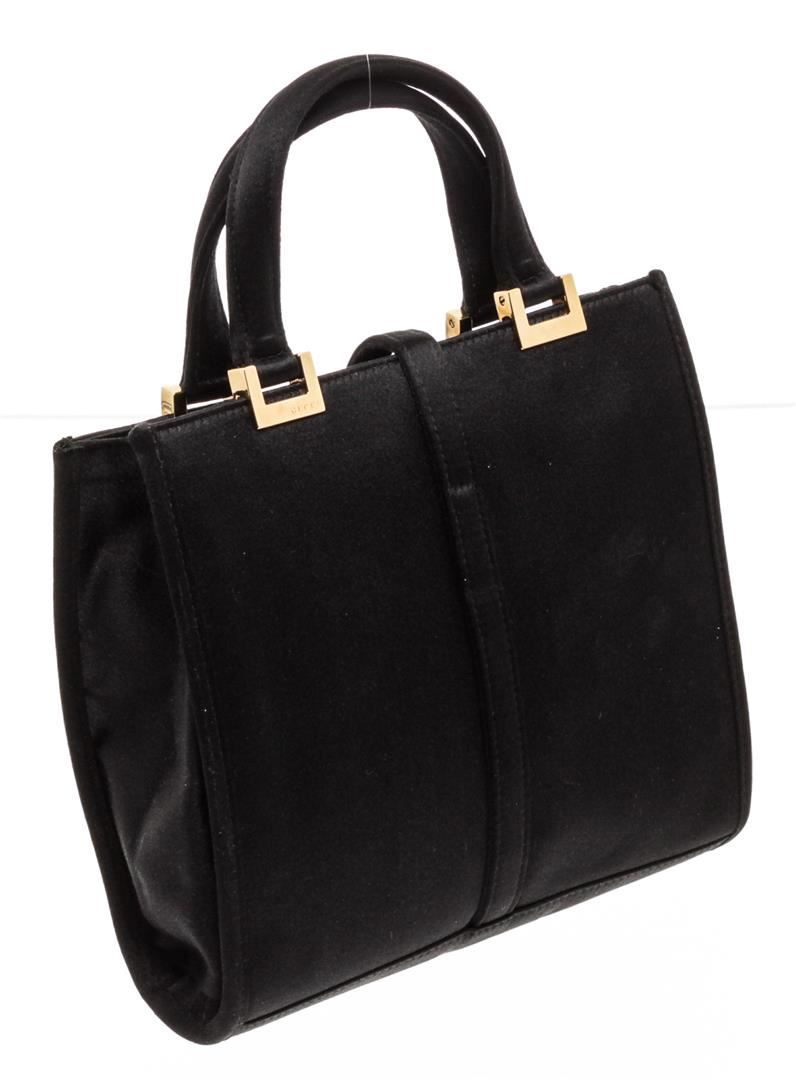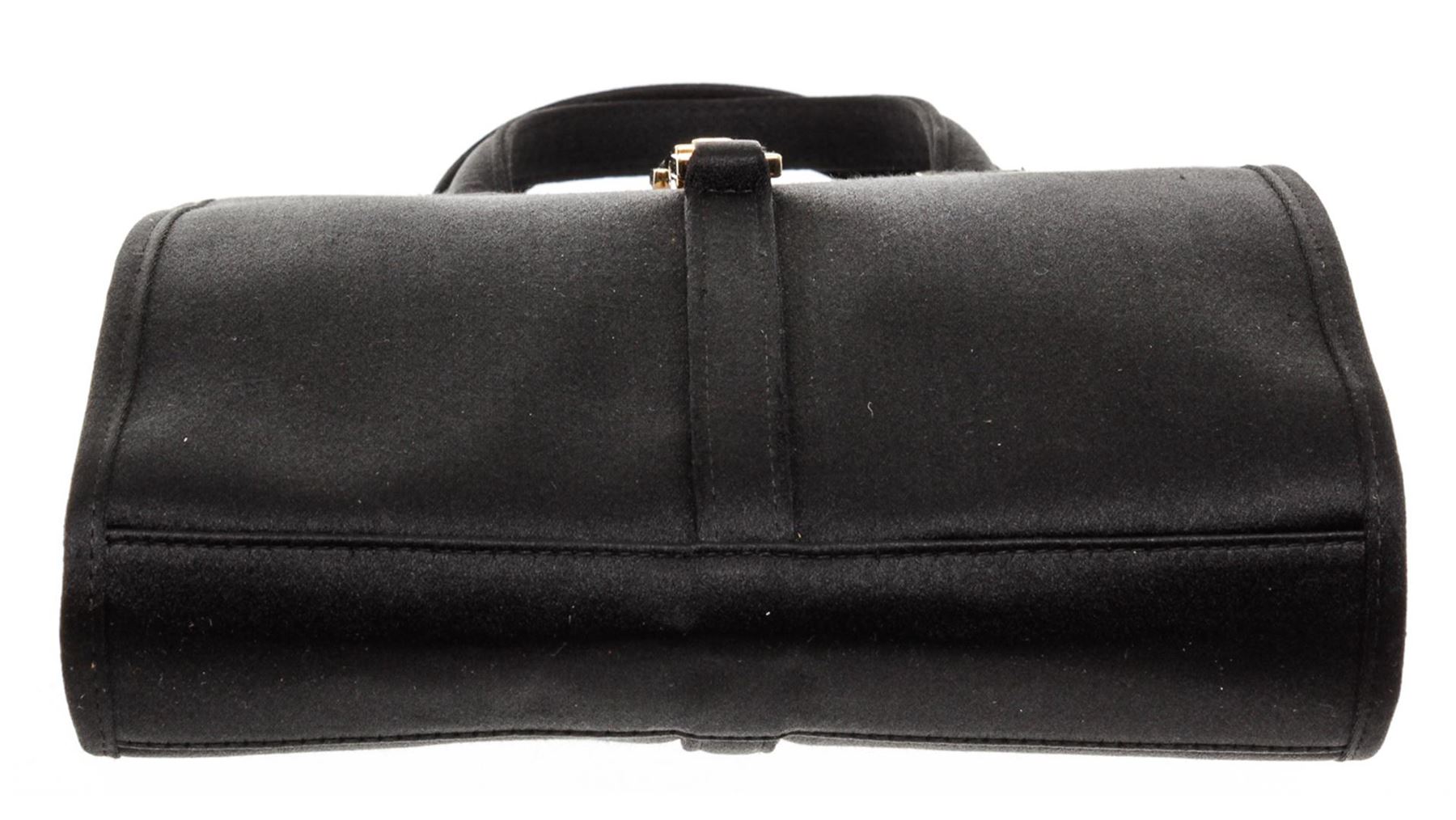 Grafted out of black satin, gold-tone hardware, and dual flat handles.