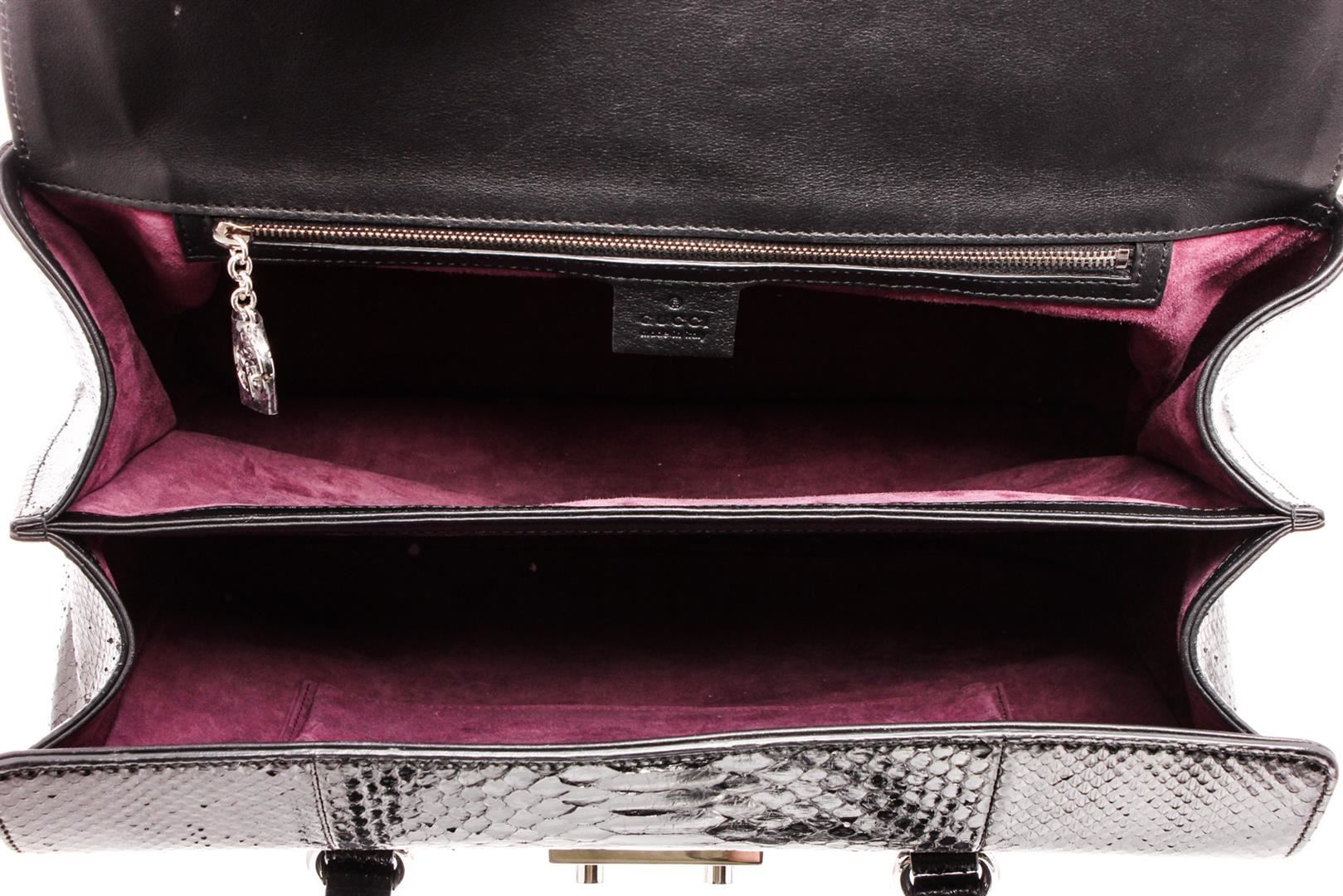 Black snakeskin Lady Lock tote bag with silver-tone hardware, dual top handles, protective feet at base, purple suede interior lining, dual interior compartments, and logo embossed push-lock closure at front flap