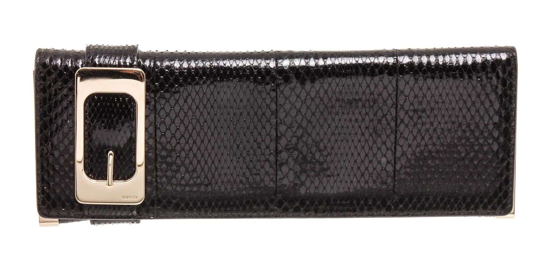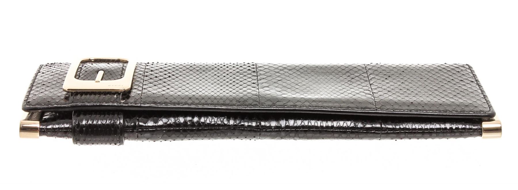 One Gucci Black Snakeskin Romy Long Clutch. Black Snakeskin Gucci Romy Long clutch with silver-tone hardware, black and brown satin lining, single slit pocket at interior wall and magnetic snap closure at flap with buckle accent at front.