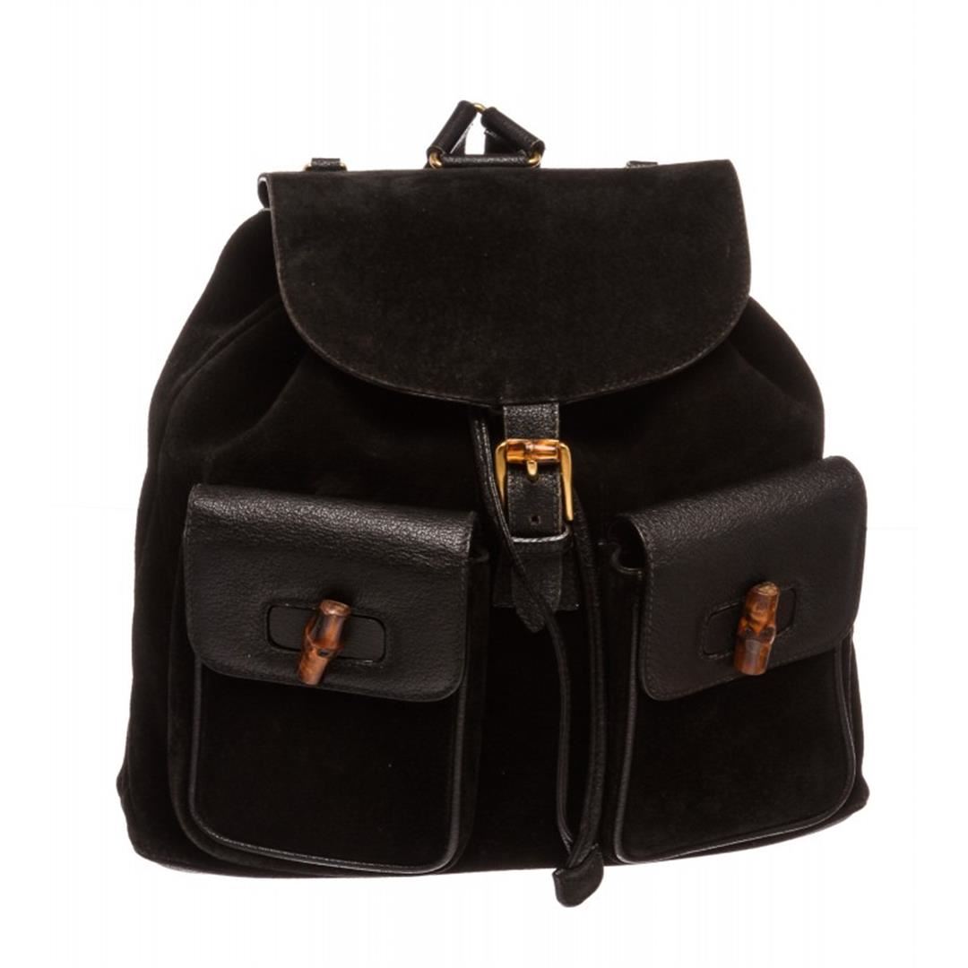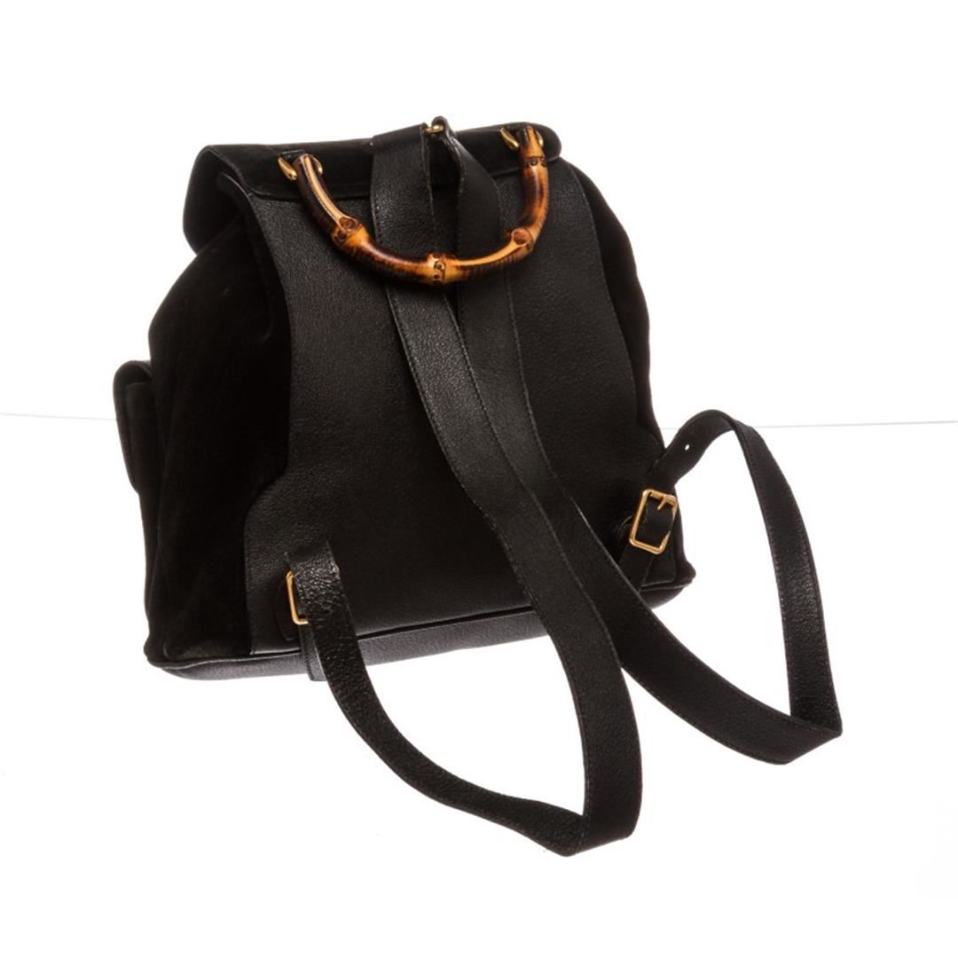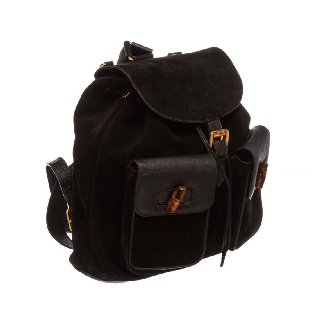 One Gucci Black Suede Leather Trim Drawstring Bamboo Backpack. Overall flap buckle and drawstring closure. Interior contains fabric lining with one zipper pocket. Exterior contains adjustable straps, dual flap leather pockets with bamboo twist lock and ha