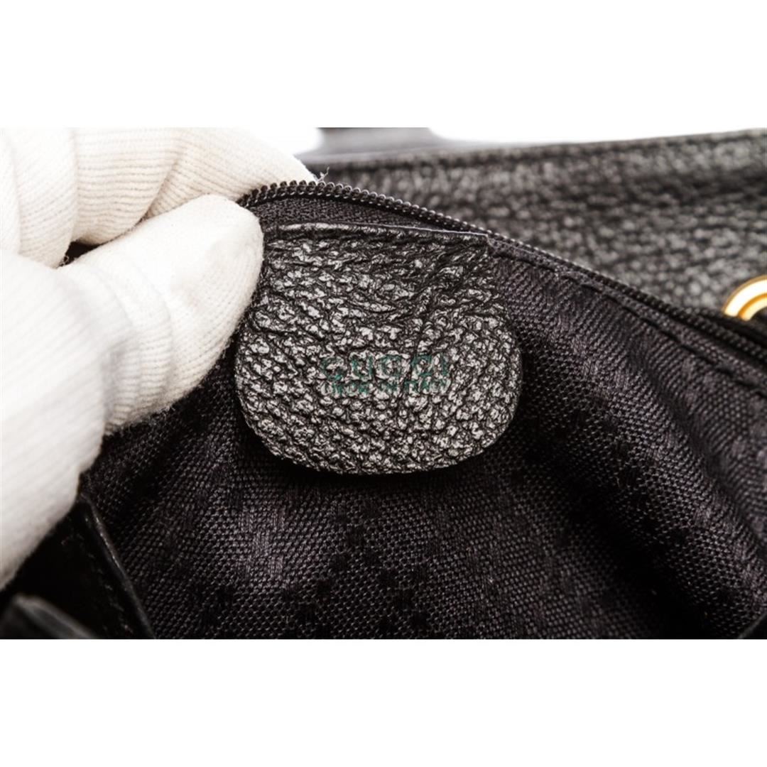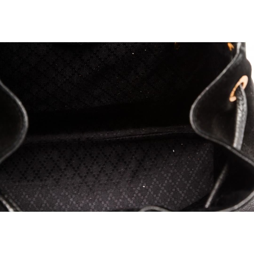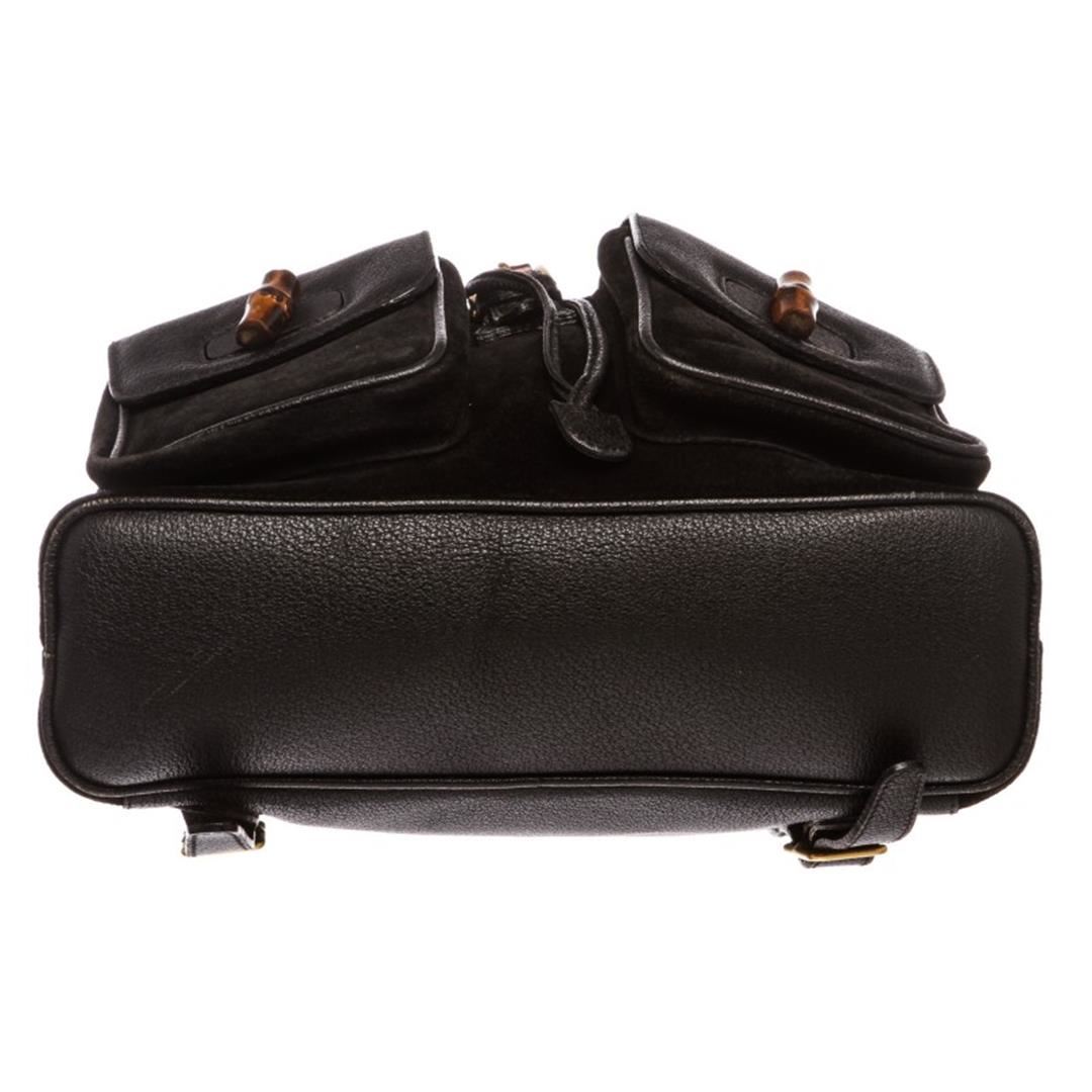 One Gucci Black Suede Leather Trim Drawstring Bamboo Backpack. Overall flap buckle and drawstring closure. Interior contains fabric lining with one zipper pocket. Exterior contains adjustable straps, dual flap leather pockets with bamboo twist lock and ha