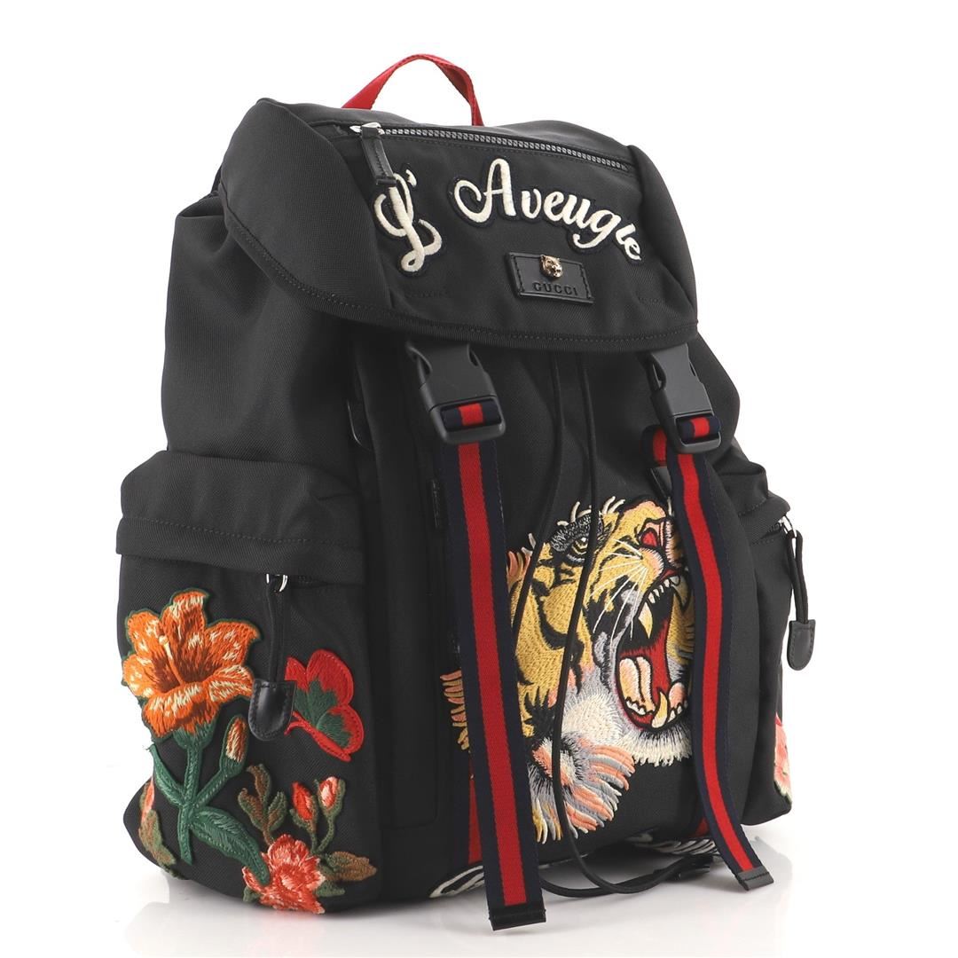 Gucci Black Techpack Embroidered Techno Canvas Backpack is made in a technical canvas fabric, equipped with multiple pockets and adorned with embroidered appliqués, including the tiger, flowers and "l'aveugle par amour" which translates to "blind for love