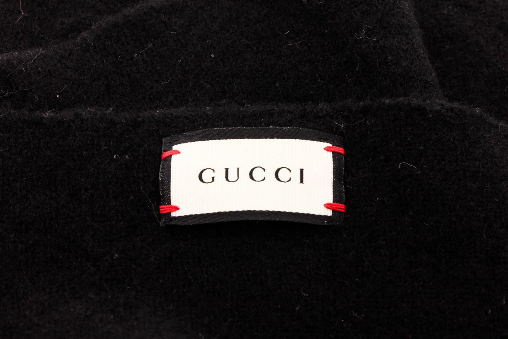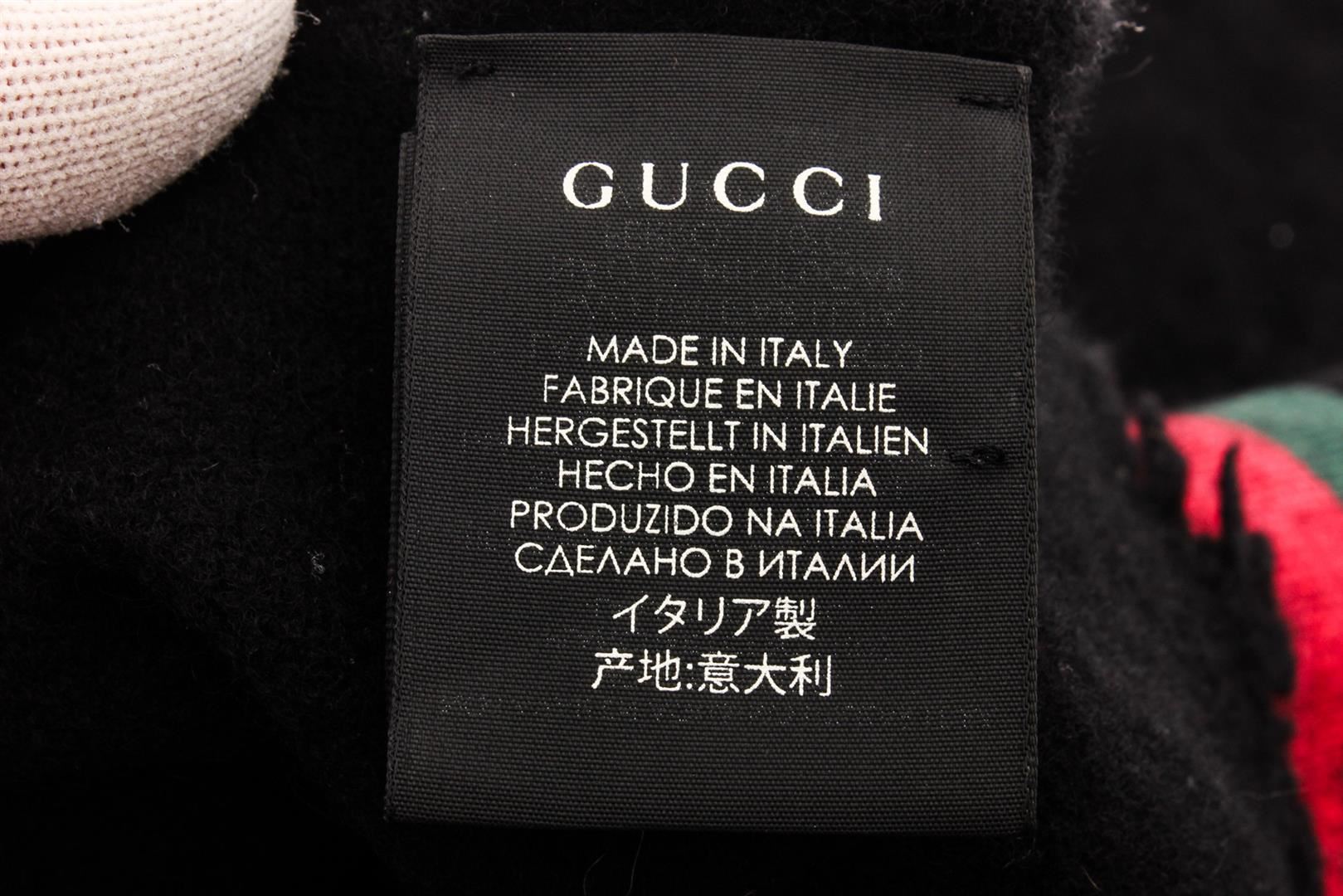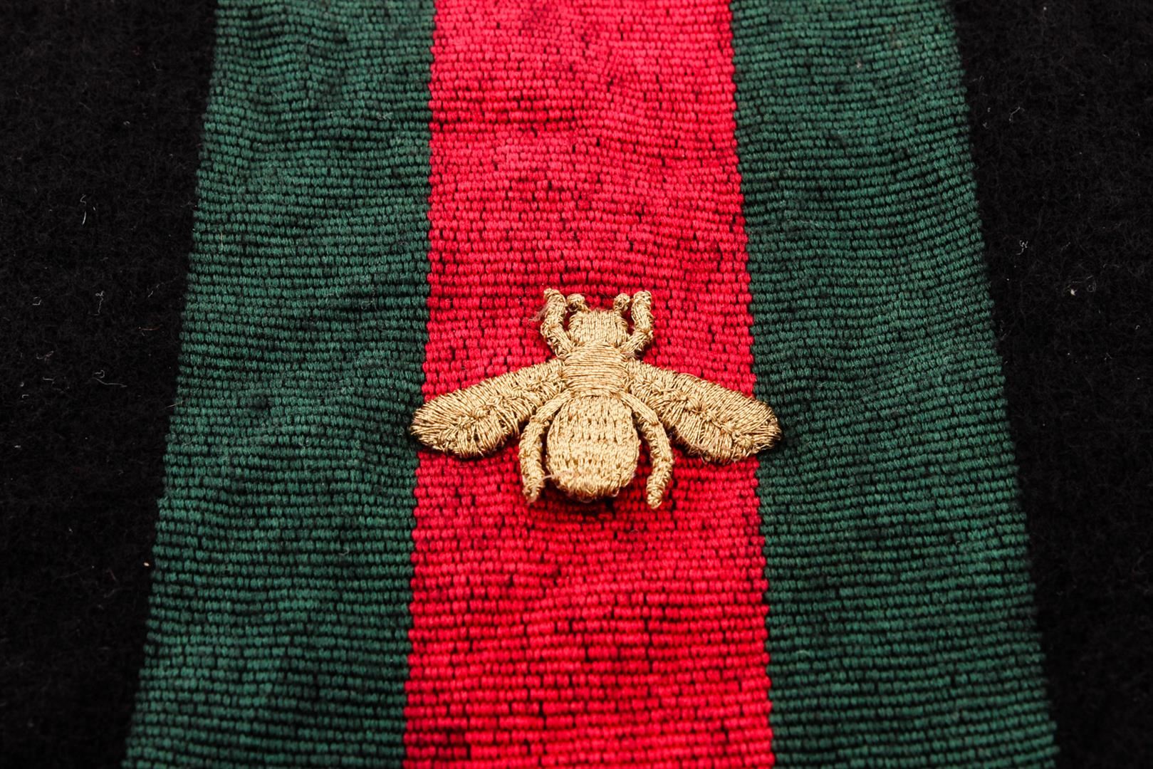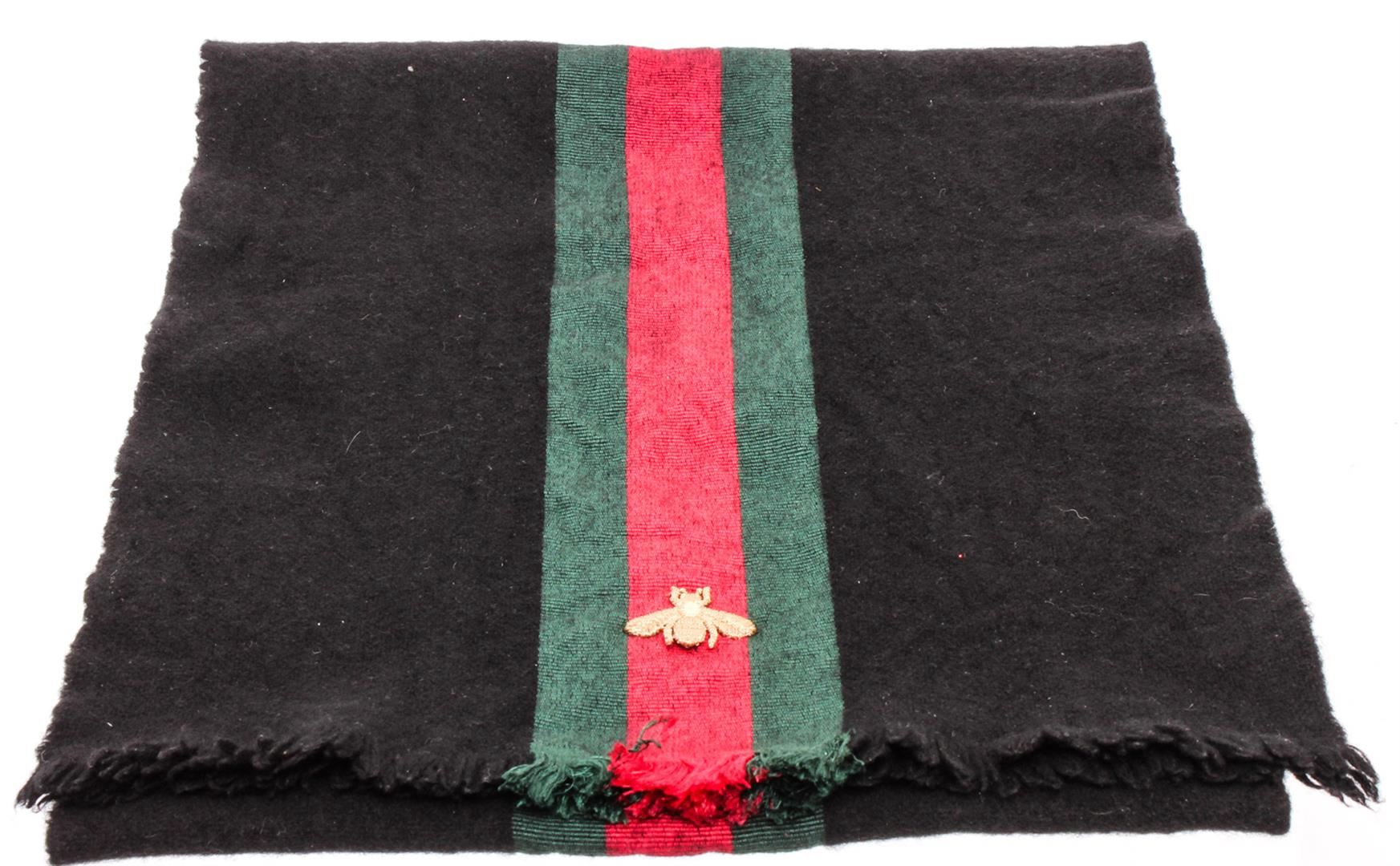 Gucci Black Web Wool Cashmere Bee Scarf, black and multicolor Gucci woven scarf with Web detail and gold bee embroidered at front with raw-edge tri