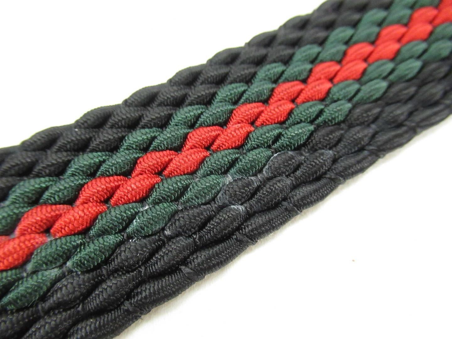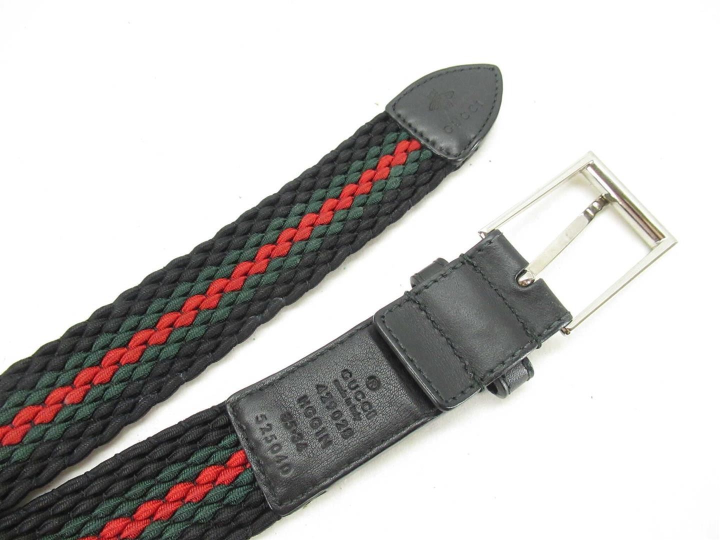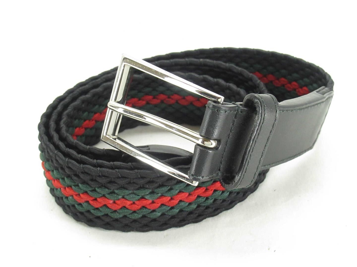 Black woven canvas with green and red Web accent Gucci Web belt with silver-tone hardware, rectangular buckle fastener and black leather trim.  Size : 85 cm
