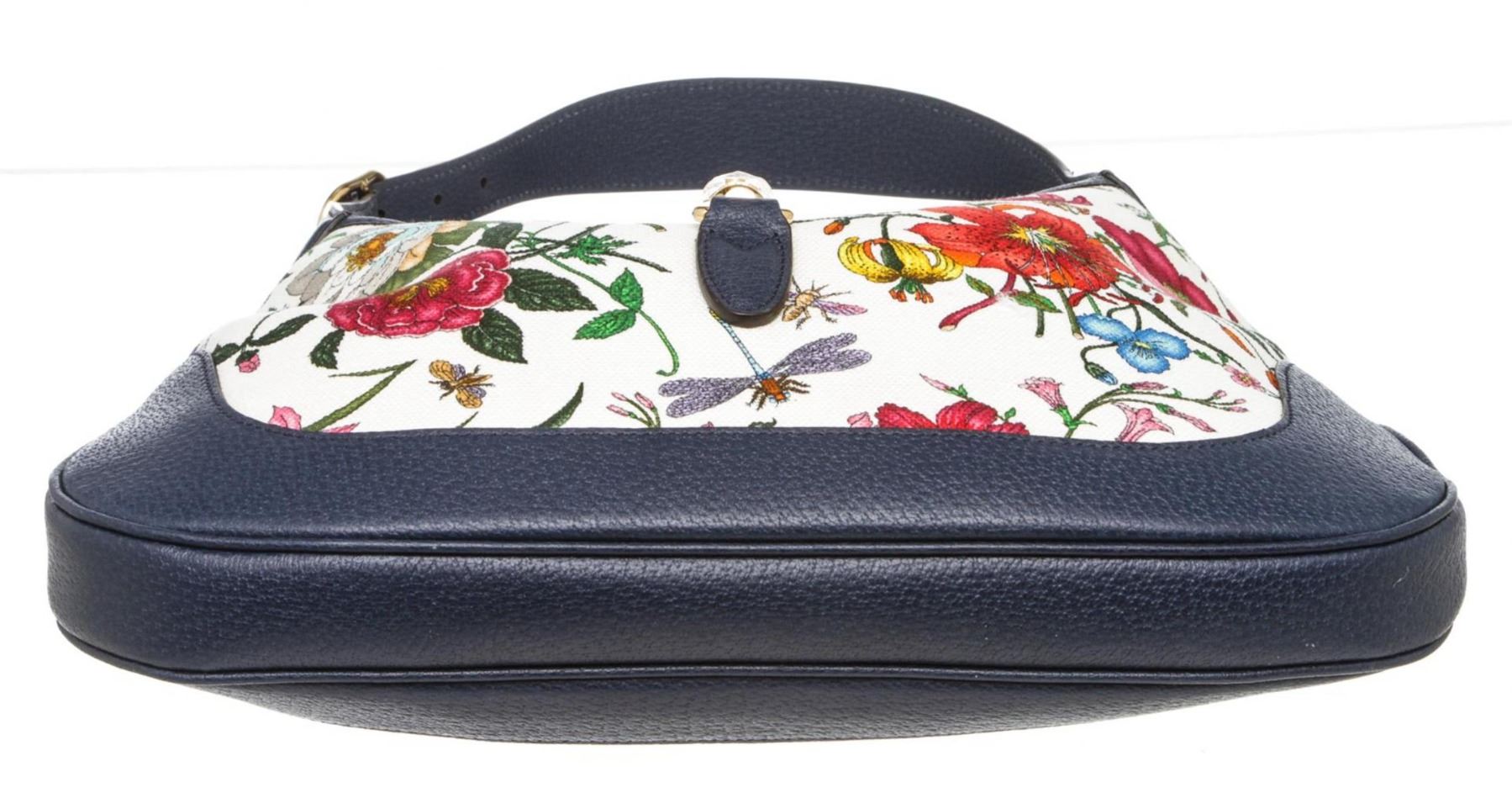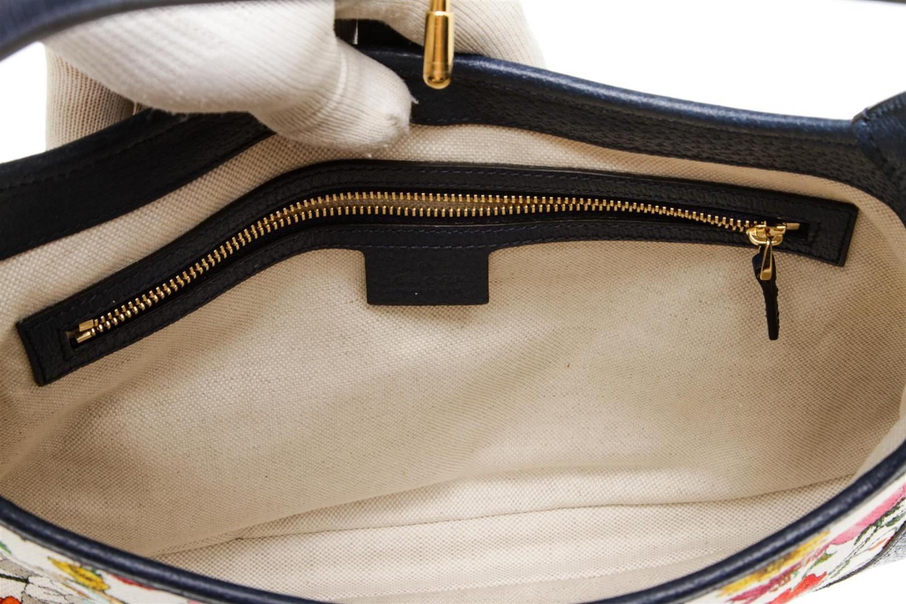Debuting in the Cruise 2019 collection, this Gucci handbag is crafted out of floral and insect multi-color canvas, dark blue pebbled leather trim, and gold-tone hardware. Inner beige canvas lining, dual slip pockets, and one zip pocket at interior wall.