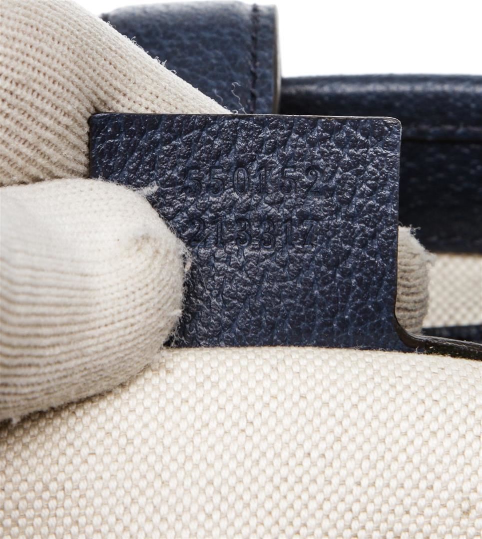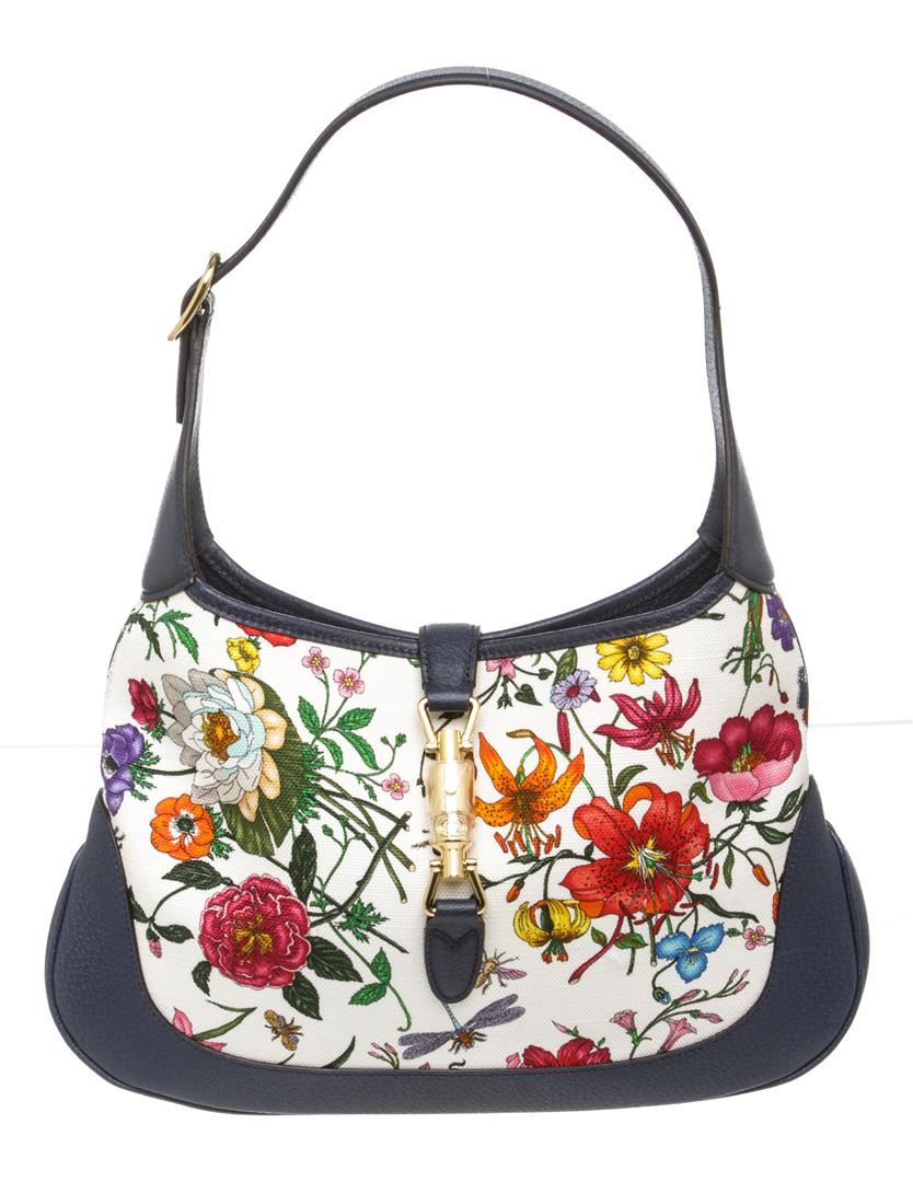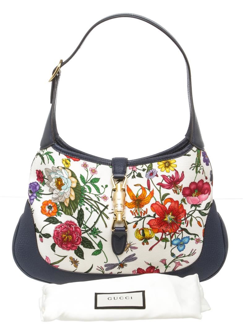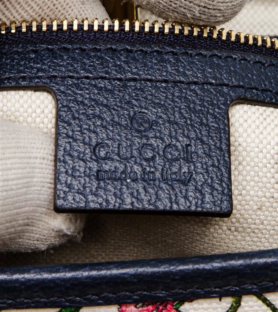Debuting in the Cruise 2019 collection, this Gucci handbag is crafted out of floral and insect multi-color canvas, dark blue pebbled leather trim, and gold-tone hardware. Inner beige canvas lining, dual slip pockets, and one zip pocket at interior wall.