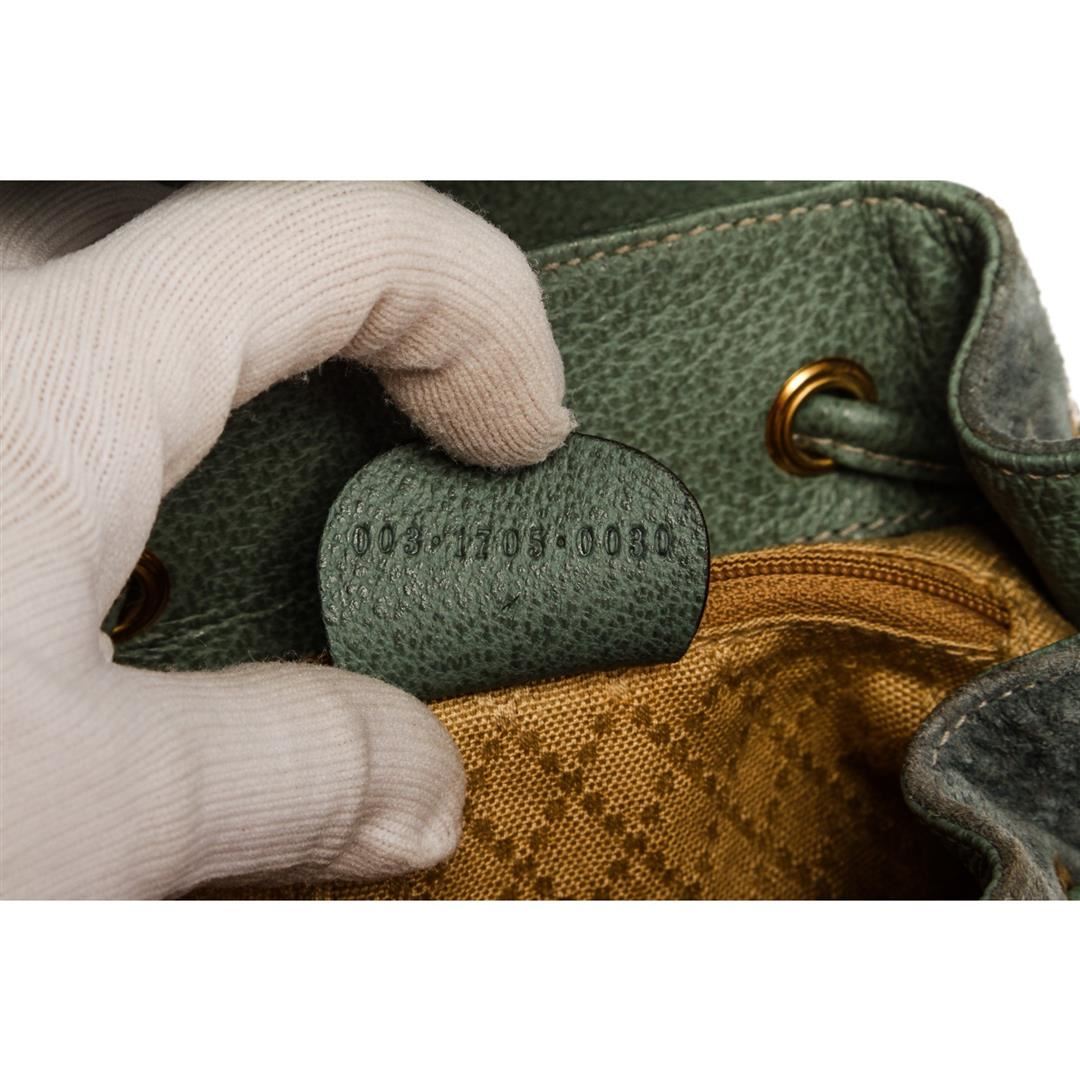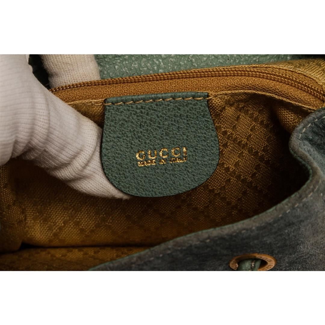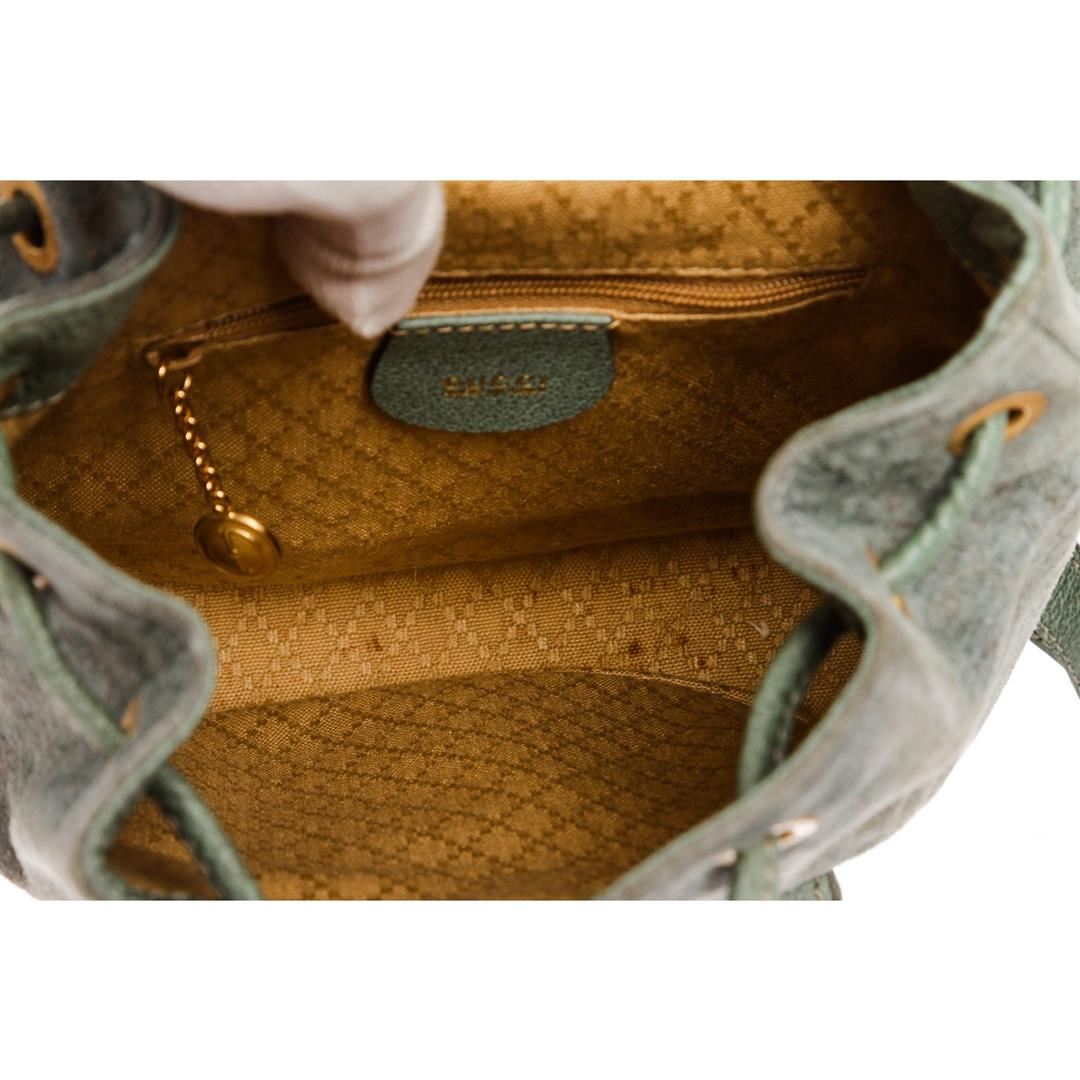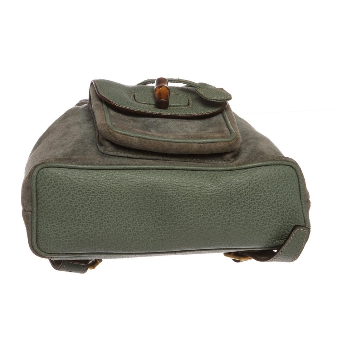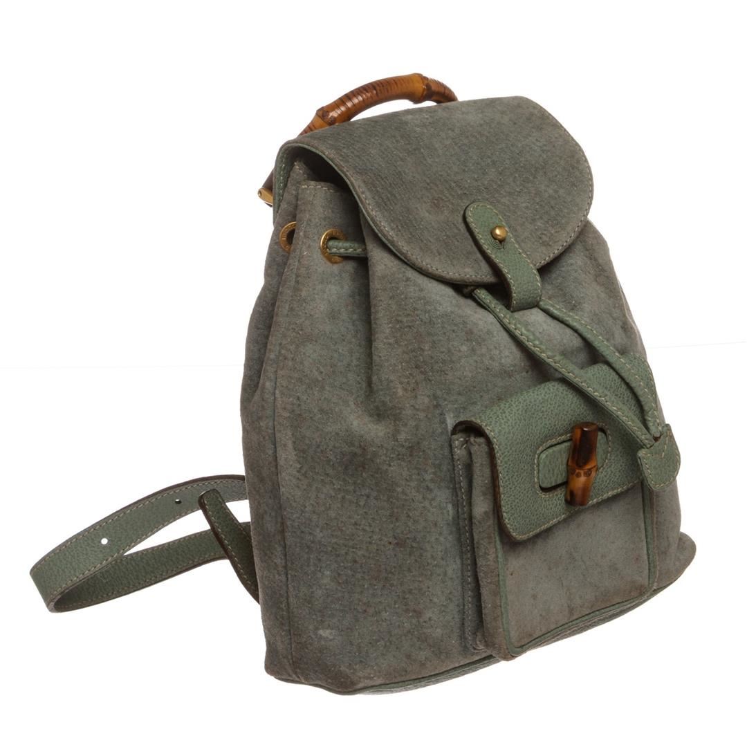Light Blue Green suede Gucci mini backpack with bamboo handle at top, leather shoulder straps, front flap pocket with bamboo turn lock, one interior pocket, gold-tone grommets around opening with drawstring closure and front flap with gold-tone peg closure. Dimensions = 8.25"x2.75"x9.5" Handle Drop:12"/20.9cmx6.9cmx24.1cm Handle Drop:30.4. Item is pre-owned.