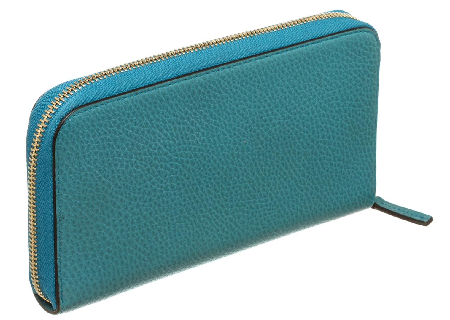 One Gucci Blue Leather Zip-Around Wallet. Blue leather Gucci zip wallet with gold-tone hardware, logo placard at front corner, tonal leather lining, twelve card slots at interior walls, three interior compartments; one with zip closure and zip-around closure at perimeter. MKX