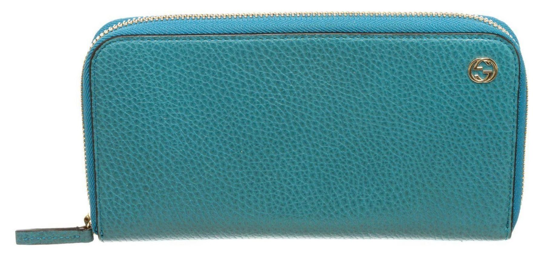 Blue leather Gucci zip wallet with gold-tone hardware, logo placard at front corner, tonal leather lining, twelve card slots at interior walls, three interior compartments; one with zip closure and zip-around closure at perimeter. Measurements:6.25"x1.25"x4" Length: 6.25 in / 16 cm Width: 1.25 in / 3 cm 4 in / 10 cmCONDITION: Pre-Owned Good condition overall. Please refer to photography.