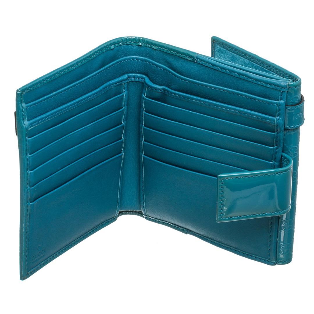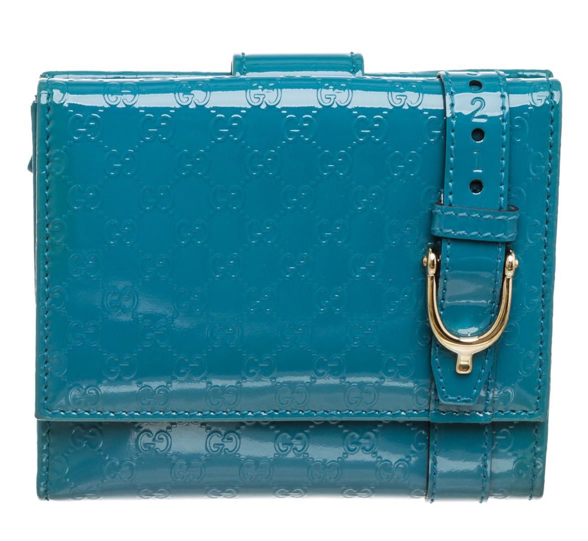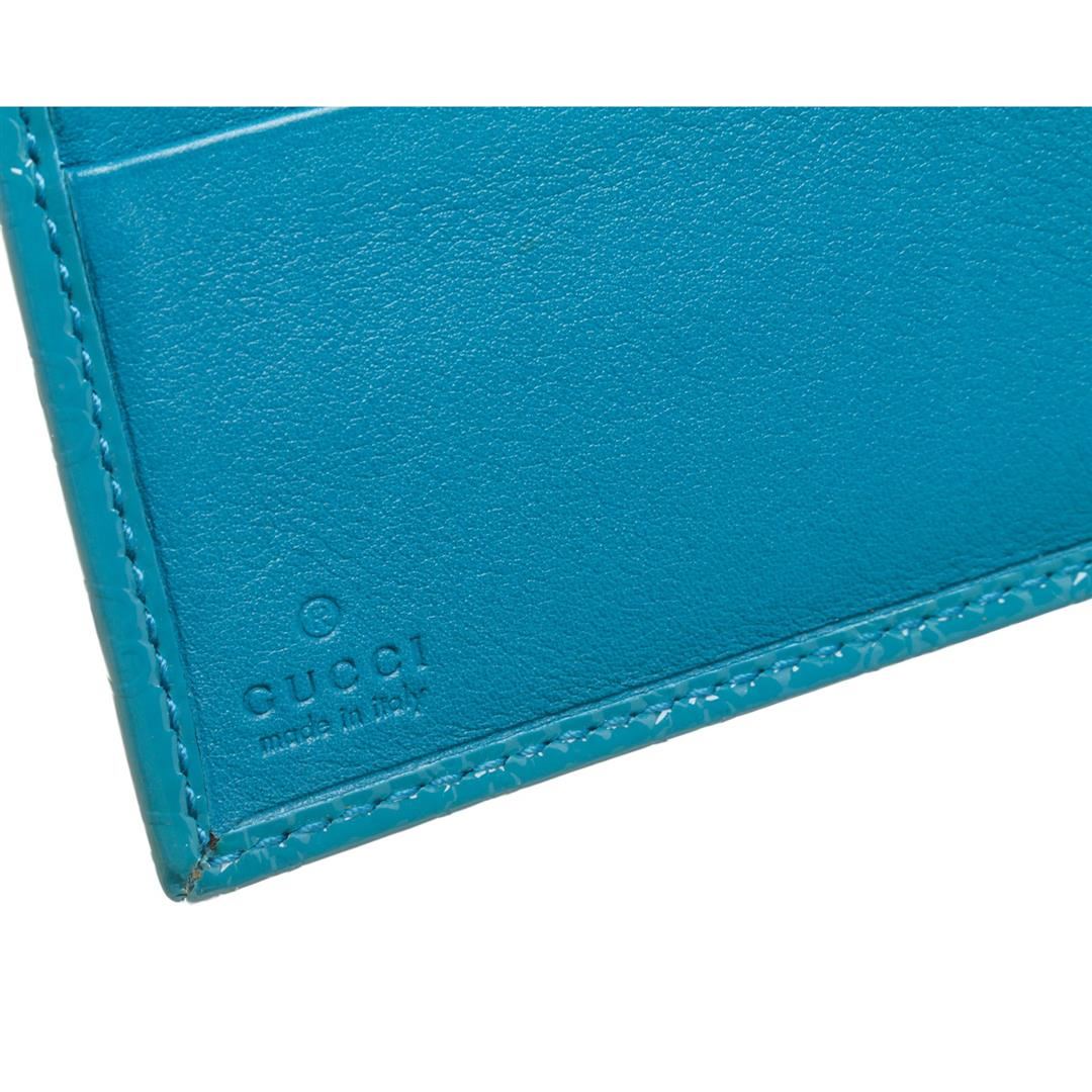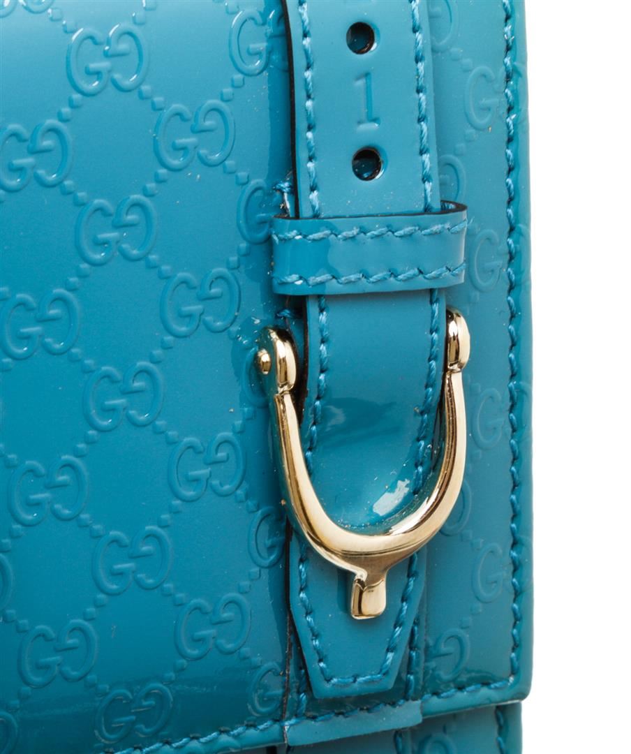 Crafted out of blue microguccissima patent leather, gold-tone hardware, and snap closure front flap. Authentic.