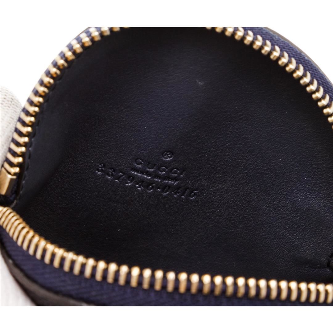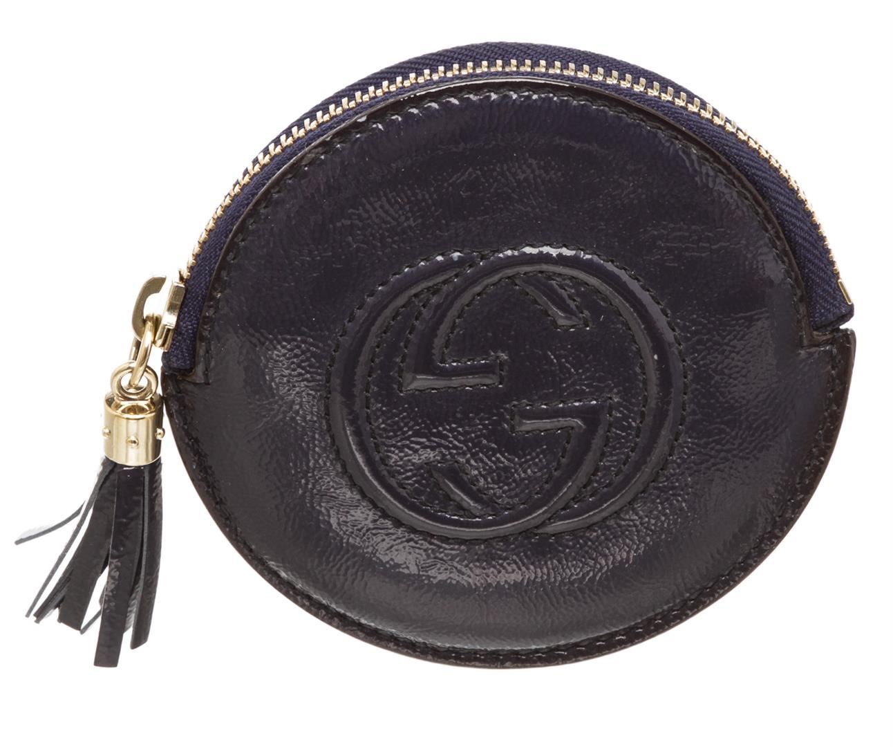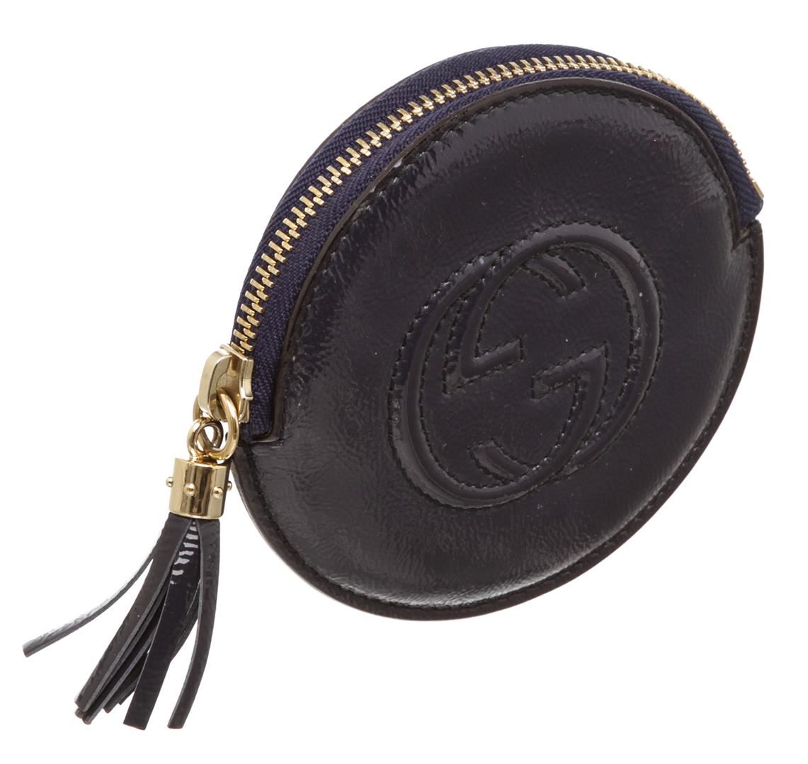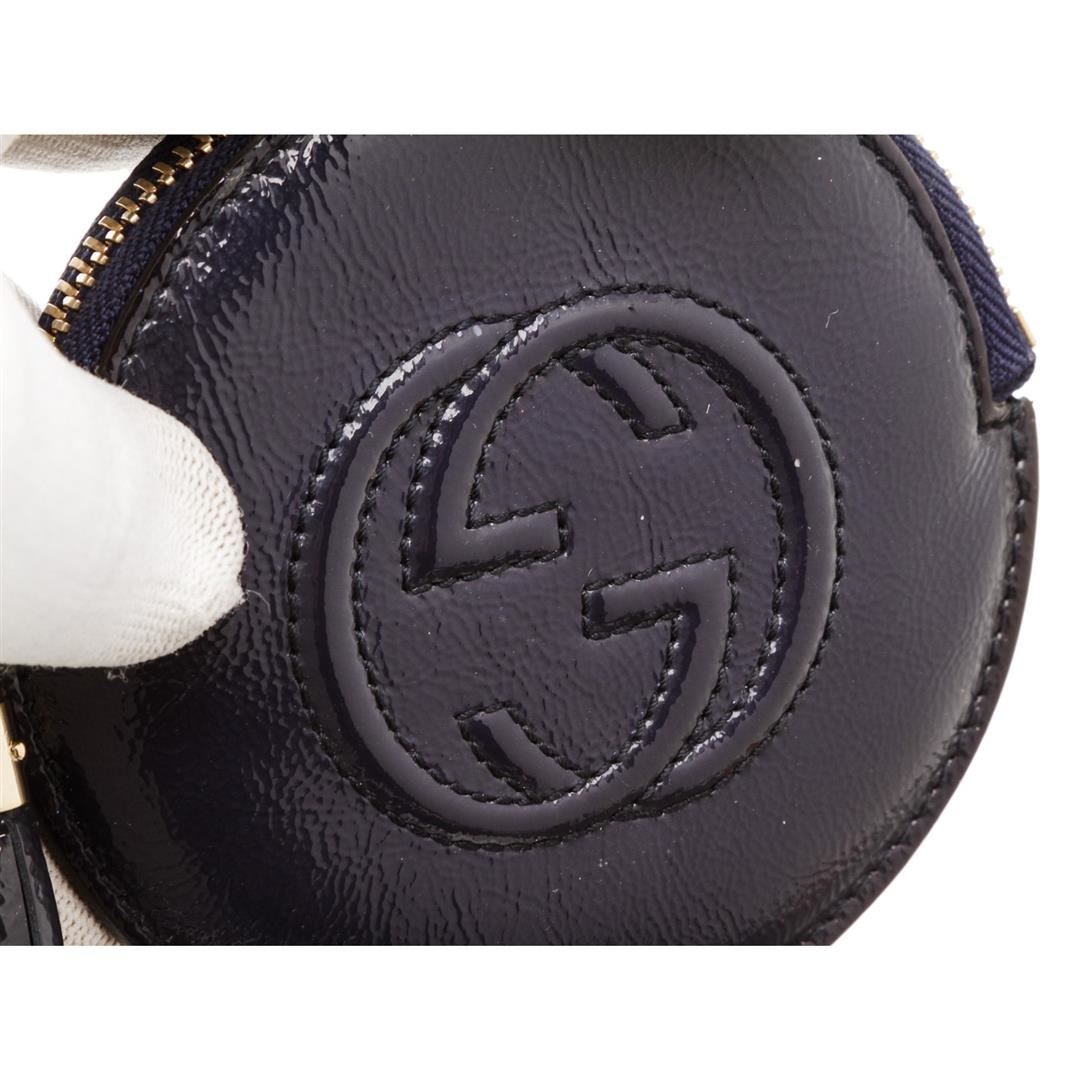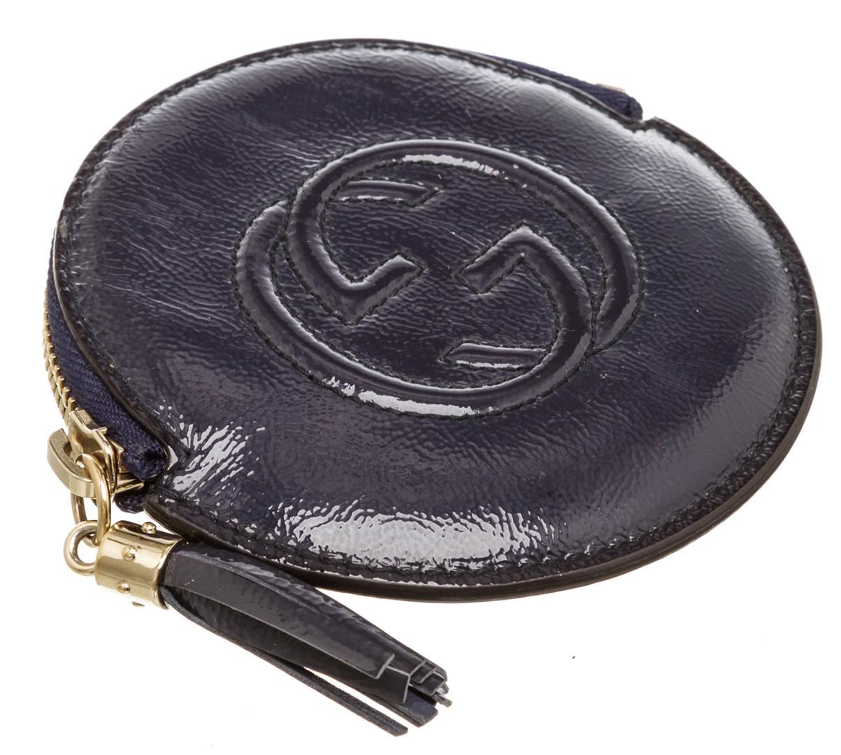 Gucci blue patent leather Soho round coin purse with blue leather lining, gold-tone hardware, and tassel zip closure. Authentic.